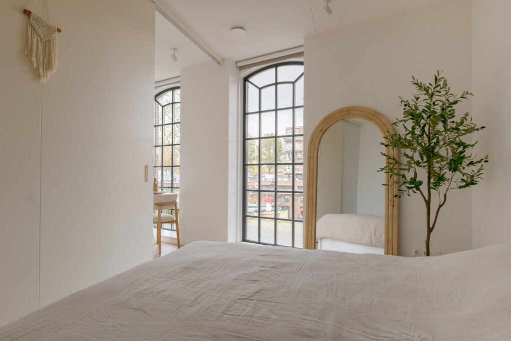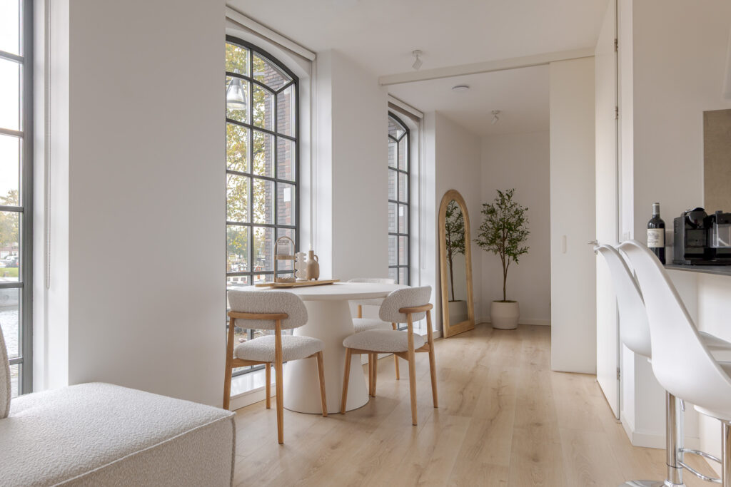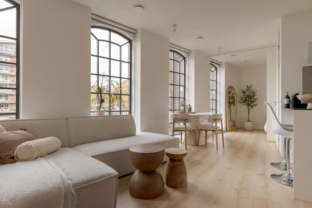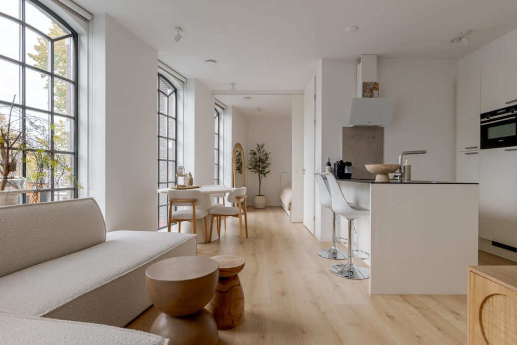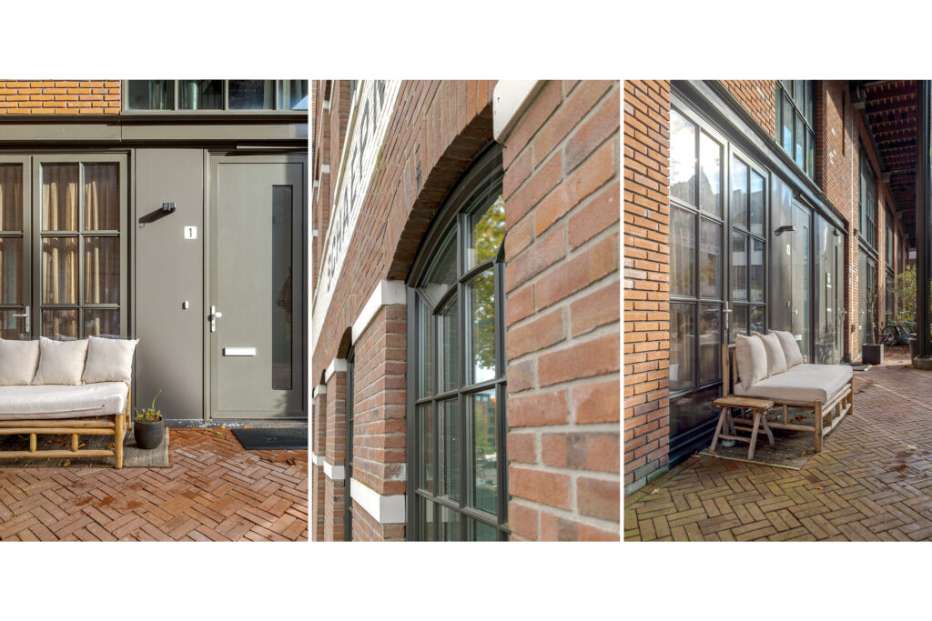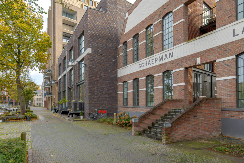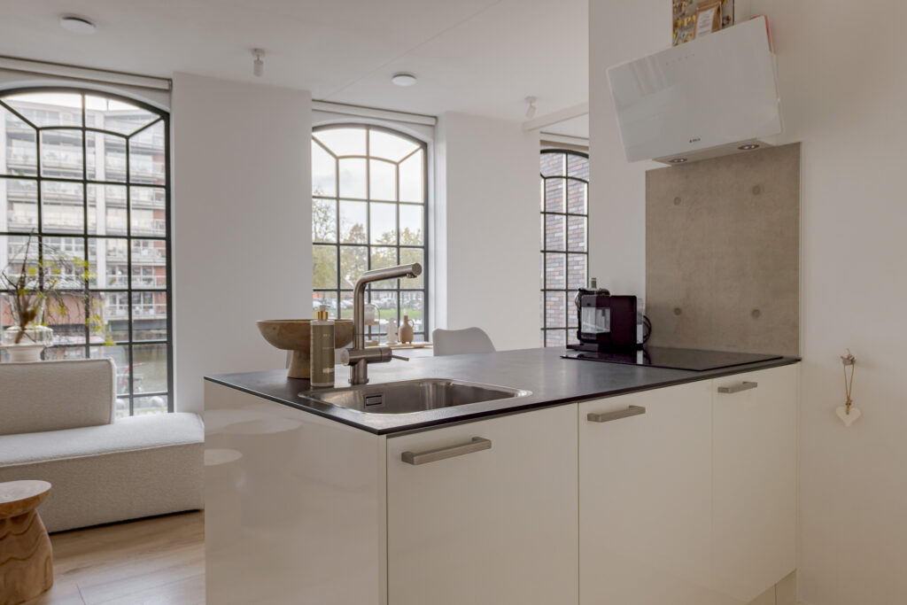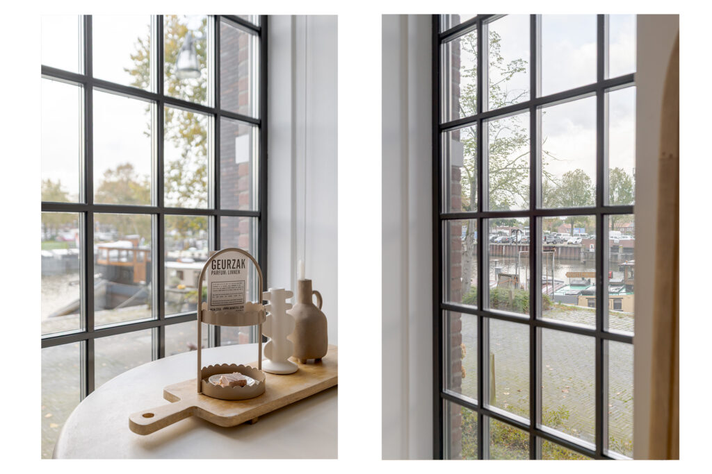 Via je eigen privé-ingang kom je binnen in de praktische hal. Vanuit deze entree betreed je de gezellige leefruimte met indrukwekkend hoge ramen die de rijke geschiedenis van het Schaepmangebouw nieuw leven inblazen. Het licht valt royaal naar binnen, de gracht ligt voor je en de sfeer is meteen voelbaar: industrieel, karaktervol, maar vooral warm en uitnodigend.