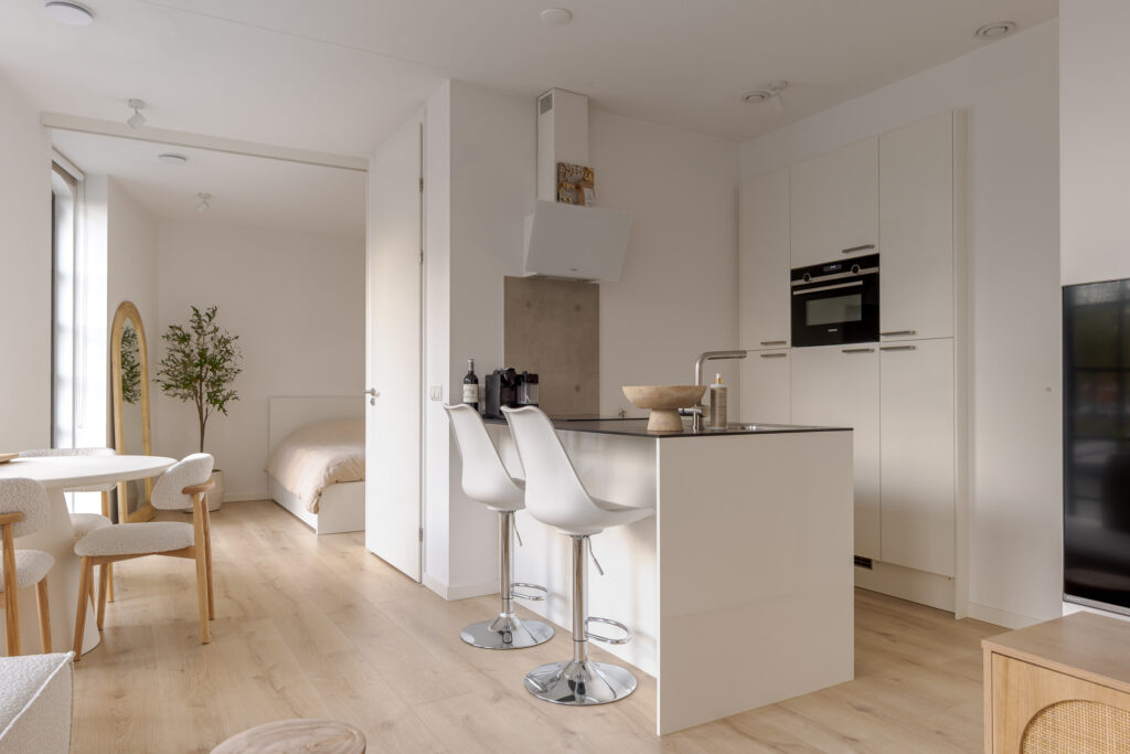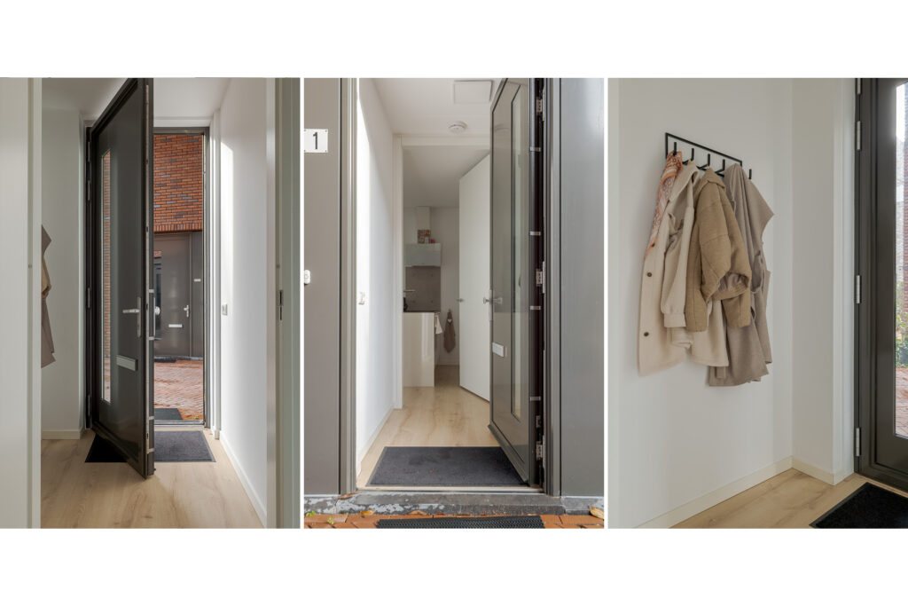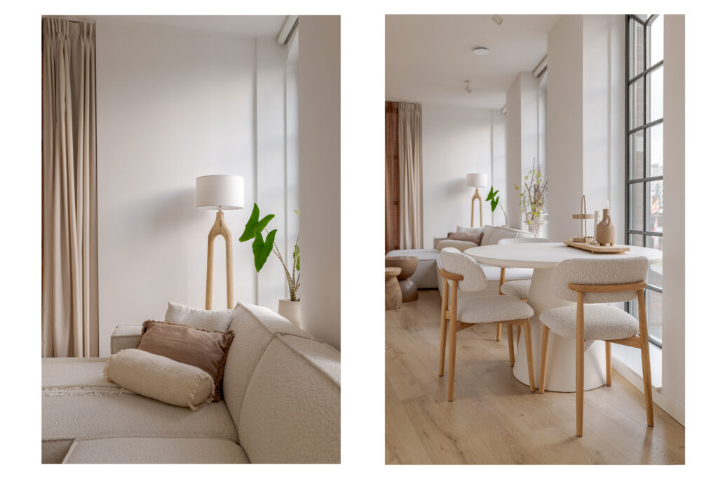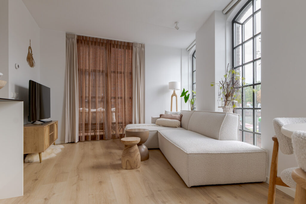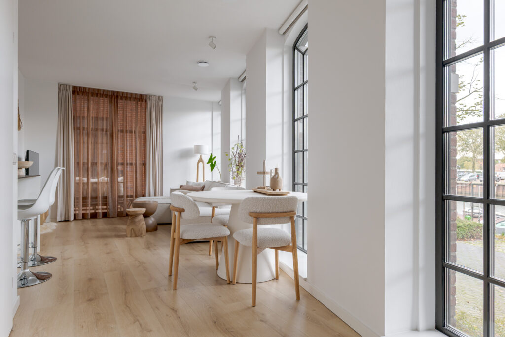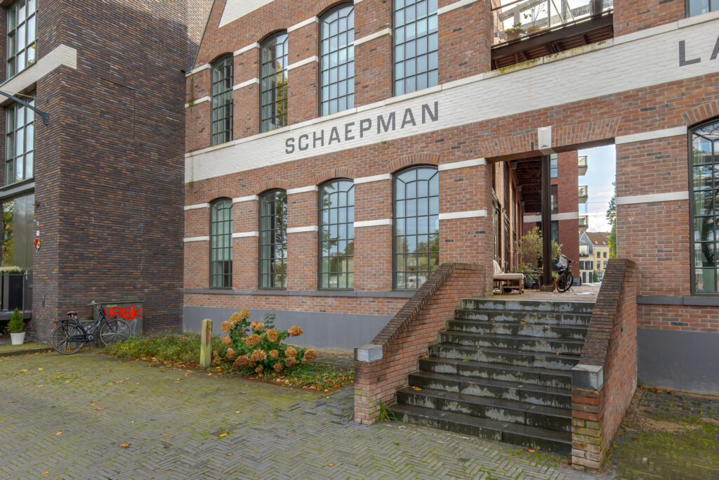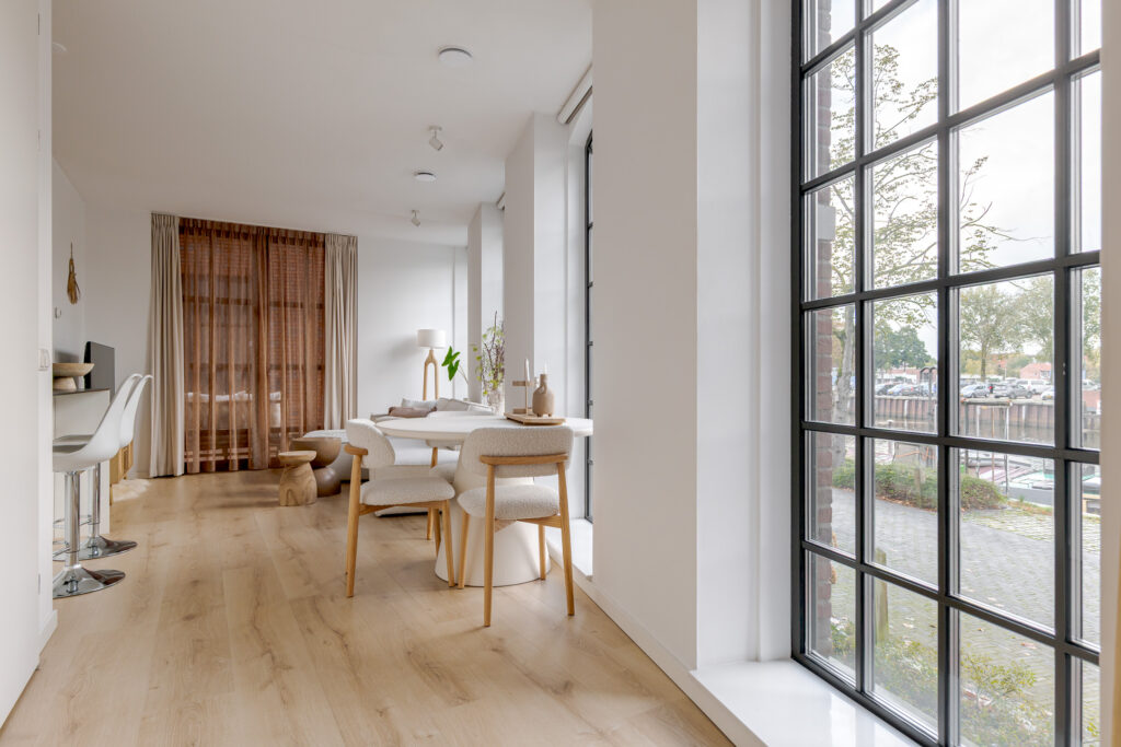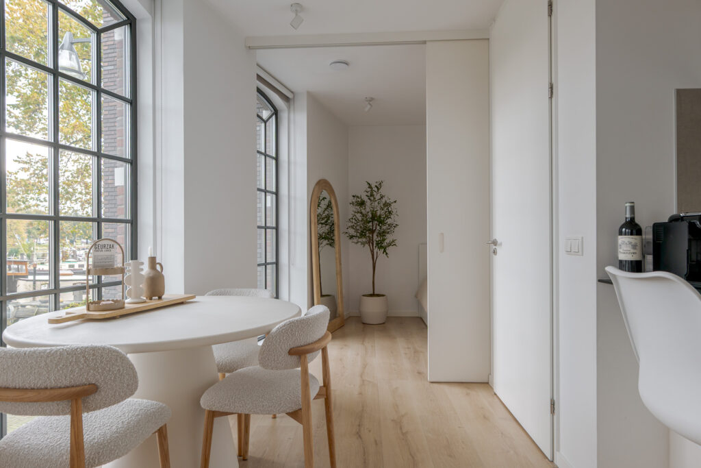 Via je eigen privé-ingang kom je binnen in de praktische hal. Vanuit deze entree betreed je de gezellige leefruimte met indrukwekkend hoge ramen die de rijke geschiedenis van het Schaepmangebouw nieuw leven inblazen. Het licht valt royaal naar binnen, de gracht ligt voor je en de sfeer is meteen voelbaar: industrieel, karaktervol, maar vooral warm en uitnodigend.