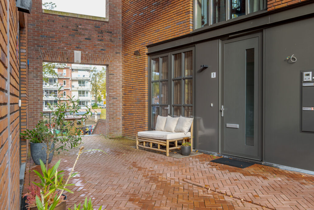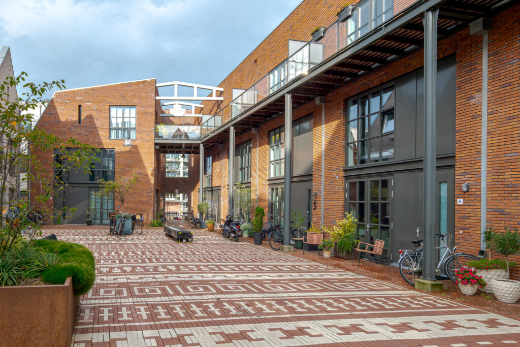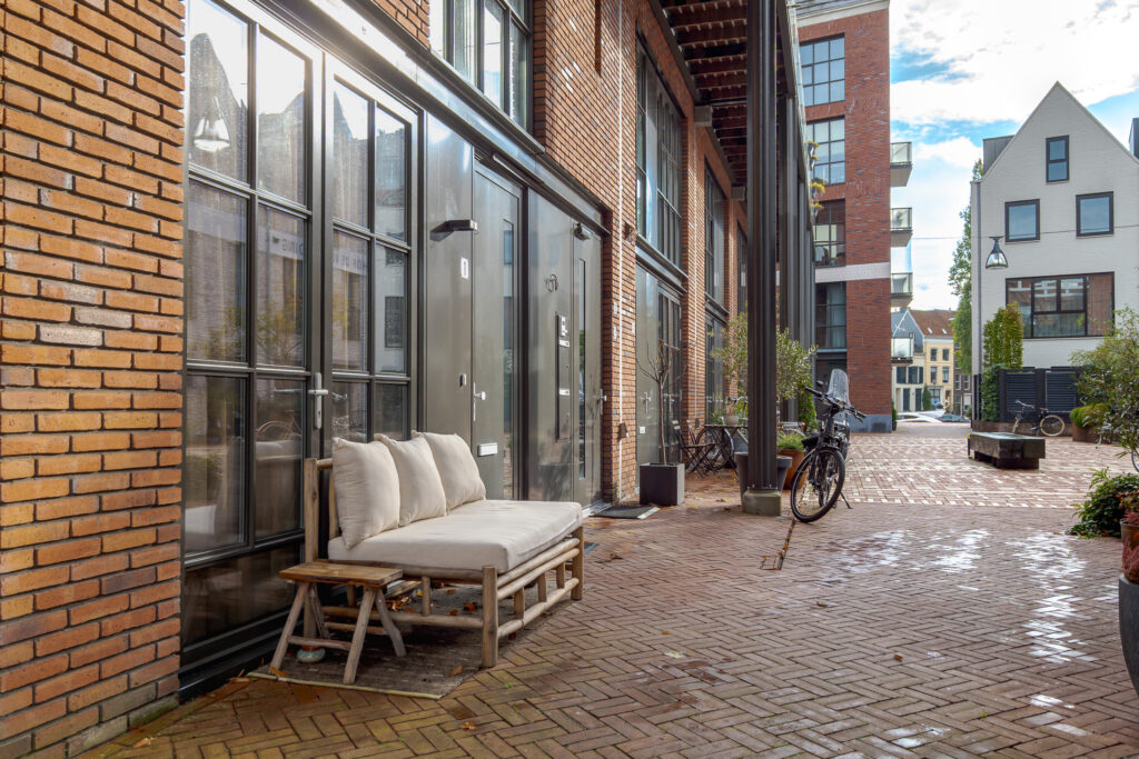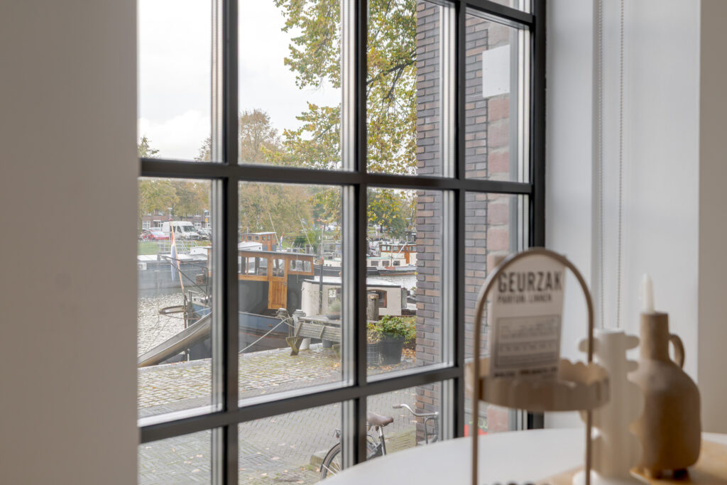 De woonkamer met de industriële grote ramen is sfeervol en licht en beschikt over openslaande deuren naar het gezellige hofje. Hier heb je rust en reuring in balans: aan de ene kant het autoloze plein waar bewoners samenkomen, aan de andere kant de stadsgracht.