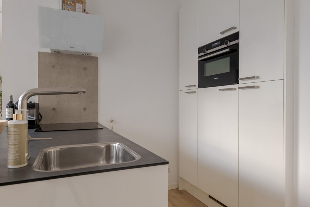 De open keuken is stijlvol afgewerkt en voorzien van moderne inbouwapparatuur. De vloerverwarming zorgt voor een aangename warmte door de gehele woning.