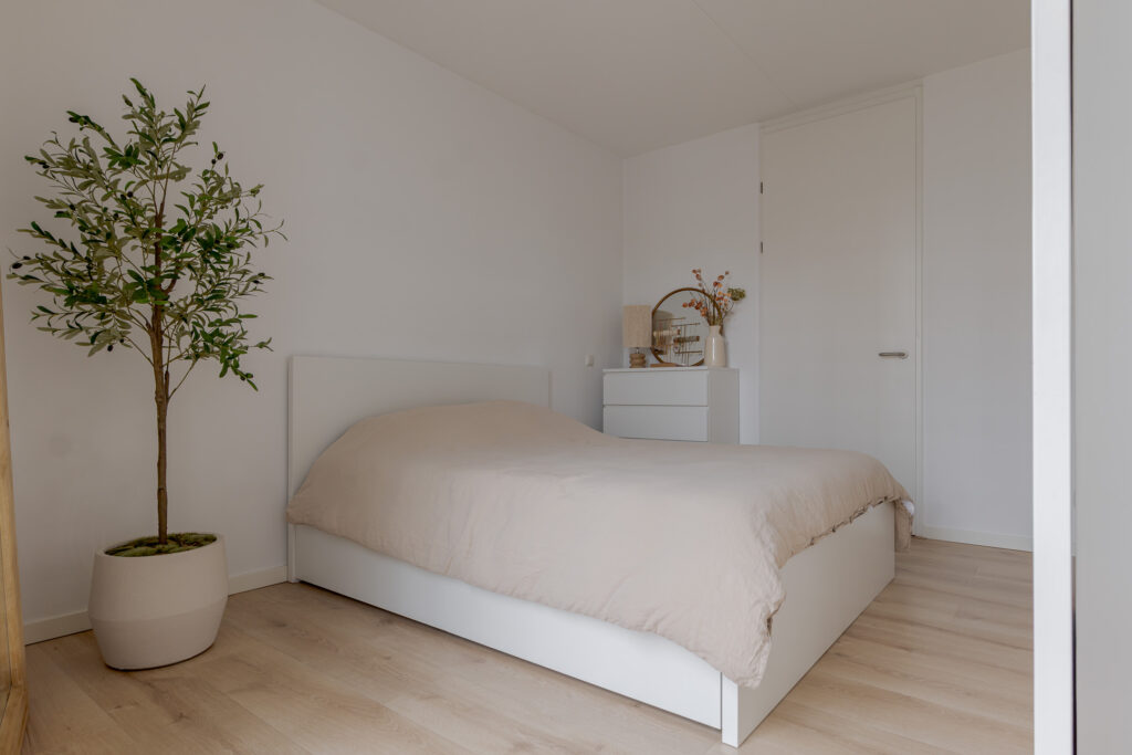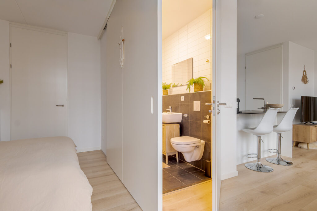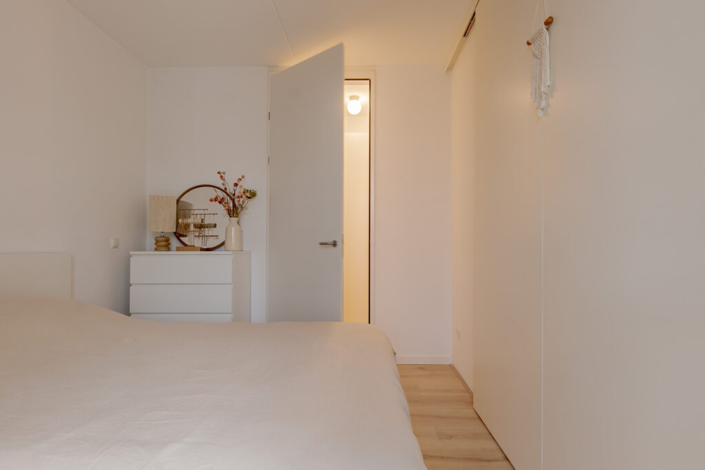 De slaapkamer is bereikbaar via een praktische schuifdeur en wordt daarmee een rustige, afsluitbare ruimte. Perfect voor een goede nachtrust maar ook geschikt als fijne thuiswerkplek.
