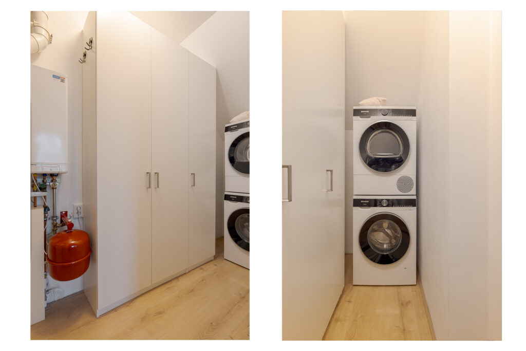 Vanuit de slaapkamer is er directe toegang tot de technische ruimte, nu ingericht als inloopkast. Hier vind je niet alleen de aansluitingen voor wasmachine, droger en de CV-opstelling, maar ook genoeg ruimte voor je garderobe.