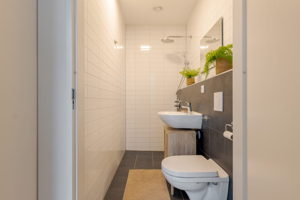 De moderne badkamer is compleet: een strakke inloopdouche, wastafel met spiegel en toilet.