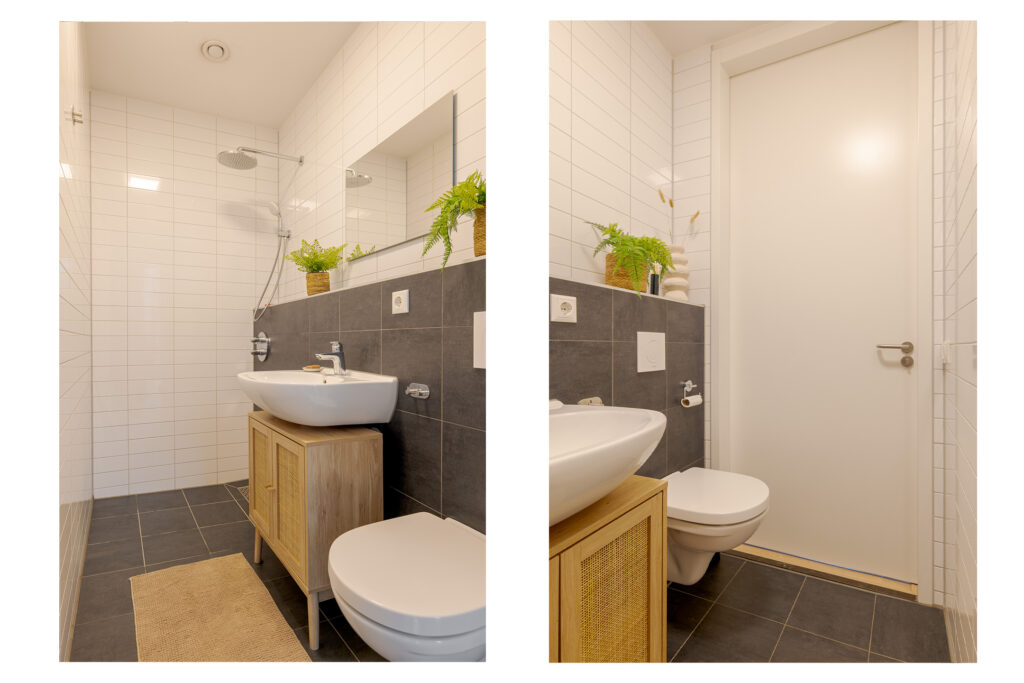 – moderne badkamer met douche, toilet en wastafelmeubel;