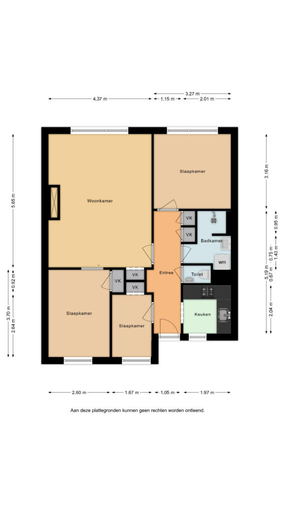 Het appartement beschikt over drie slaapkamers, die flexibel in te delen zijn als slaap-, werk- of hobbyruimte. De badkamer heeft een wastafel en douche en hier bevindt zich tevens de wasmachineaansluiting. Het toilet is bereikbaar via de hal waar meerdere vaste kasten voor praktische bergruimte zorgen.