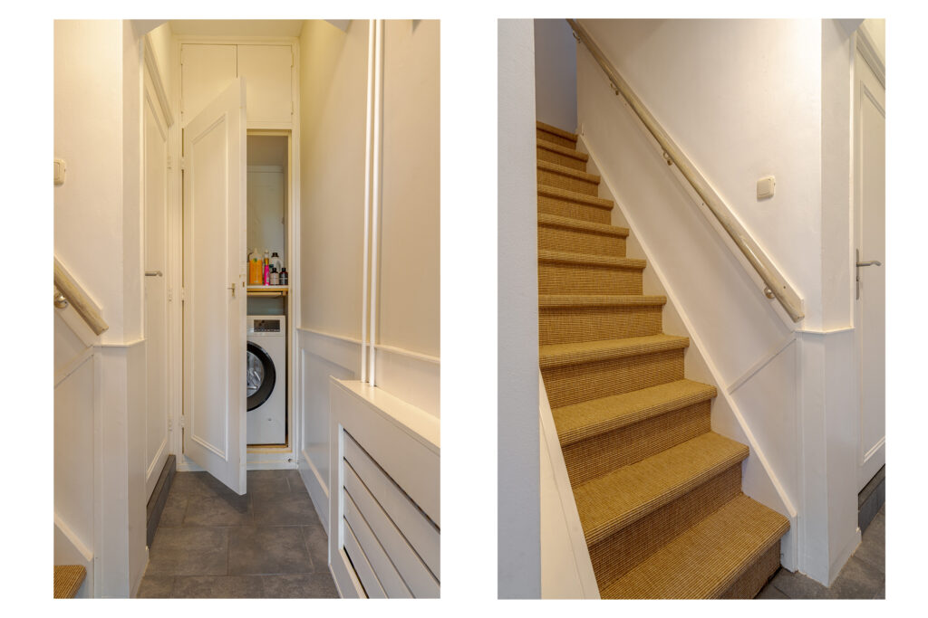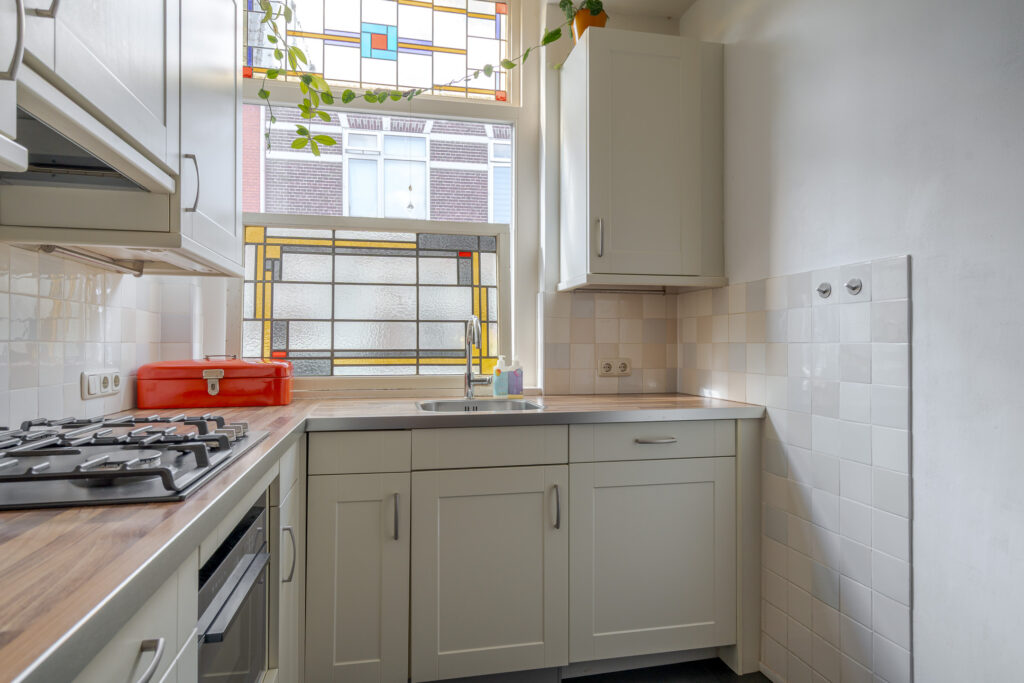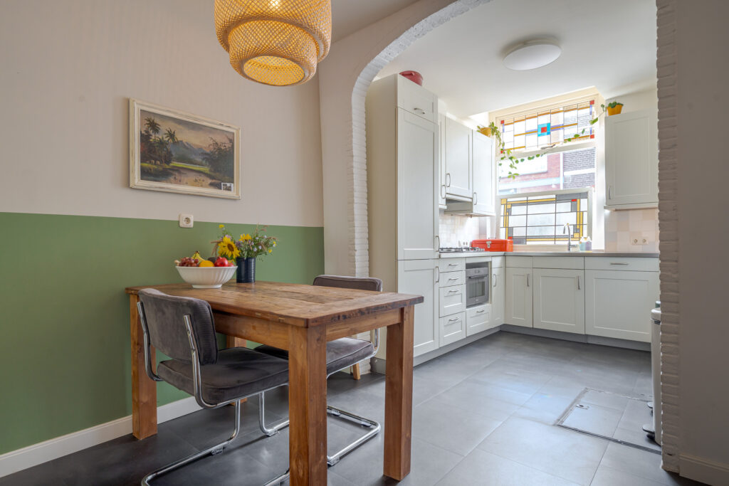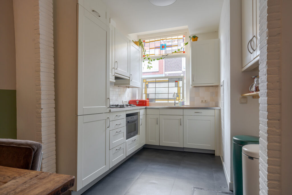 De woning zelf is ruimer dan verwacht! Dit komt door de prettige breedte aan de achterzijde. De woning straalt warmte uit en combineert authentieke details waaronder het glas-in-lood, met modern wooncomfort. Via de hal met meterkast, heeft u toegang tot de woonkeuken. Deze is aan de voorzijde van de woning gesitueerd en beschikt over diverse inbouwapparatuur. Middels een doorloop komt u in de achterzijde van de woning, hier zorgt de breedte van de woning voor een ruim zitgedeelte met toegang tot de tuin. Dankzij de brede ramen en openslaande deuren geniet u hier van een fijne lichtinval. Via de tussenhal heeft u toegang tot de trapopgang, het toilet en een praktische wasruimte.