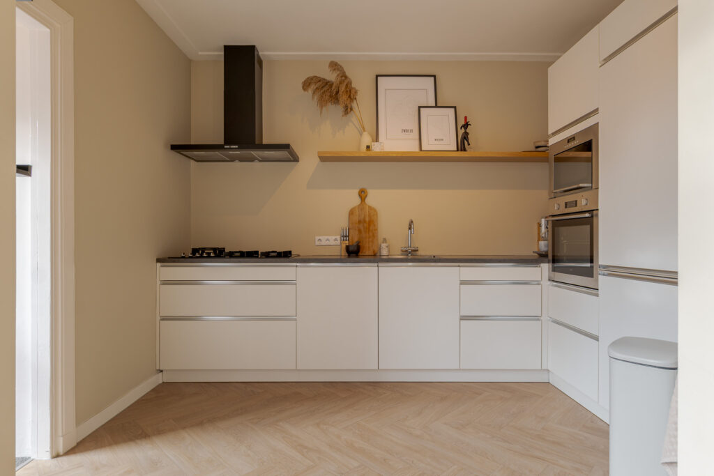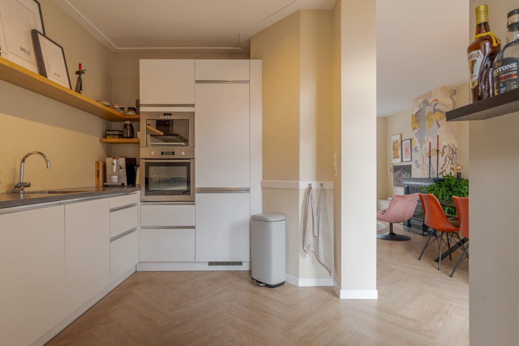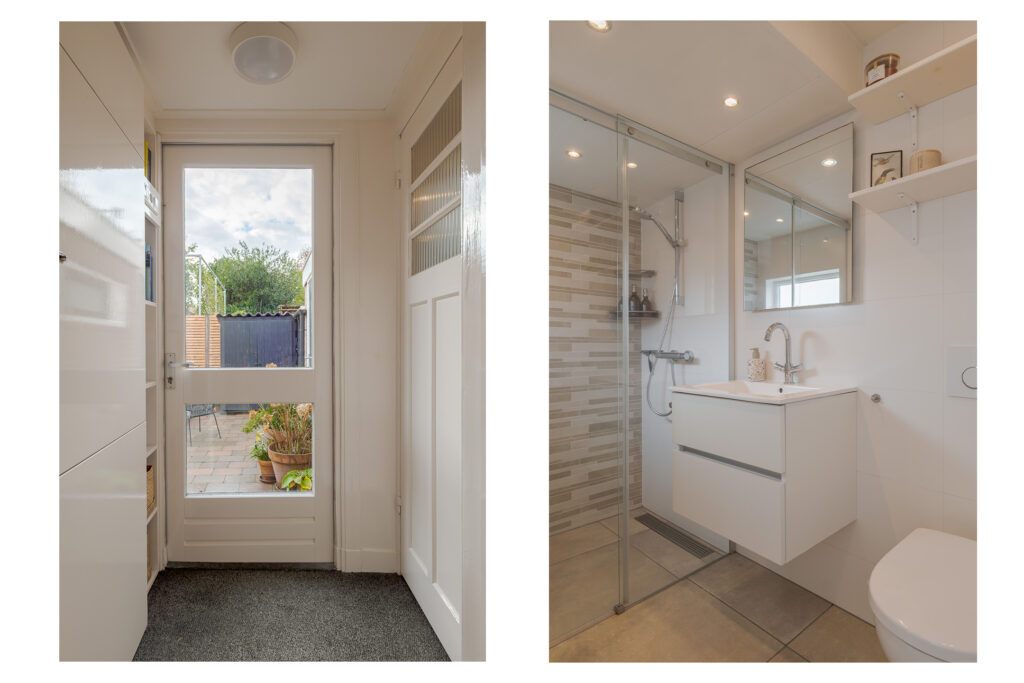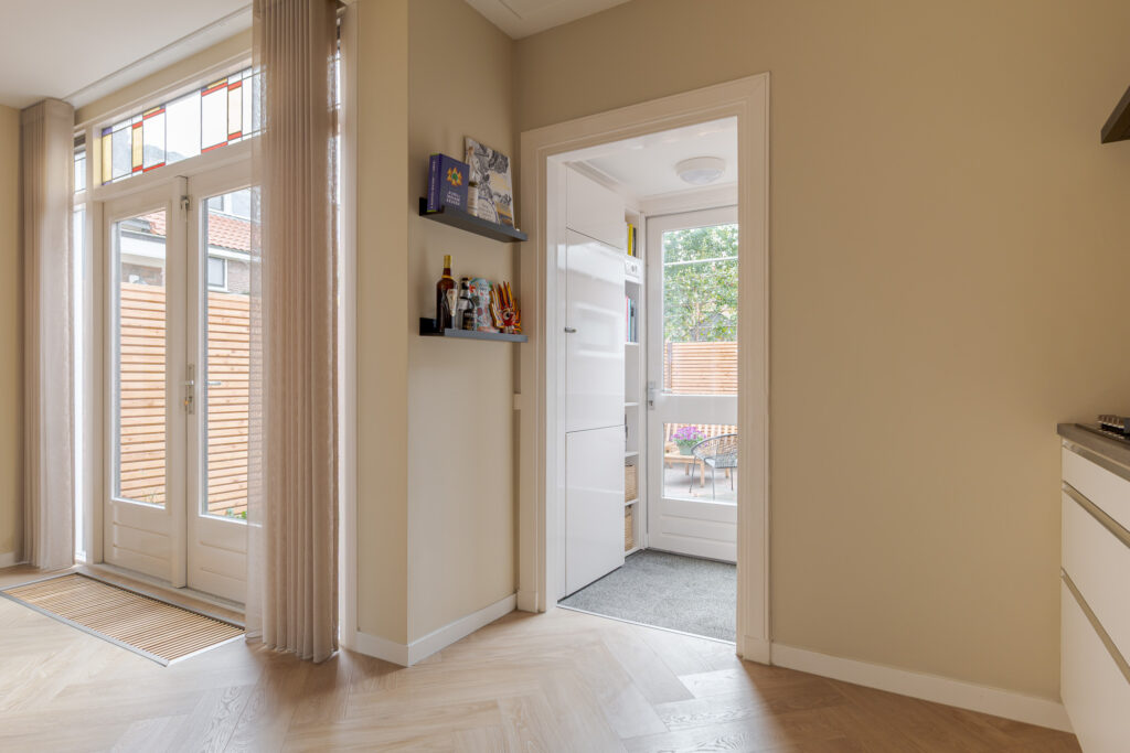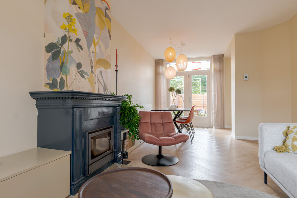Bij binnenkomst valt direct de warme sfeer van de woning op. De hal met praktische bergkast leidt naar de lichte en ruimtelijke woonkamer, waar een fraai visgraatpatroon in de vloer en grote ramen zorgen voor een uitnodigende uitstraling. De zithoek met haard aan de voorzijde voelt knus aan, terwijl de eethoek aan de tuinzijde prachtig profiteert van het daglicht via dubbele openslaande deuren. De moderne open keuken is uitgevoerd in een L-opstelling en uitgerust met strakke witte fronten, een zwart werkblad en inbouwapparatuur zoals een oven, magnetron, gaskookplaat en vaatwasser. De aangrenzende hal geeft toegang tot de CV-kast en de badkamer, die voorzien is van een inloopdouche met glazen wand, een wastafelmeubel en een toilet.