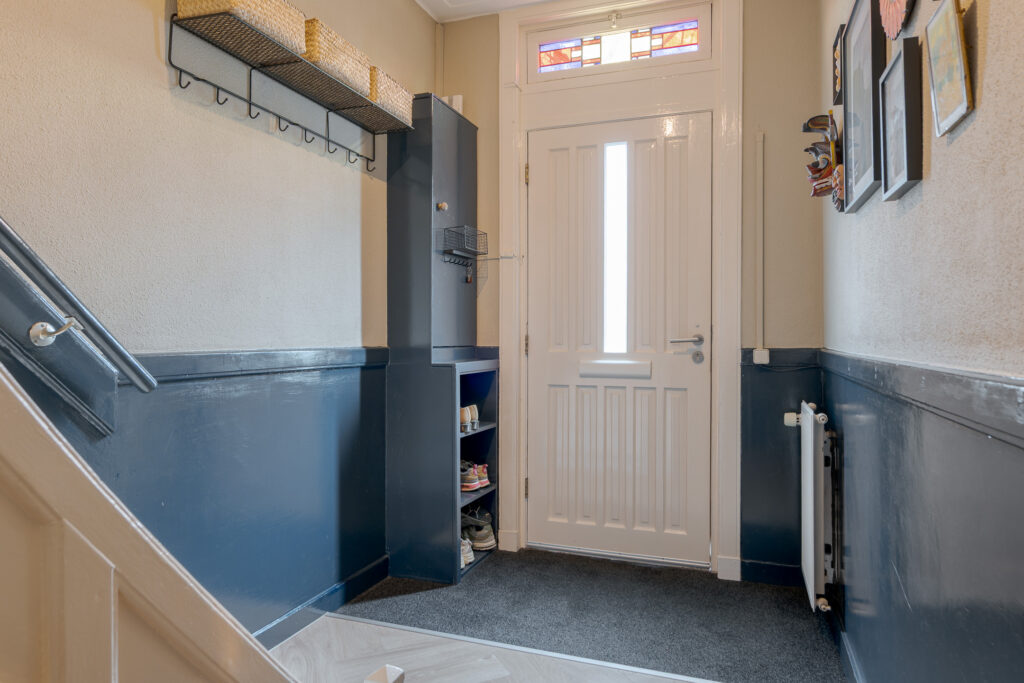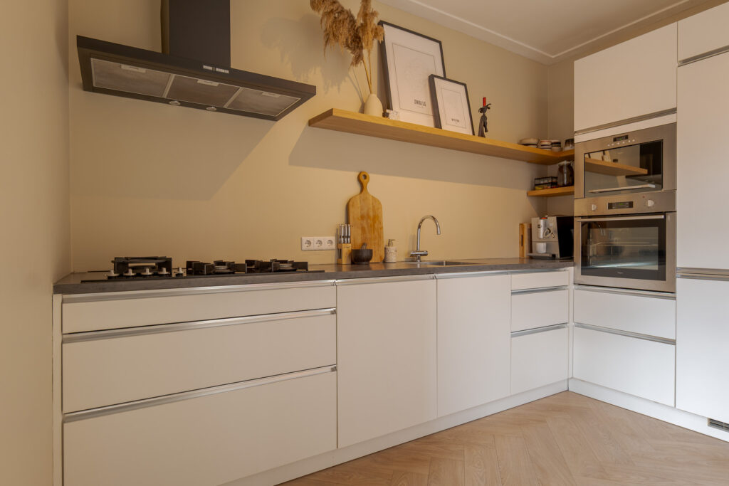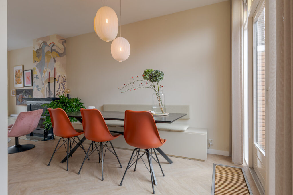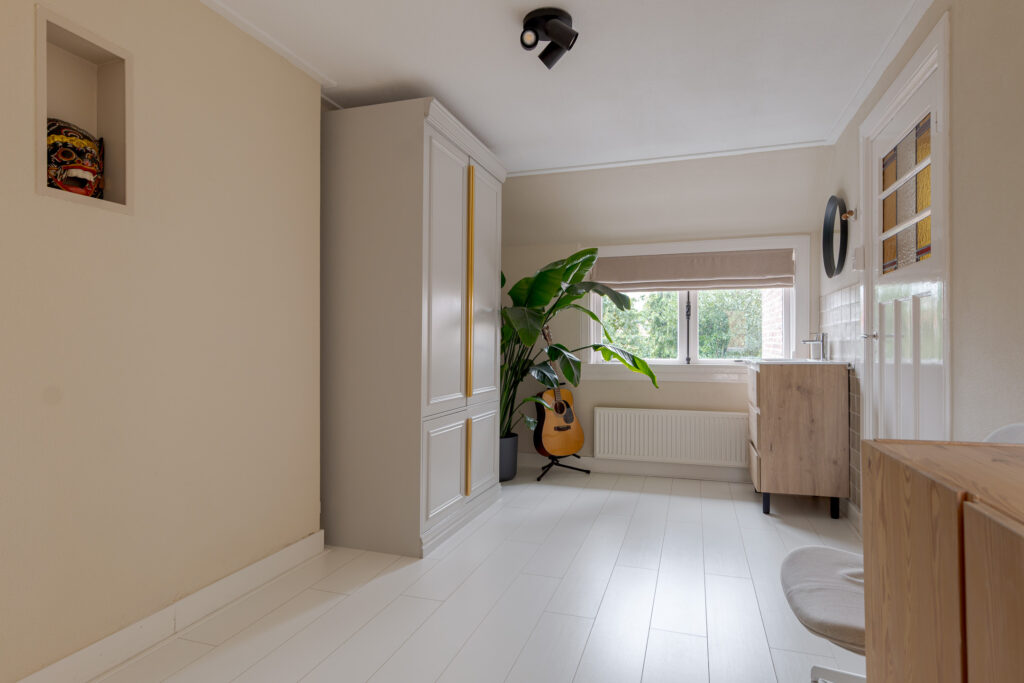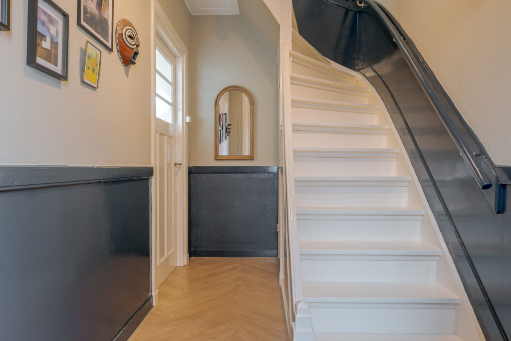 Bij binnenkomst valt direct de warme sfeer van de woning op. De hal met praktische bergkast leidt naar de lichte en ruimtelijke woonkamer, waar een fraai visgraatpatroon in de vloer en grote ramen zorgen voor een uitnodigende uitstraling. De zithoek met haard aan de voorzijde voelt knus aan, terwijl de eethoek aan de tuinzijde prachtig profiteert van het daglicht via dubbele openslaande deuren. De moderne open keuken is uitgevoerd in een L-opstelling en uitgerust met strakke witte fronten, een zwart werkblad en inbouwapparatuur zoals een oven, magnetron, gaskookplaat en vaatwasser. De aangrenzende hal geeft toegang tot de CV-kast en de badkamer, die voorzien is van een inloopdouche met glazen wand, een wastafelmeubel en een toilet.