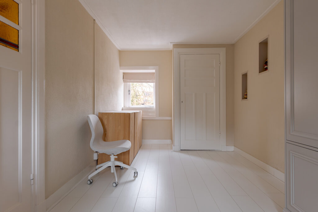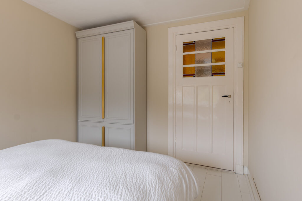 Op de eerste verdieping bevinden zich drie slaapkamers. De grootste slaapkamer aan de achterzijde beschikt over een vaste kast en eigen wastafel. De kamer aan de voorzijde biedt eveneens veel ruimte en natuurlijk licht en beschikt over een comfortabele airco. Ook de derde kamer is goed bruikbaar als slaap- of werkkamer. Vanaf de overloop is er toegang tot alle vertrekken, tevens is er van hieruit toegang tot de praktische bergzolder.