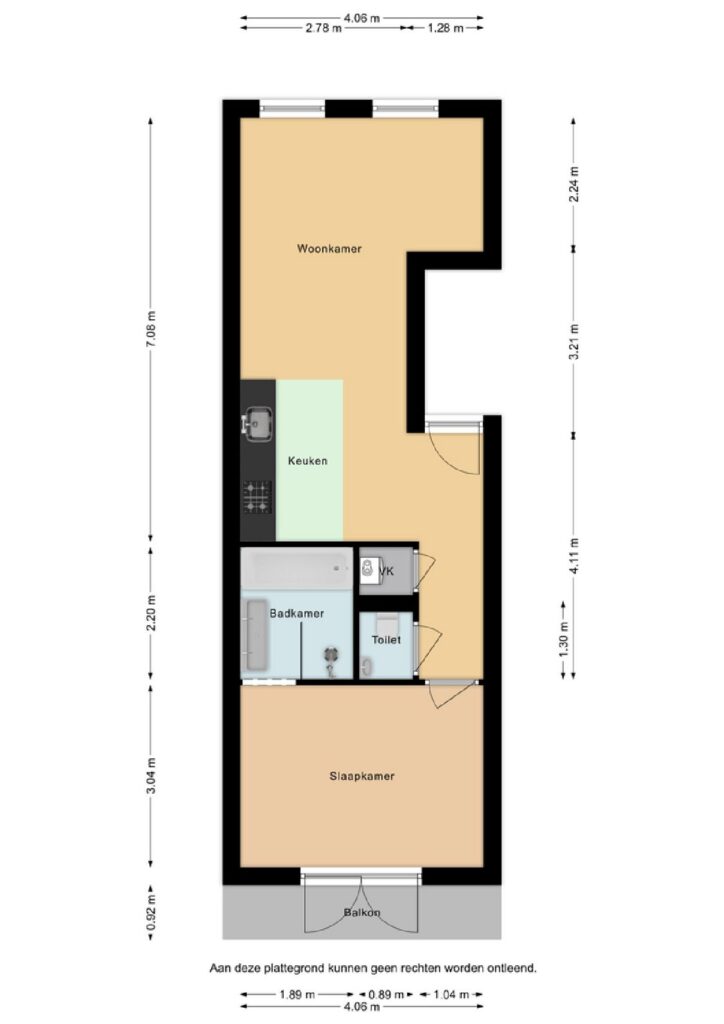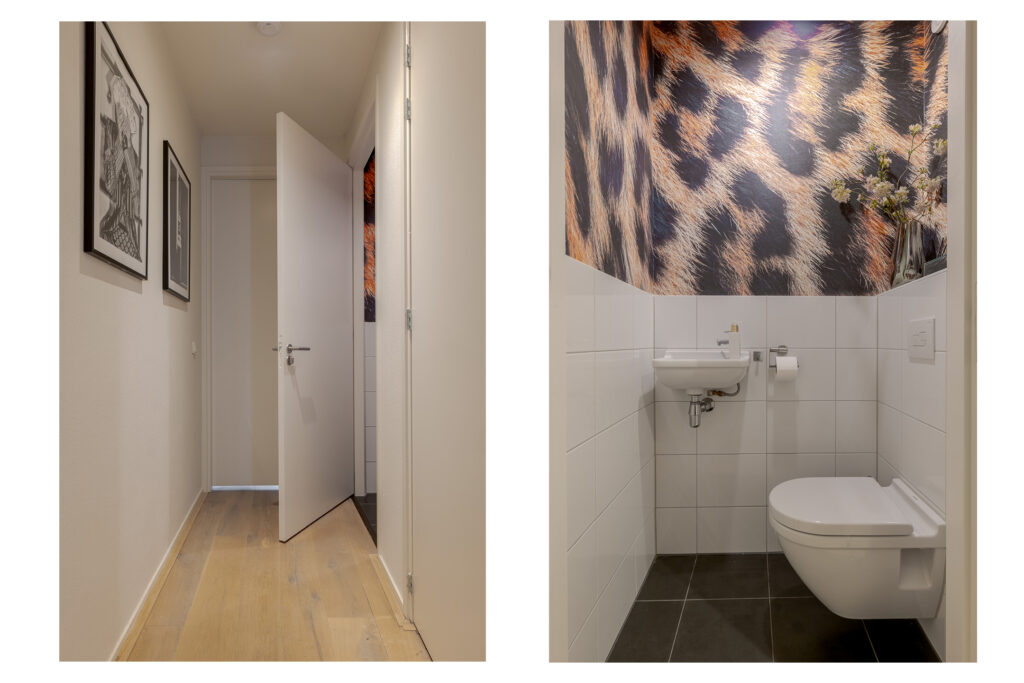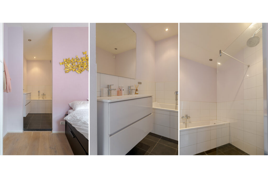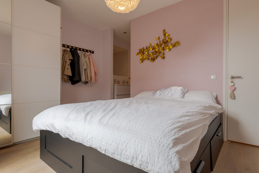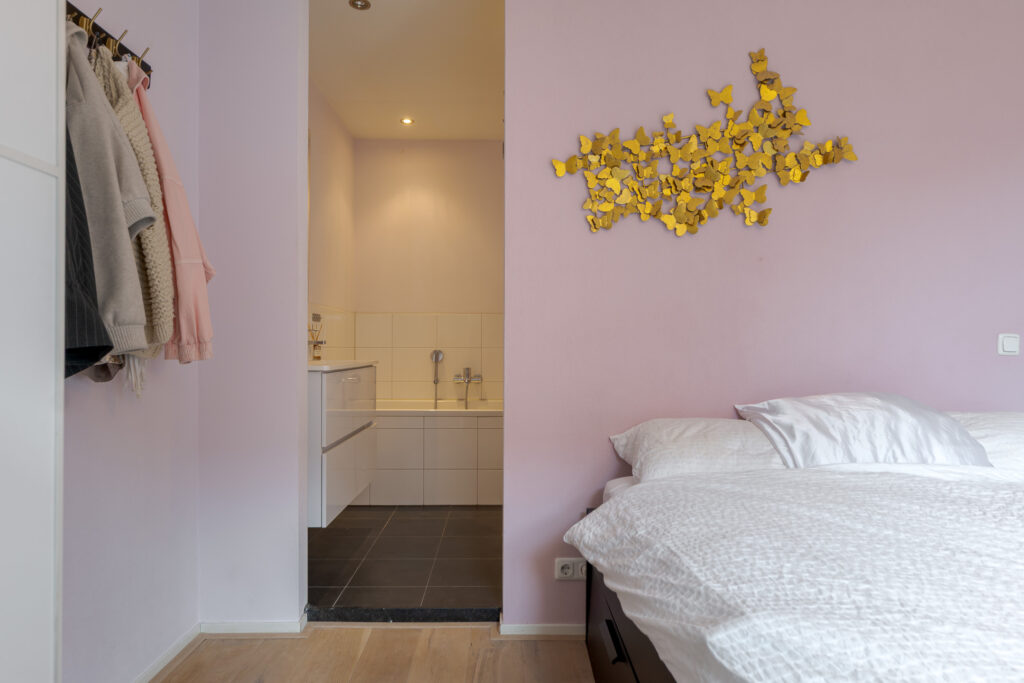 De slaapkamer is praktisch van formaat en grenst direct aan de moderne badkamer, uitgerust met een ligbad, aparte douche en dubbele wastafel. De indeling is efficiënt en stijlvol uitgevoerd, waardoor de ruimte optimaal wordt benut. Daarnaast beschikt het appartement over een aparte toiletruimte en een bergkast met wasmachineaansluiting, wat het wooncomfort compleet maakt.