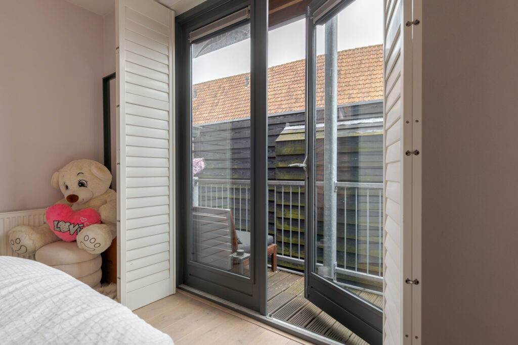 Het balkon mét uitzicht op de Peperbus, biedt een rustige buitenplek midden in de stad. Een fijne plek om te genieten van de frisse lucht en de dynamiek van de omgeving op afstand te ervaren.