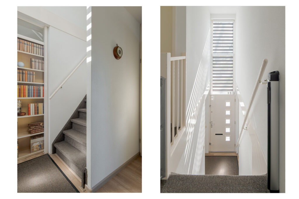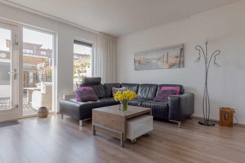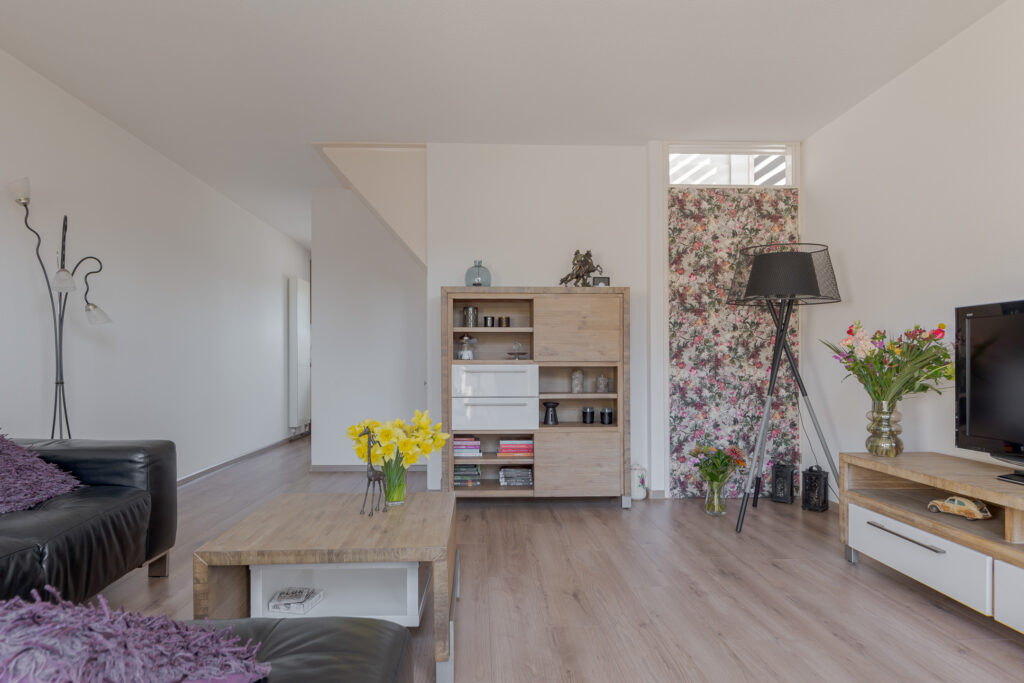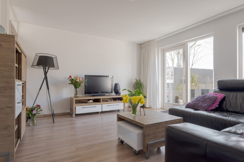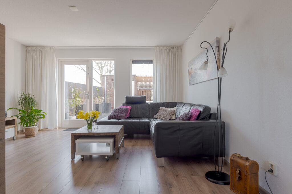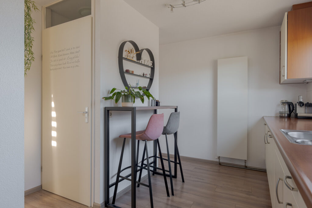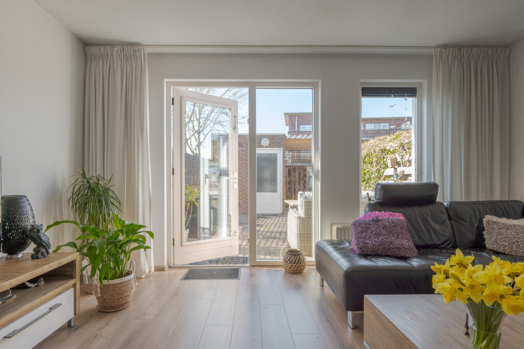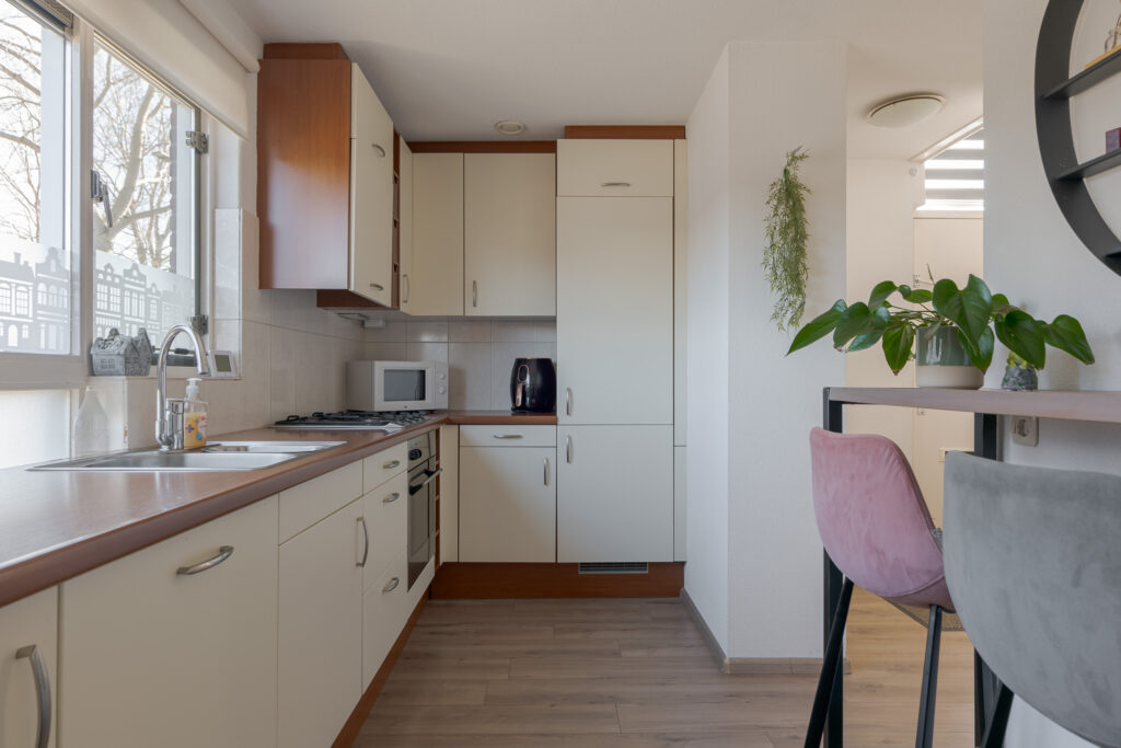 Bij binnenkomst via de entree treft u de meterkast en een separaat toilet. De keuken is aan de voorzijde van de woning gesitueerd en is netjes onderhouden. Deze is onder andere voorzien van een Siemens vaatwasser uit 2020, een 4-pits gasplaat, koel-vriescombinatie en een oven. Dankzij het grote raam heeft u hier een prettige, lichte kookruimte. De woonkamer met gezellige zithoek staat in directe verbinding met de achtertuin. De grote ramen en tuindeur zorgen voor veel daglicht, wat de ruimte extra uitnodigend maakt. Daarnaast is er vanuit de woonkamer toegang tot een handige trapkast voor extra opbergruimte.