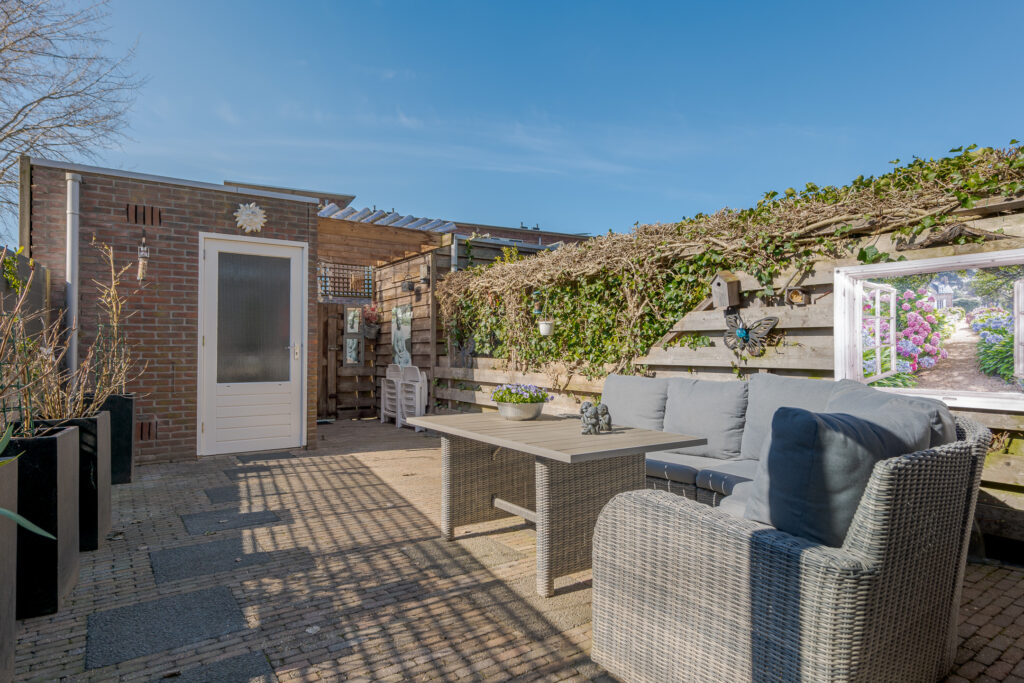 De achtertuin, gelegen op het westen, biedt een heerlijke plek om tot in de avond van de zon te genieten. De tuin is onderhoudsvriendelijk aangelegd en beschikt over een vrijstaande stenen berging en een achterom.