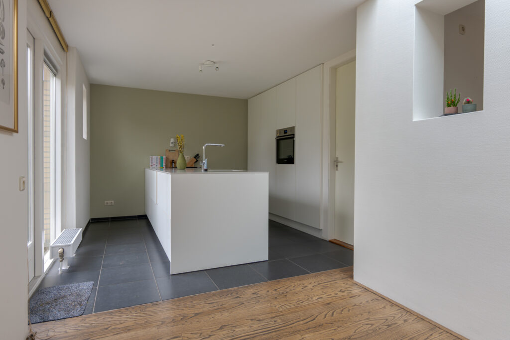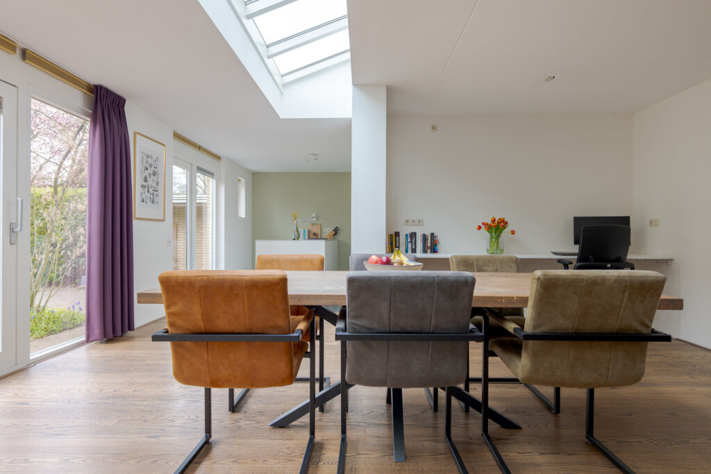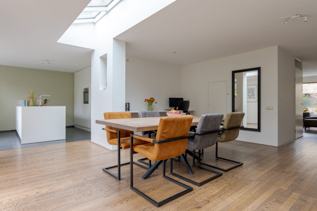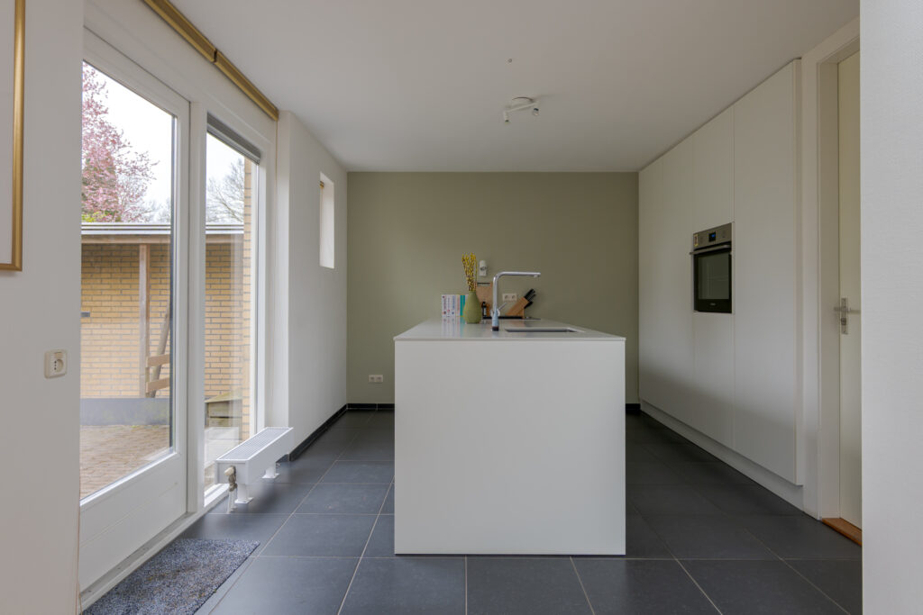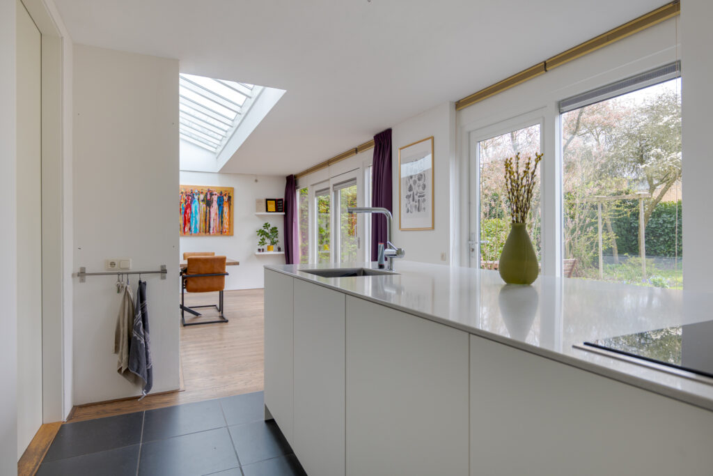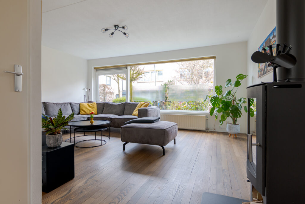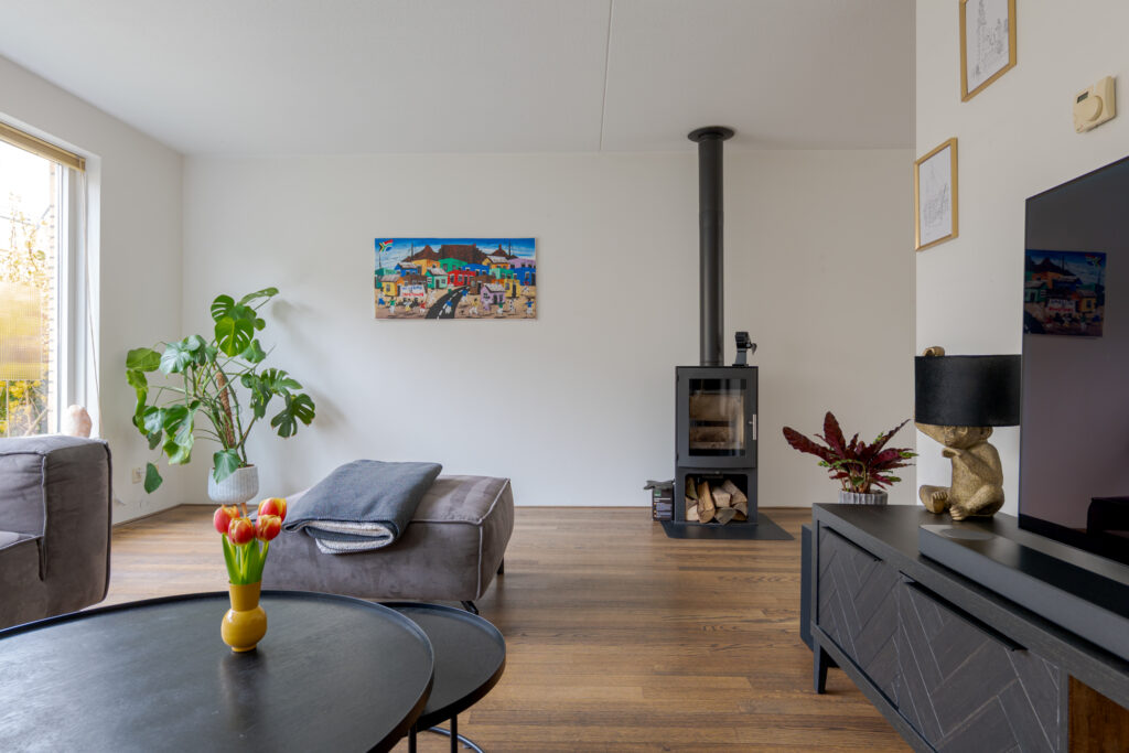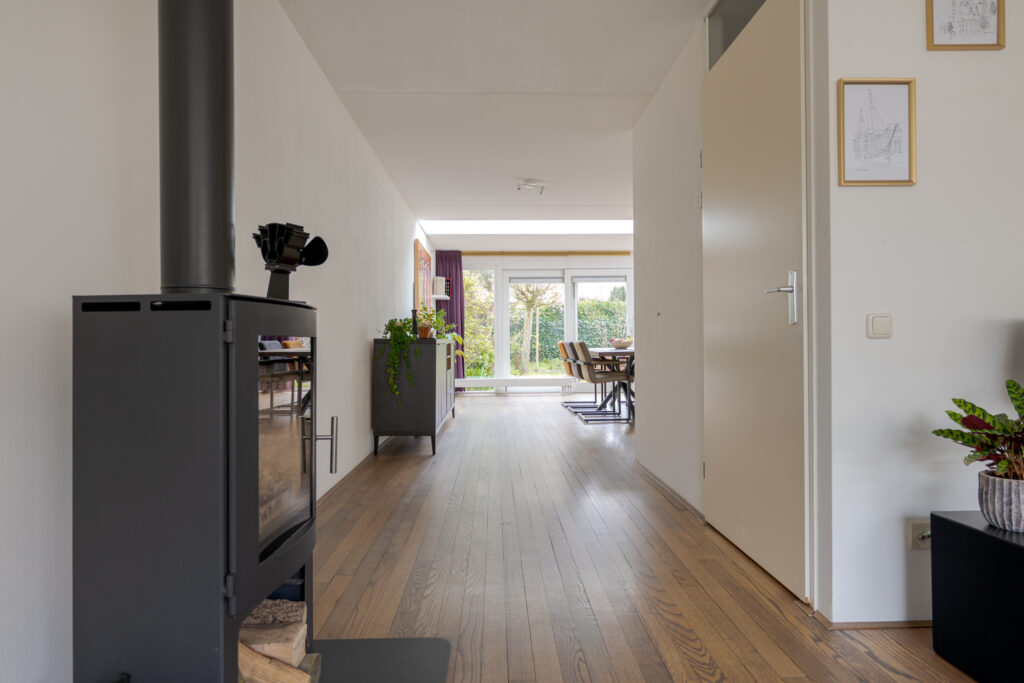 Via de hal, met toegang tot het toilet, de meterkast en de trapopgang, betreedt u de woonkamer. Deze is royaal opgezet en voelt licht en uitnodigend aan door de grote ramen. De houtkachel vormt een sfeervol middelpunt en samen met de eikenhouten vloer ontstaat hier een warme, huiselijke uitstraling. Aan de achterzijde bevindt zich naast voldoende ruimte voor een grote eethoek de open keuken, die in 2018 is vernieuwd. De keuken heeft een eigentijdse uitstraling en biedt een fijne plek voor iedereen die graag kookt of aanschuift.