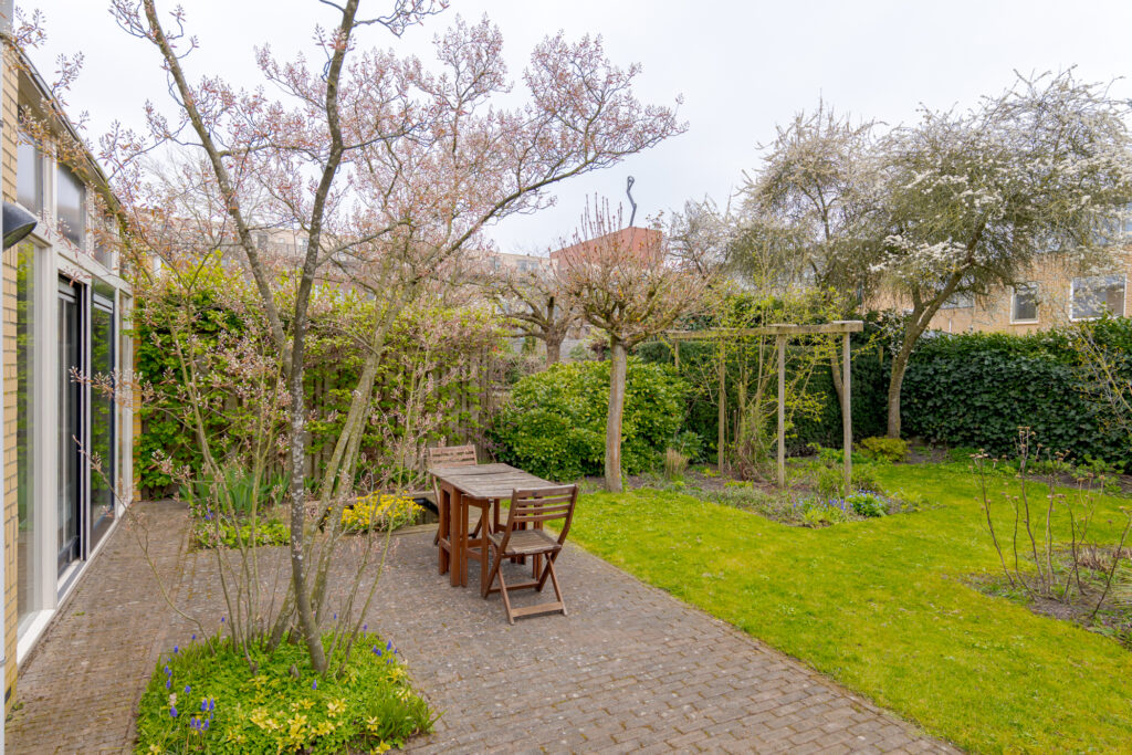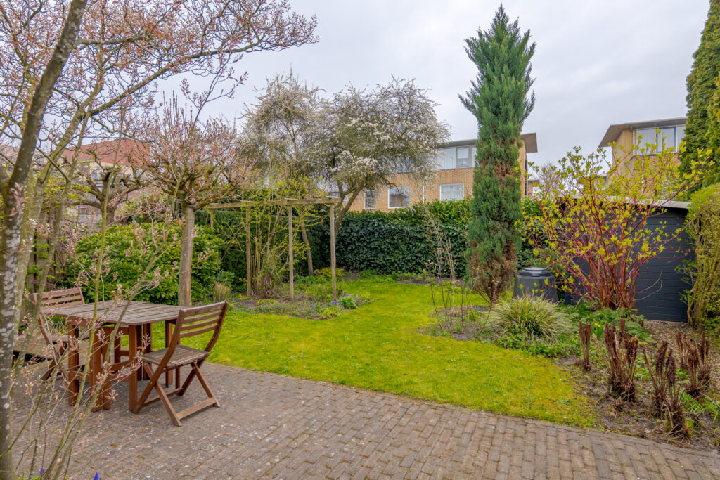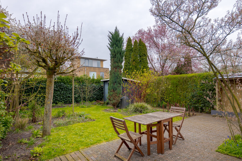 Ook buiten is het volop genieten. De achtertuin is met veel zorg aangelegd en biedt een sfeervolle combinatie van groen, privacy en gebruiksgemak. Er is volop ruimte voor een gezellig zitgedeelte, een ontspannen ochtend in de zon of een lange zomeravond met familie en vrienden. Achter in de tuin staat een houten berging, ideaal voor het opbergen van tuingereedschap of andere spullen.