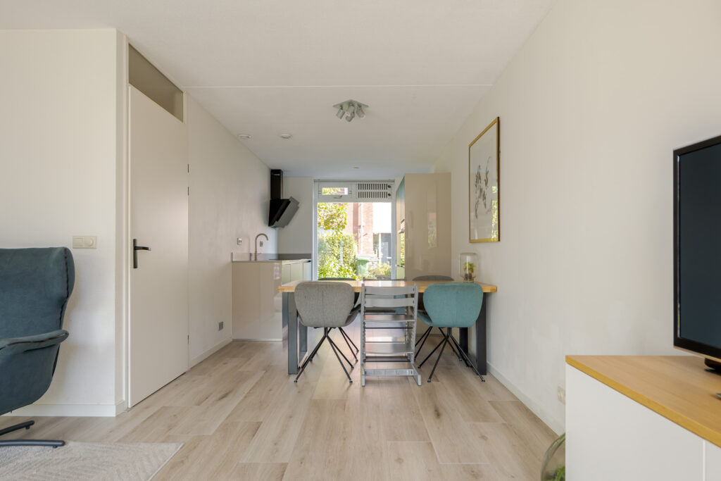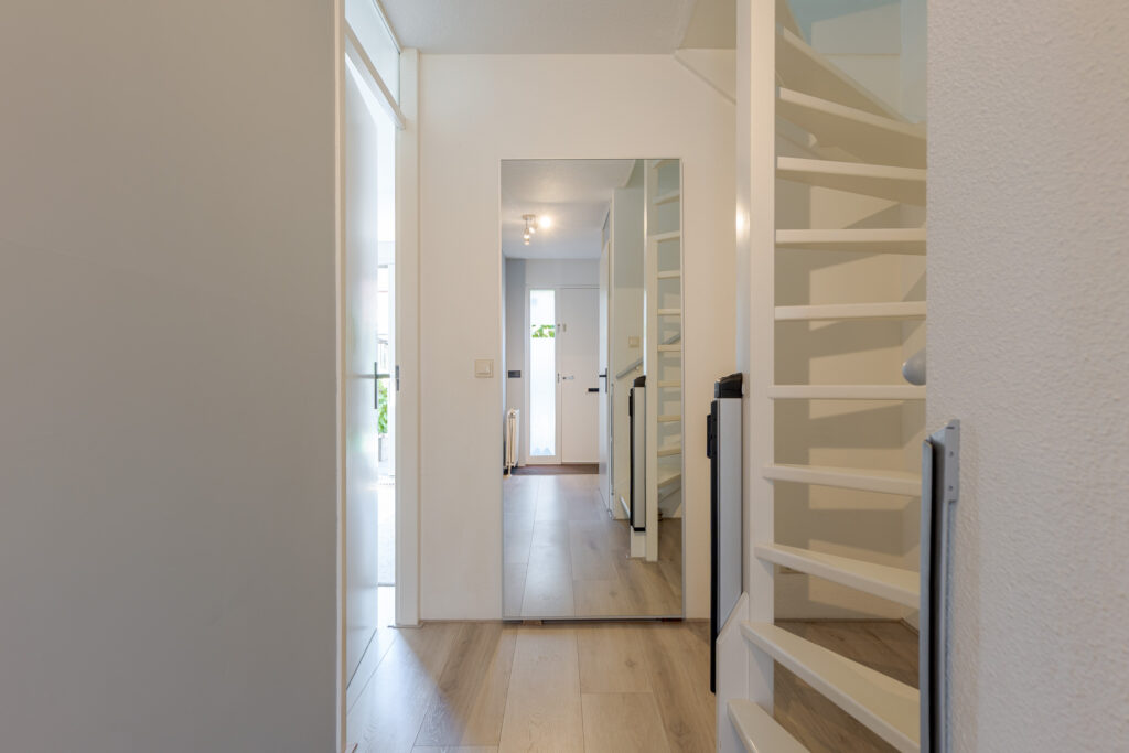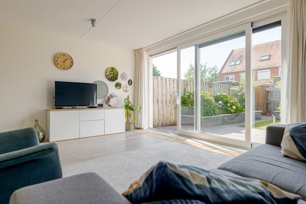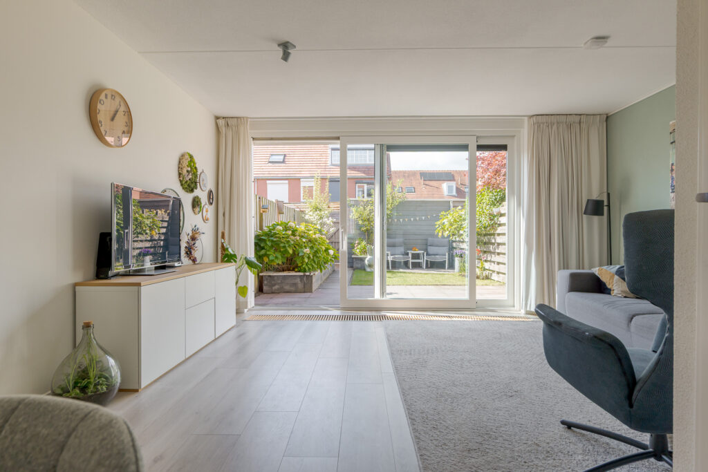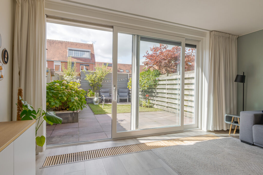 Het voortuintje biedt prettige privacy. U komt binnen in de hal, vanuit hier heeft u toegang tot de meterkast, het toilet, trapopgang en de woonkamer. De woonkamer is heerlijk licht dankzij de grote schuifpui naar de tuin, met als bijkomend voordeel dat de leefruimtes binnen en buiten naadloos in elkaar overlopen.