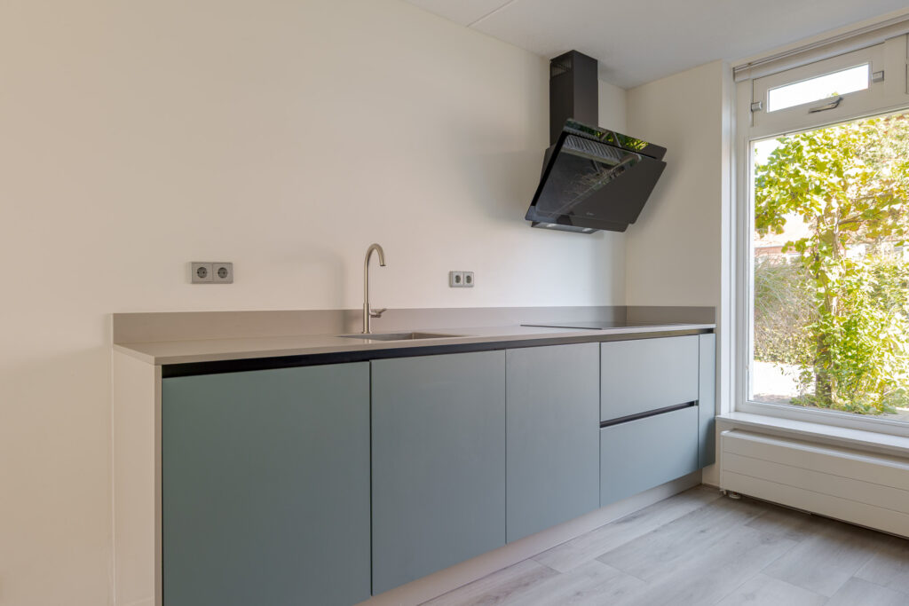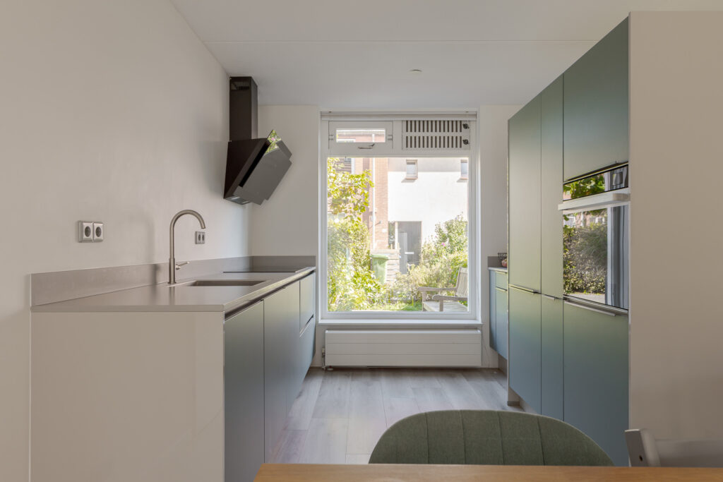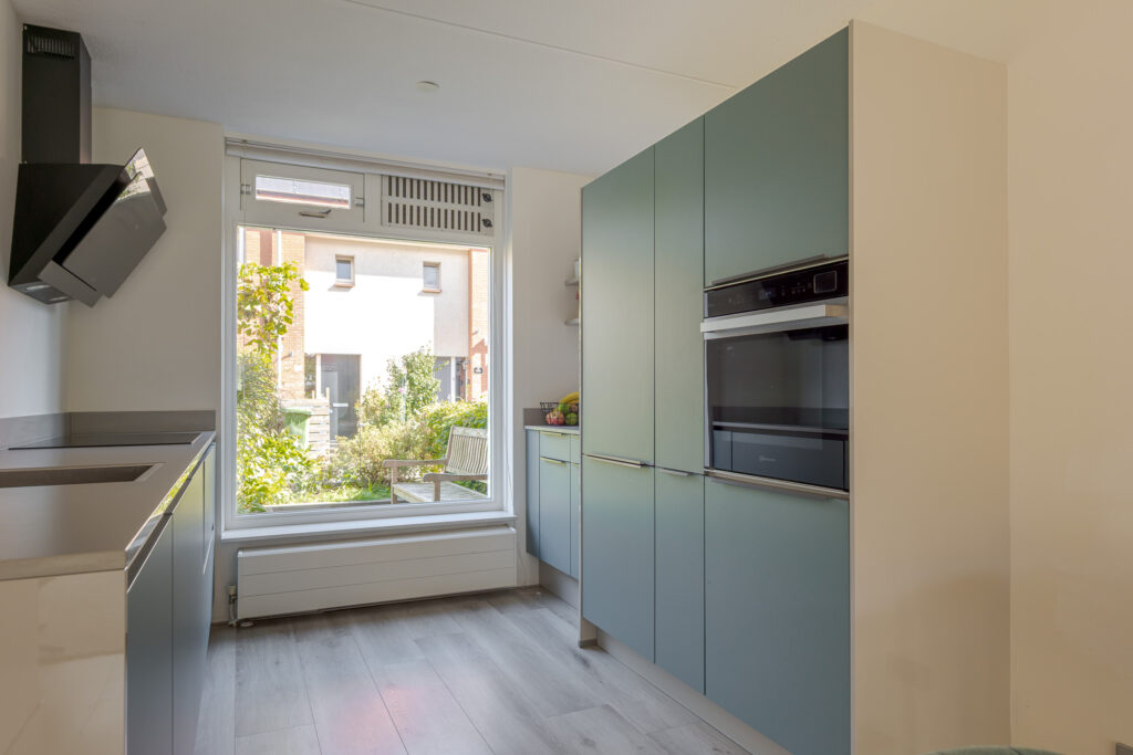 Aan de voorzijde bevindt zich de moderne keuken, met divers inbouwapparatuur, in rustige kleurstelling.