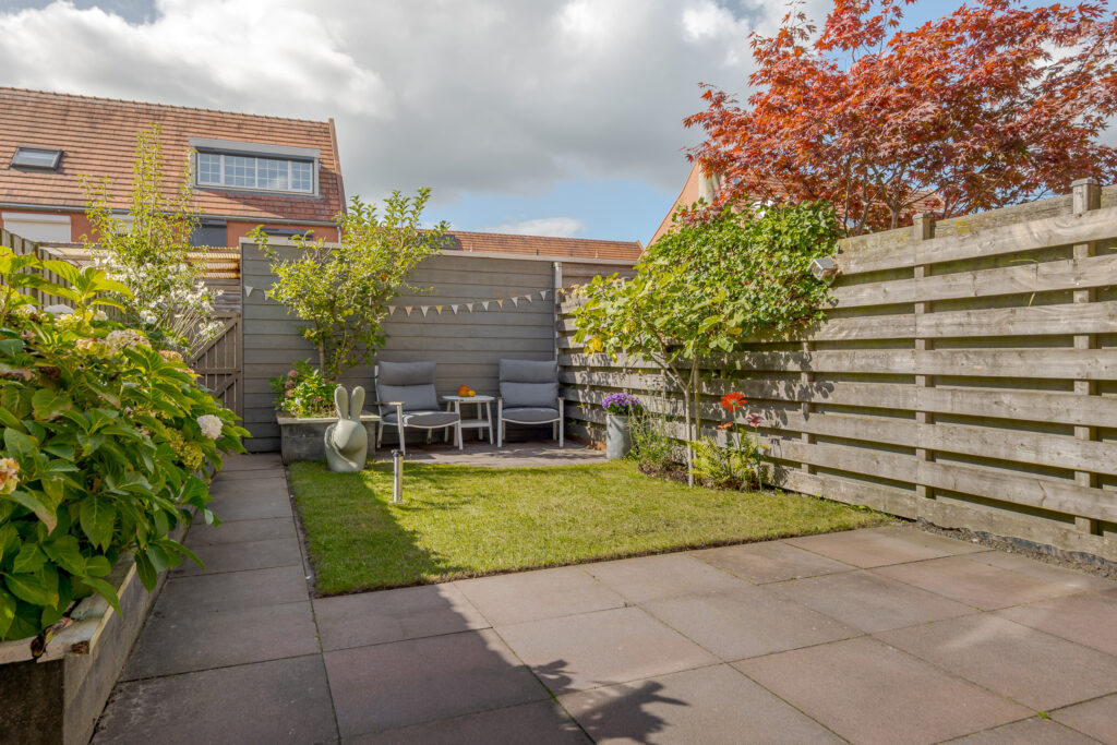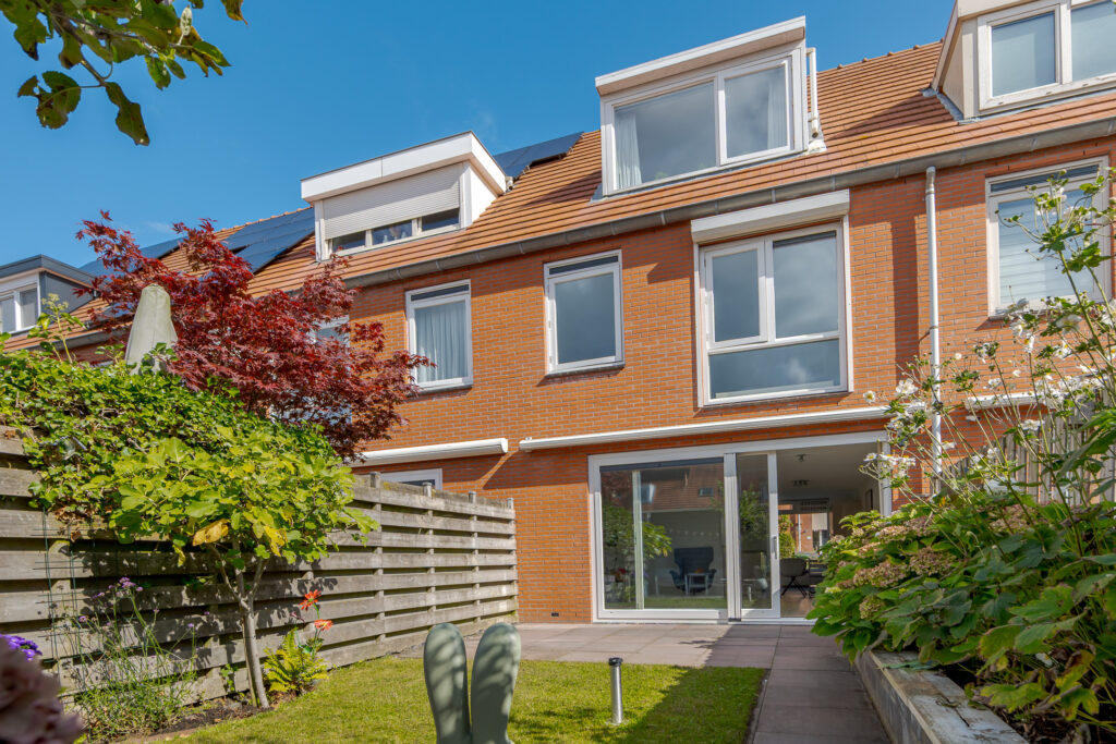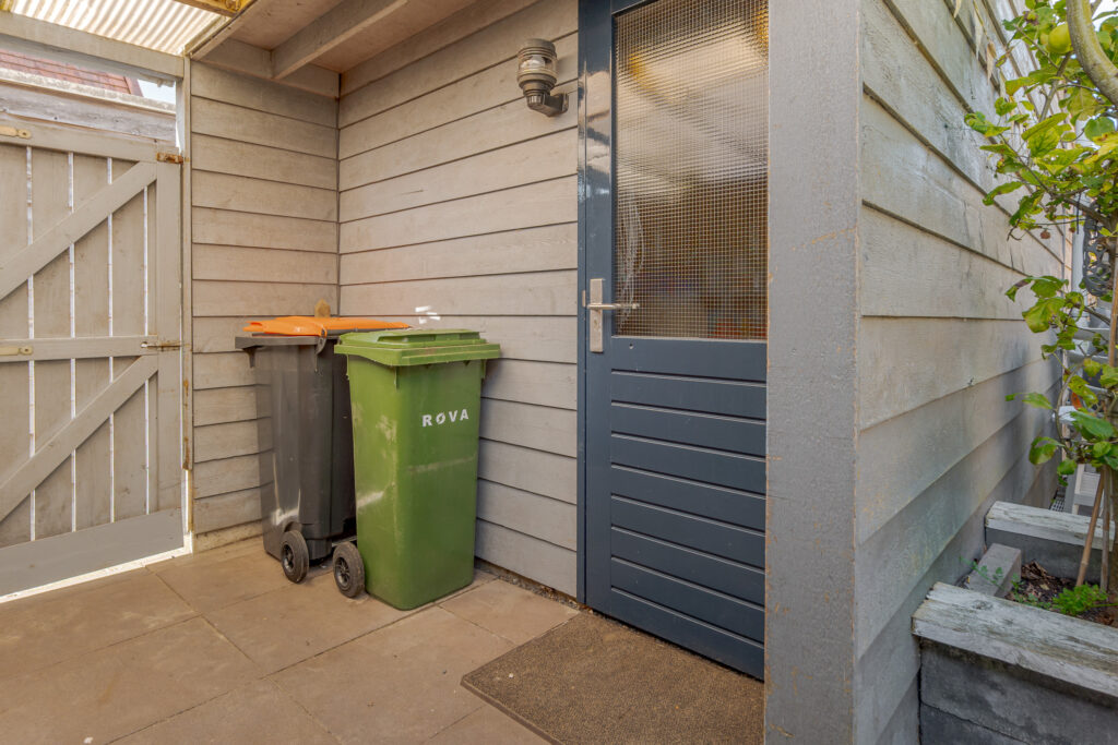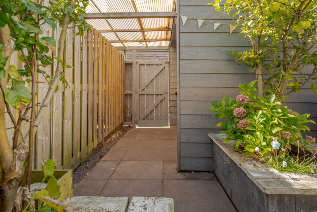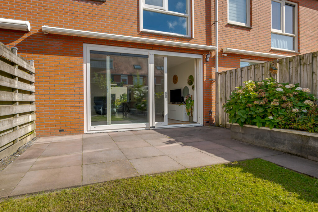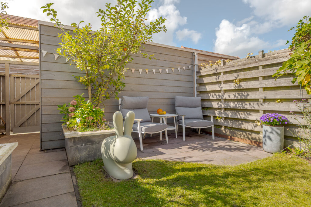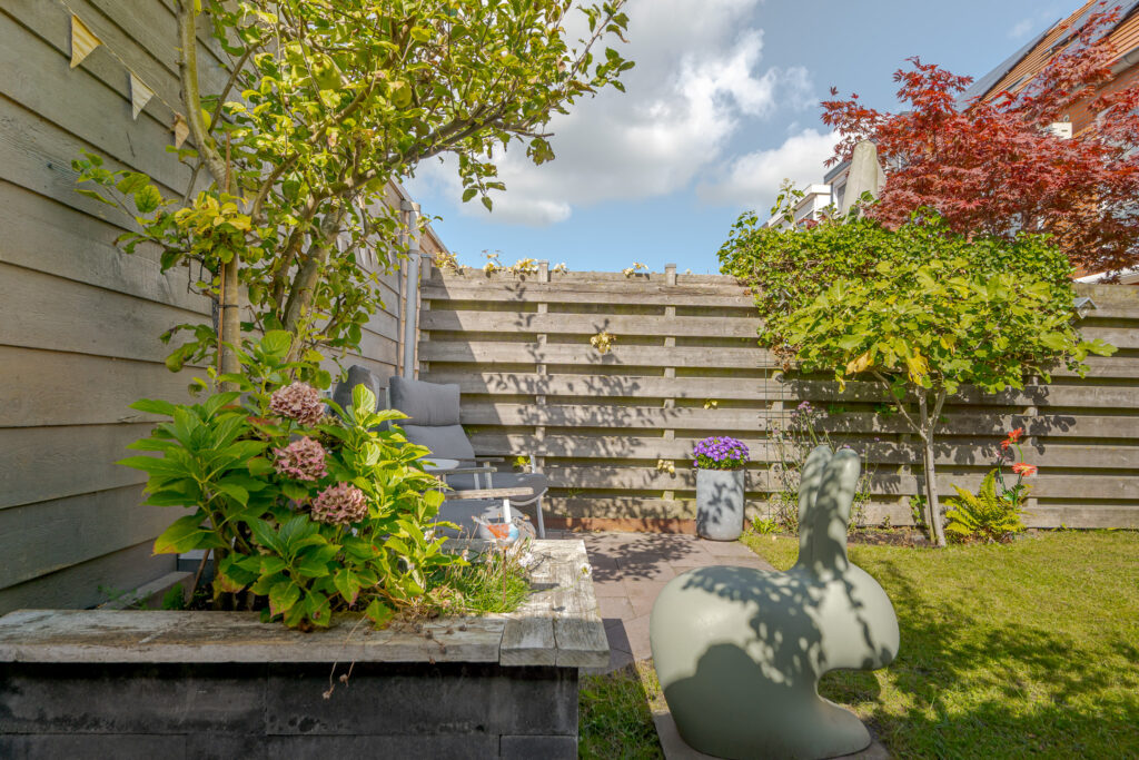 De zonnige achtertuin, met achterom, is fraai aangelegd met twee betegelde terrassen en gazon – perfect voor ontspannen zomerdagen. Achterin de tuin staat een vrijstaande houten berging. Ideaal voor gereedschap, fietsen en tuinmeubilair.