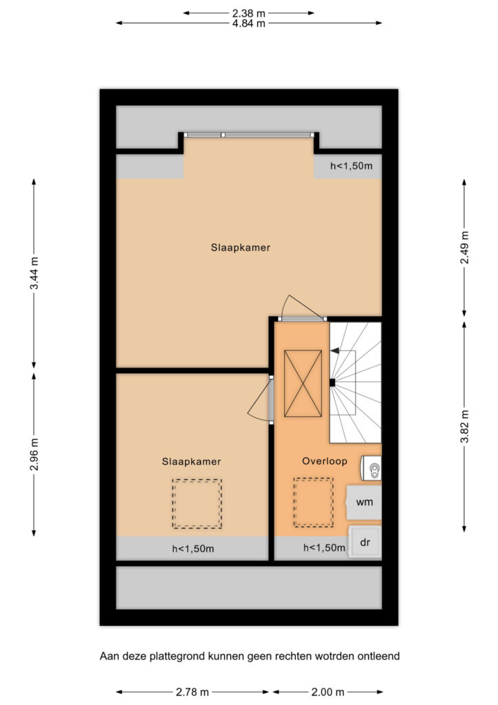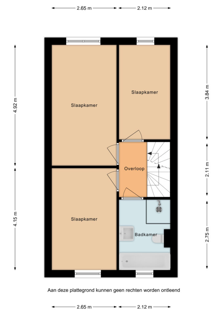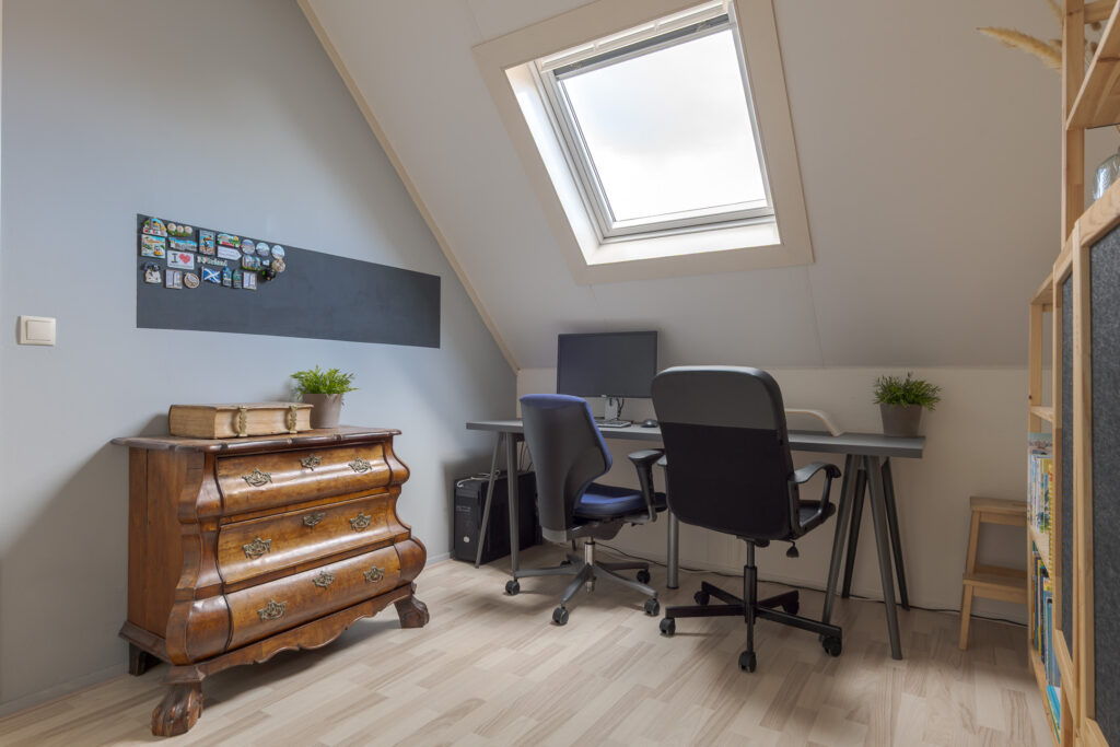 De tweede verdieping biedt nog twee slaapkamers, waarvan één met brede dakkapel. Op de overloop is de aansluiting voor de wasmachine en droger gesitueerd en vanuit hier is er toegang tot de bergvliering.