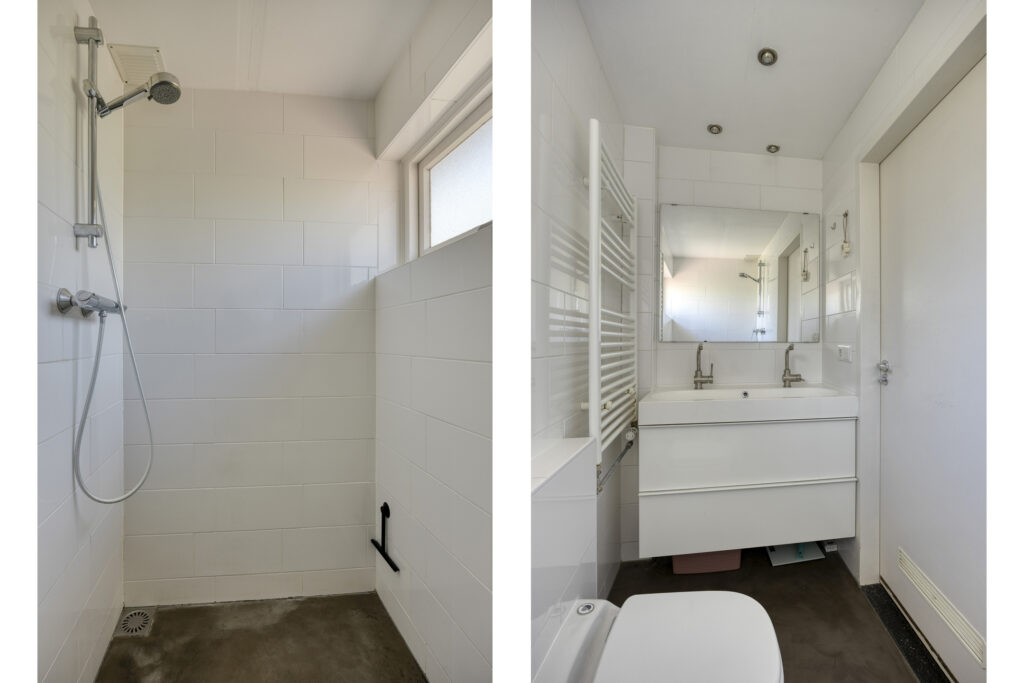 Op de eerste verdieping geeft de overloop toegang tot drie slaapkamers en de badkamer. De badkamer is compact maar compleet ingericht en voorzien van een inloopdouche, toilet, wastafelmeubel en dubbele wastafel in neutrale kleurstelling.