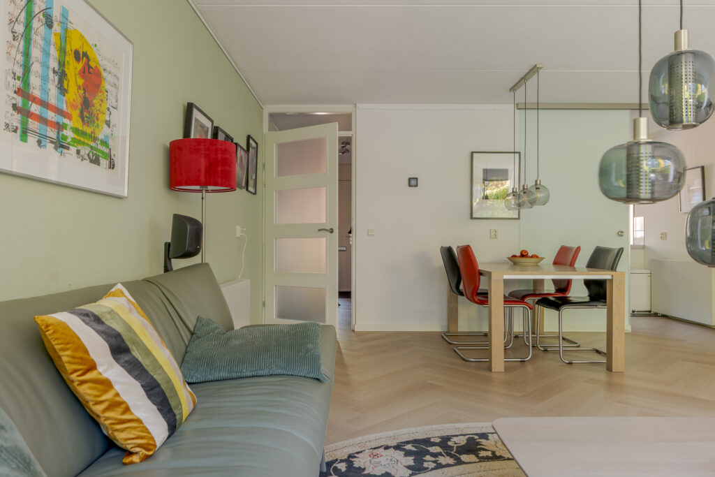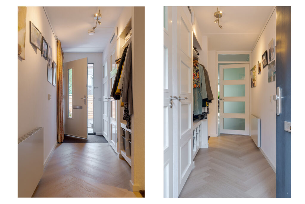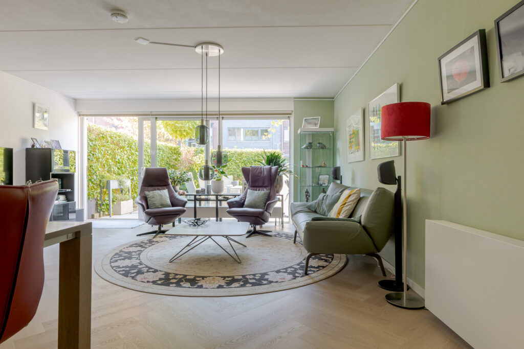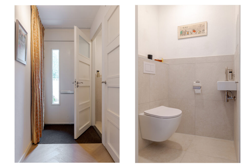 Via een trapje komt u bij het entree, vergezeld door een kleine, voor privacy zorgende, voortuin. De hal met meterkast en toilet leidt naar de woonkamer aan de achterzijde, met toegang tot de achtertuin middels een grote schuifpui, welke zorgt voor veel natuurlijk licht.
