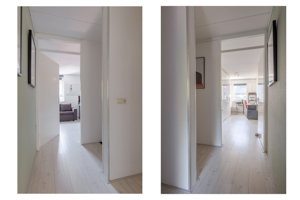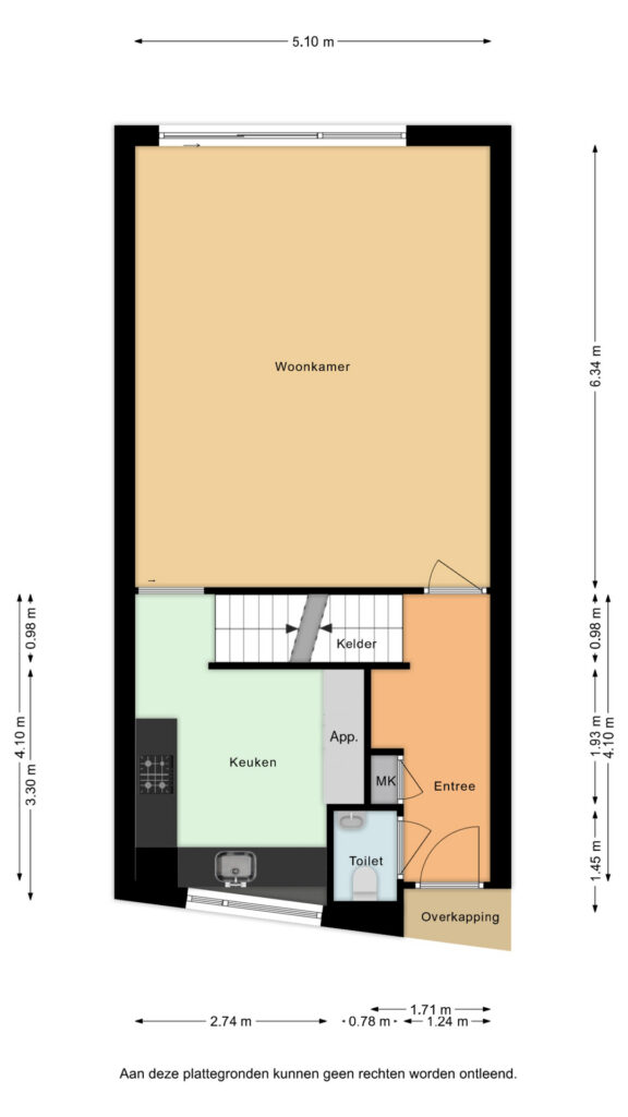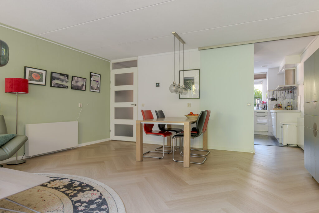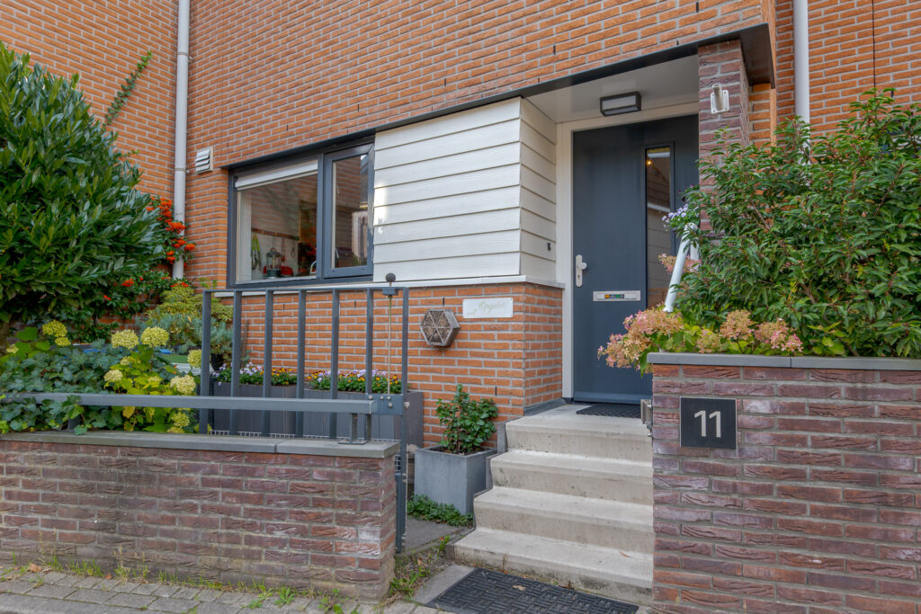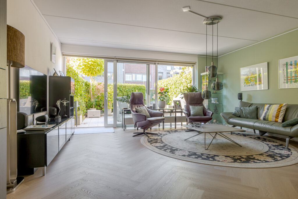 Via een trapje komt u bij het entree, vergezeld door een kleine, voor privacy zorgende, voortuin. De hal met meterkast en toilet leidt naar de woonkamer aan de achterzijde, met toegang tot de achtertuin middels een grote schuifpui, welke zorgt voor veel natuurlijk licht.
