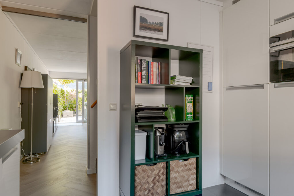 Aan de voorzijde is de keuken gelegen, opgesteld in landelijke stijl met veel kastruimte en is voorzien van divers inbouwapparatuur (2019) waaronder een Quooker, vaatwasser, koelkast, oven en combimagnetron.
