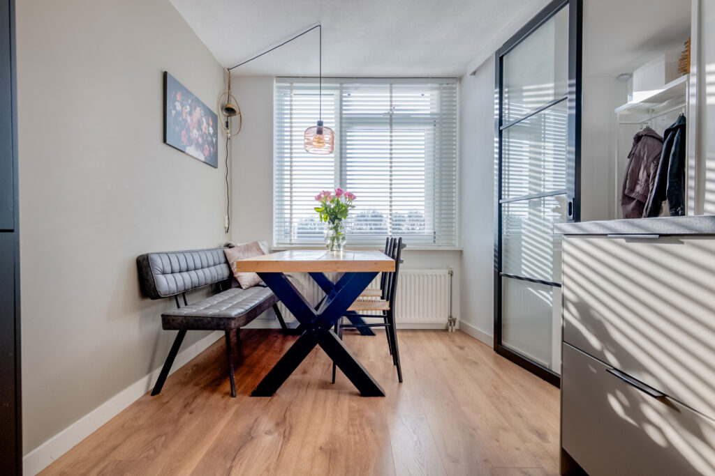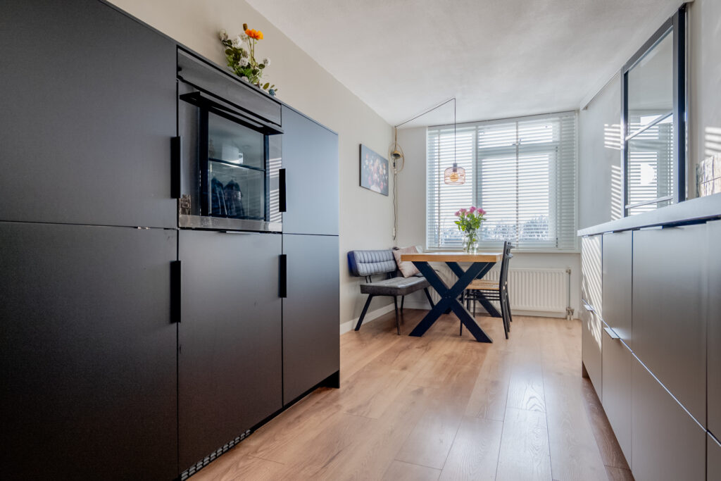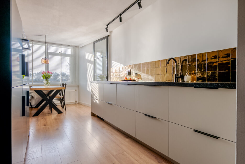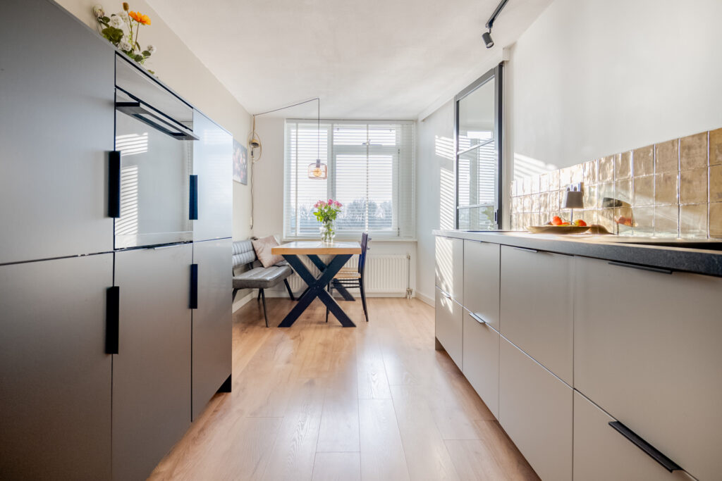 Aan de raamzijde is genoeg ruimte voor een eettafel, waardoor de keuken uitstekend geschikt is voor gezellige borrels, diners of een ontspannen ontbijt.