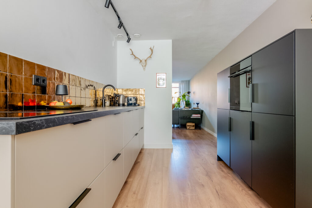 De in 2023 volledig vernieuwde keuken is strak en modern vormgegeven en is uitgevoerd in een rustige kleurstelling met greeploze fronten en een donker werkblad. De warm getinte, glanzende wandtegels geven de keuken een eigentijdse en sfeervolle uitstraling.