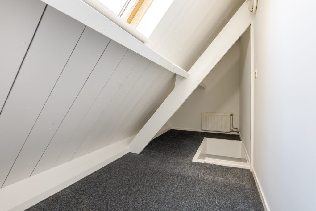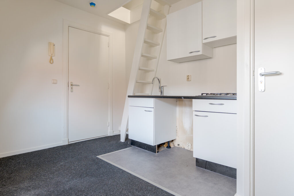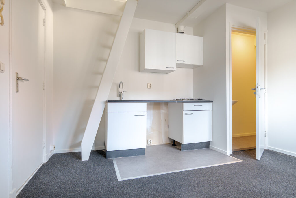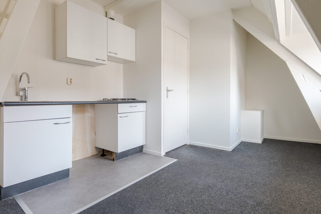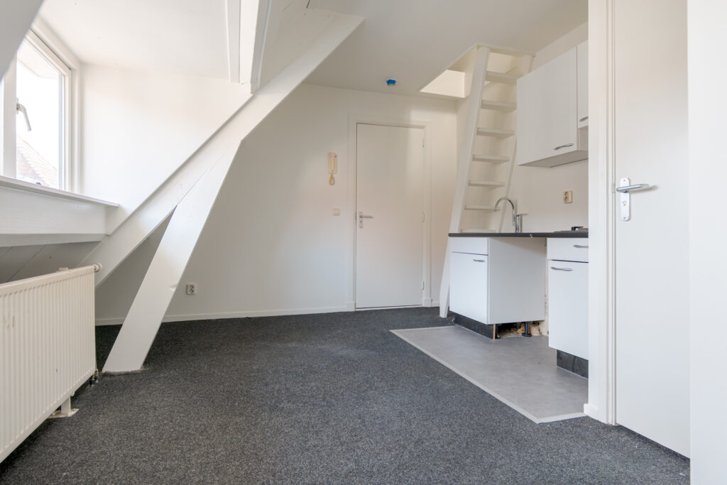 Dit gezellige appartement ligt op de tweede verdieping en biedt ruimte voor een fijne zit- en eethoek. De keuken is netjes opgesteld en vanuit de woonkamer is de badkamer bereikbaar, voorzien van een douche en wastafel. Via de trapopgang heb je toegang tot de ruimte waar je een slaapgedeelte kunt creëren. Het dakkapel zorgt voor een fijne en lichte sfeer in het appartement.