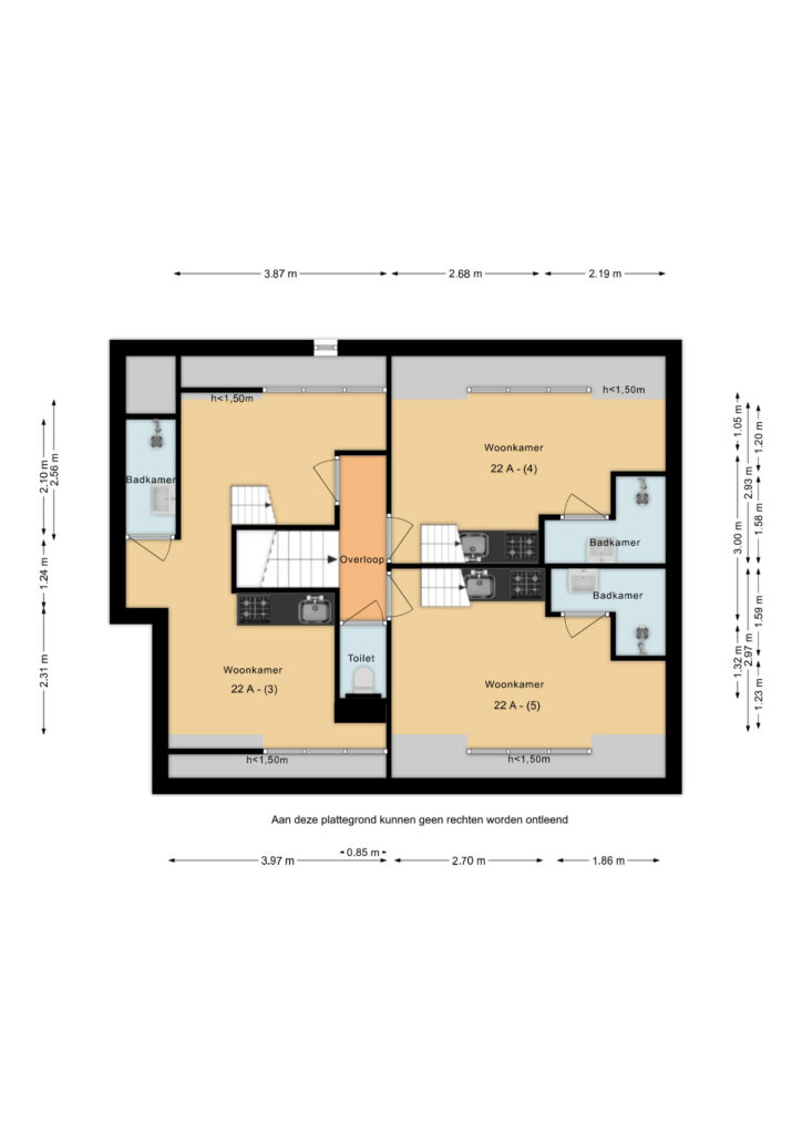 Op deze woonlaag wordt alleen het toilet gedeeld met twee andere appartementen. De overige voorzieningen zijn voor eigen gebruik.