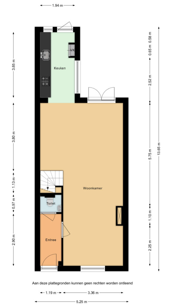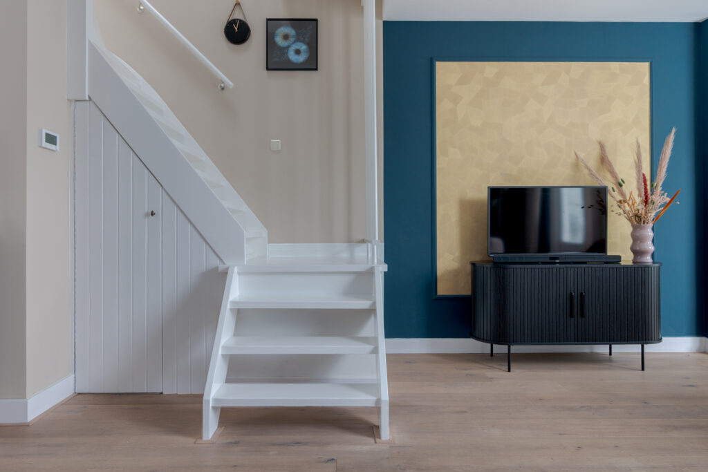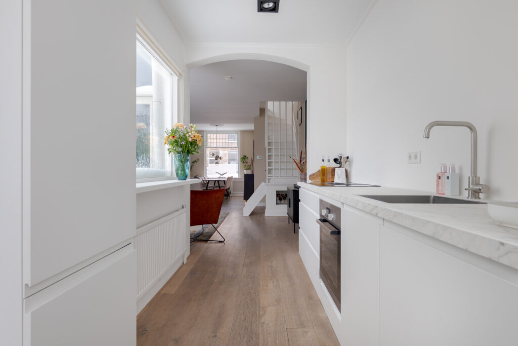 Aan de achterzijde van de woning bevindt zich de moderne keuken, uitgevoerd in een efficiënte rechte opstelling en voorzien van alle benodigde inbouwapparatuur. Onder de keuken bevindt zich een ruime kelder. Vanuit de keuken heeft u eveneens toegang tot de achtertuin, wat het dagelijks gebruik zeer comfortabel maakt.