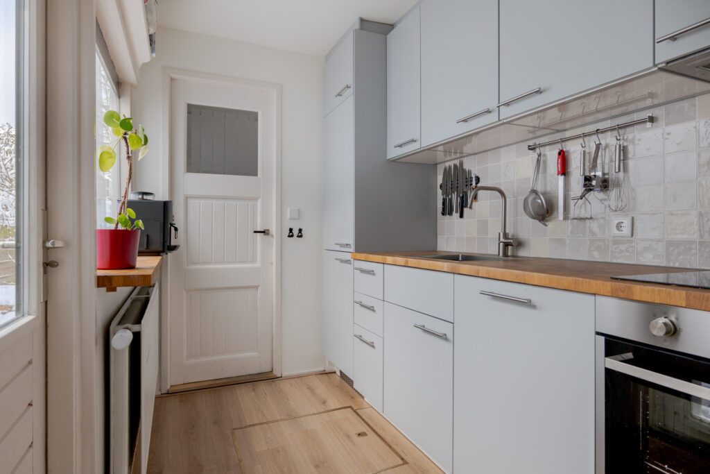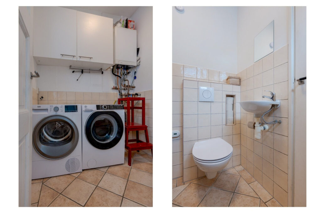 De woning valt op door de overkapping bij de entree, waar u droog binnenkomt via de hal met toegang tot de woonkamer. De houten vloer zorgt voor een huiselijke en warme uitstraling, terwijl de grote ramen zorgen voor prettig daglicht. Aansluitend bevindt zich de keuken in de aanbouw, voorzien van diverse inbouwapparatuur en vernieuwd in 2022. Middels een deur heeft u toegang tot het toilet. Tevens bevinden zich hier de opstelling van de cv-ketel en de wasmachineaansluiting.