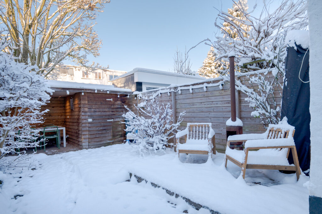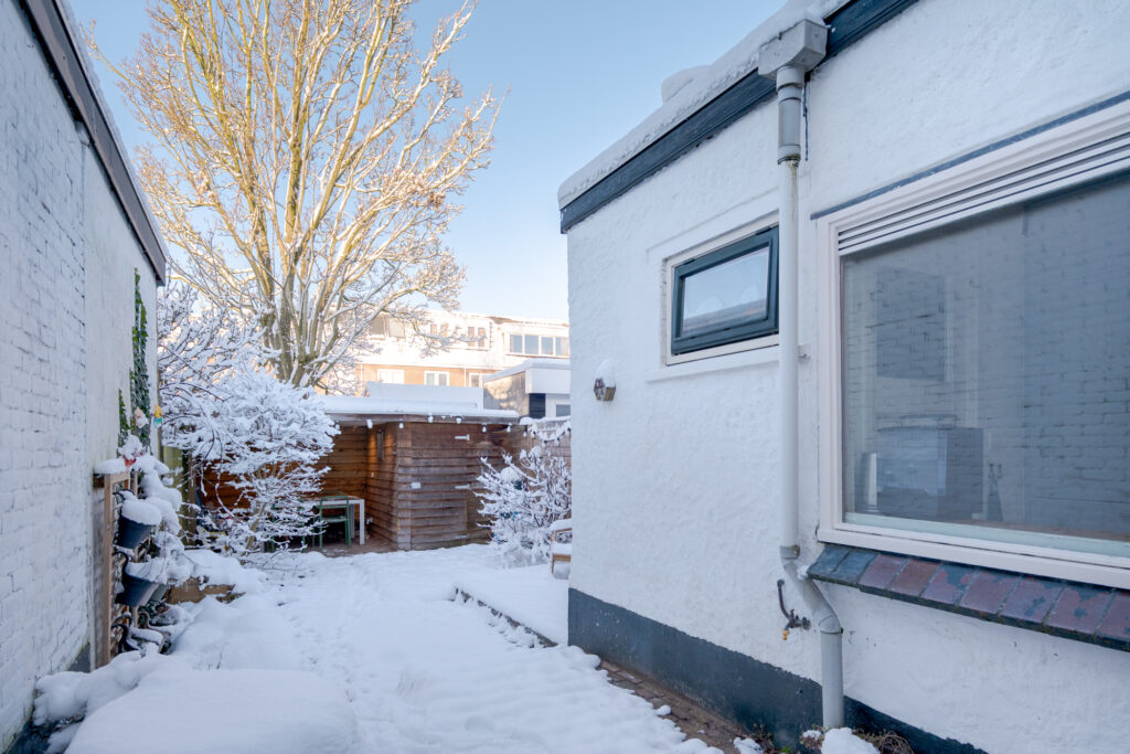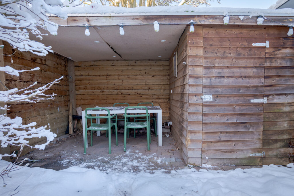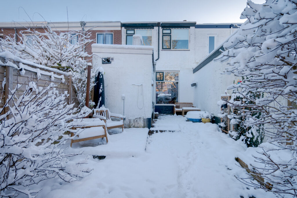 Middels een deur in de keuken heeft u toegang tot de achtertuin. Achter de woning bevindt zich een vrijstaande houten berging met een sfeervolle overkapping. Deze ruimte is perfect als loungehoek of beschut zitgedeelte en zorgt voor extra gemak en opslag buiten het huis.