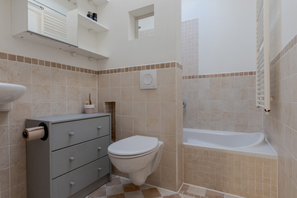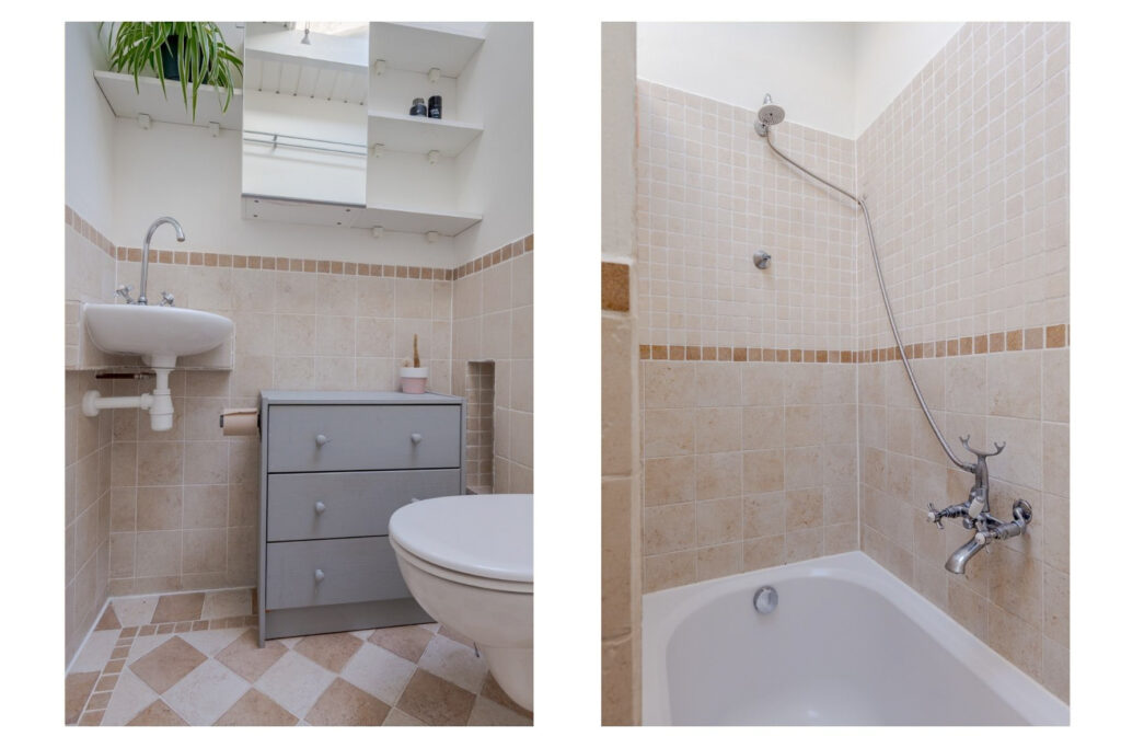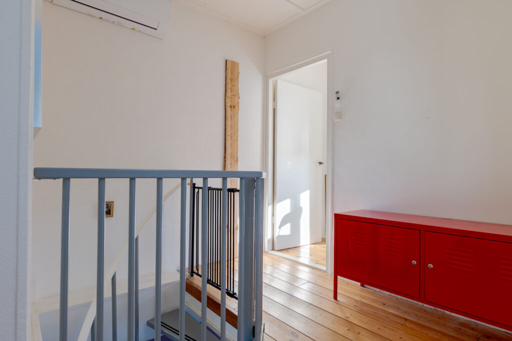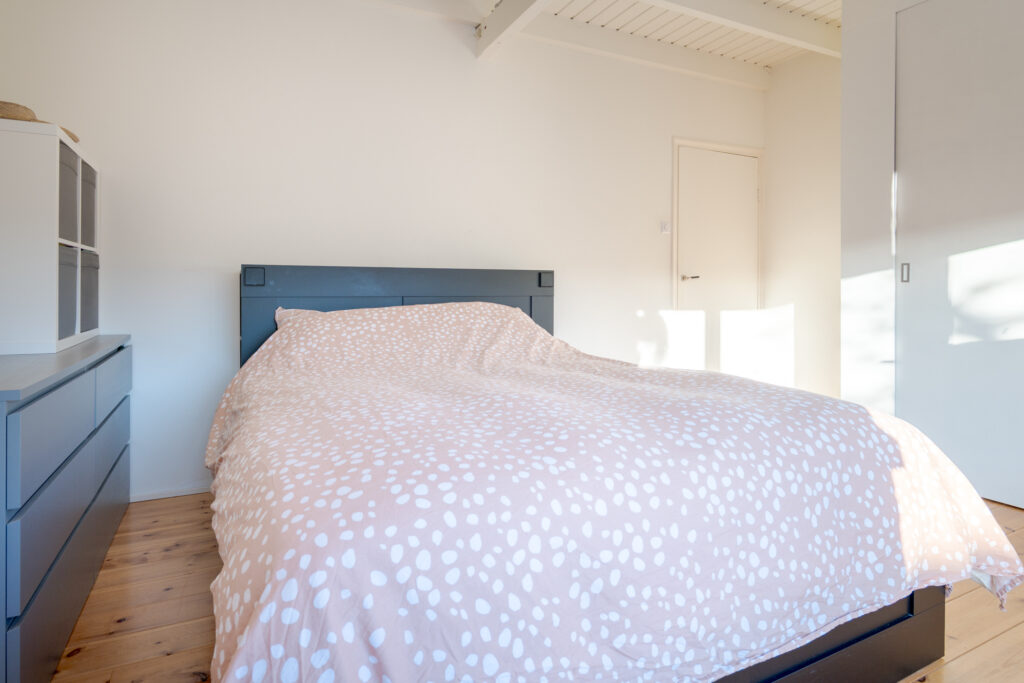 Op de eerste verdieping bevinden zich drie slaapkamers, twee aan de achterzijde en de hoofdslaapkamer over de gehele breedte aan de voorzijde. De badkamer met vloerverwarming is verder uitgerust met een ligbad, douche, toilet en wastafel en beschikt over een lichtkoepel die zorgt voor daglicht en ventilatie.