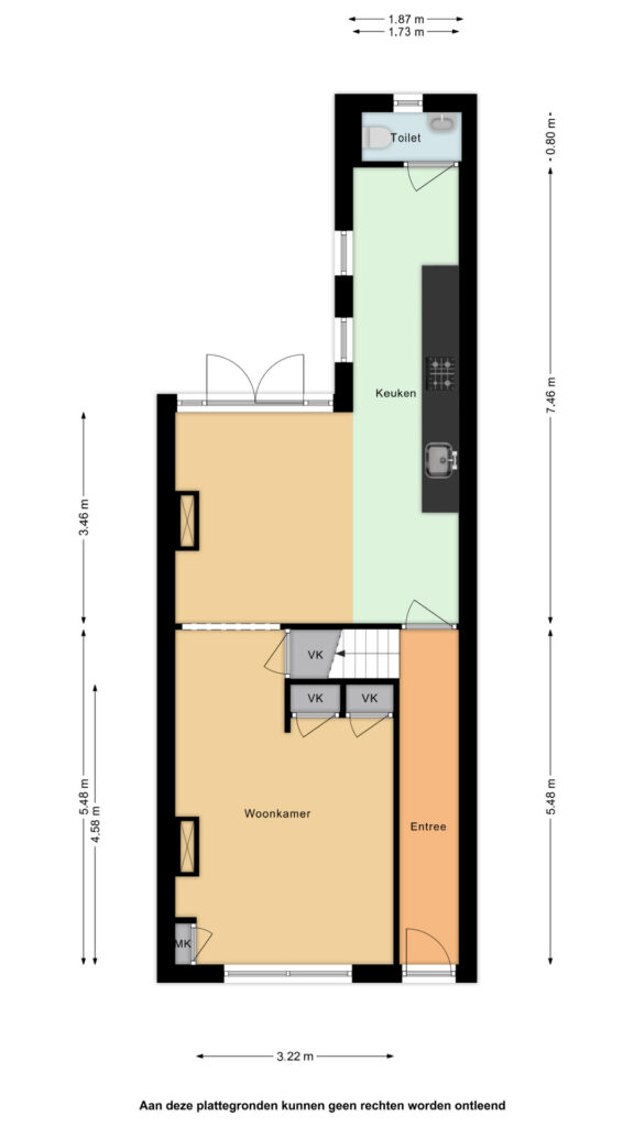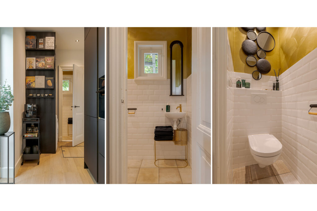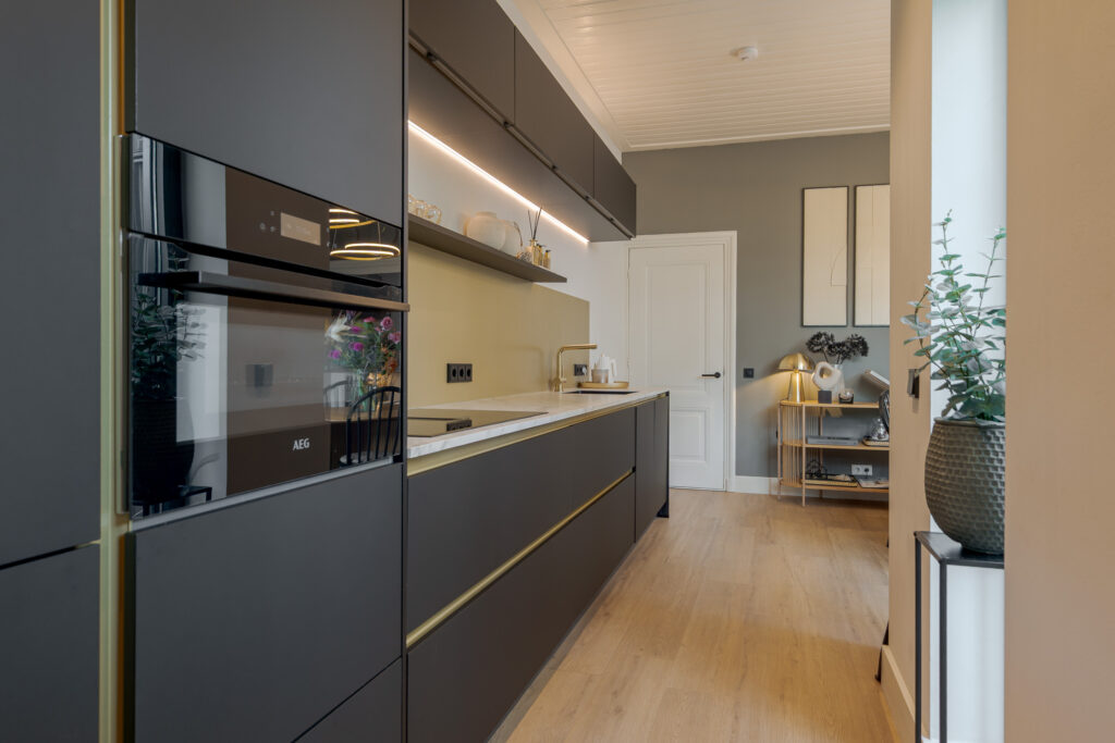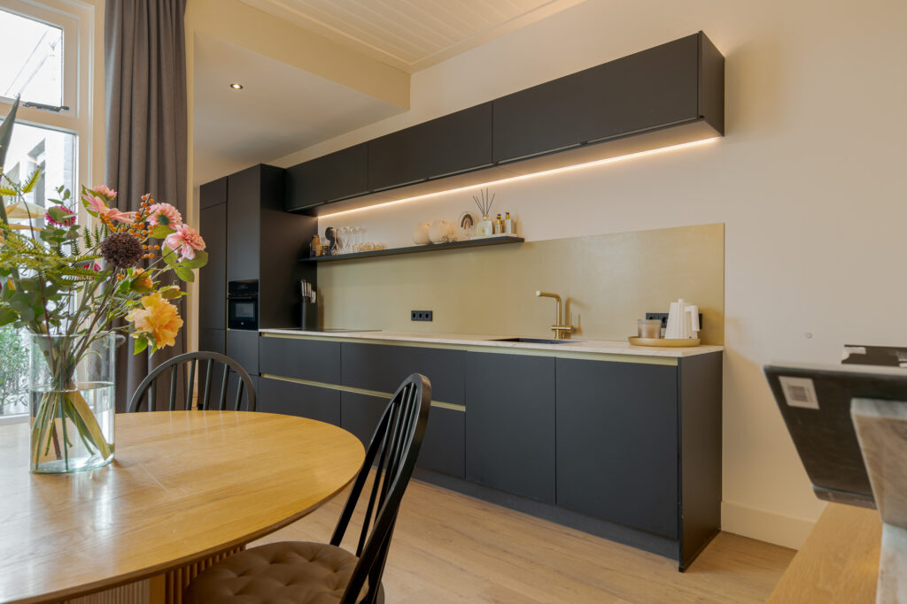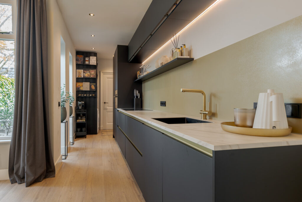 De moderne keuken is werkelijk een pronkstuk in de ruimte, strak en functioneel ingericht in een langgerekte opstelling en vormt samen met de originele elementen een smaakvolle combinatie van oud en nieuw. Achterin bevindt zich een separaat toilet, handig en discreet geplaatst.