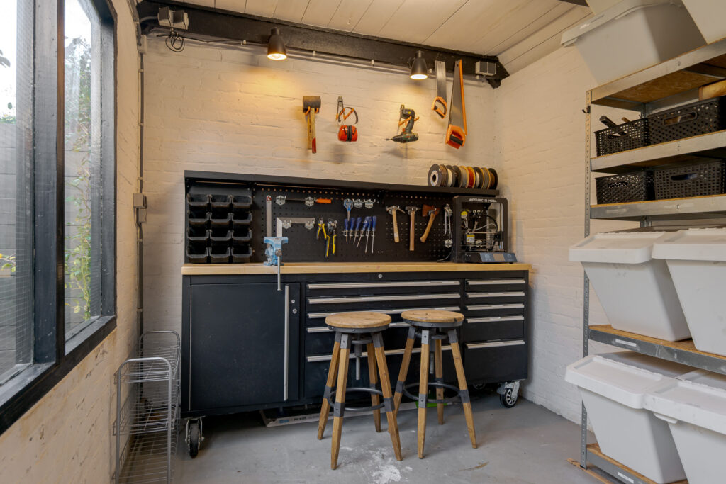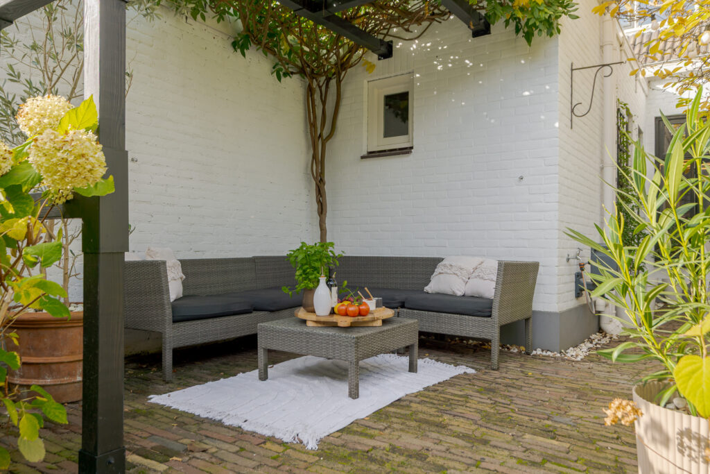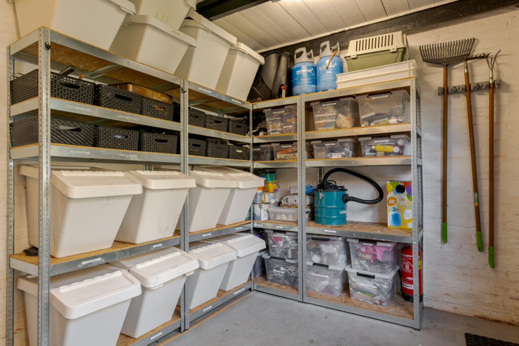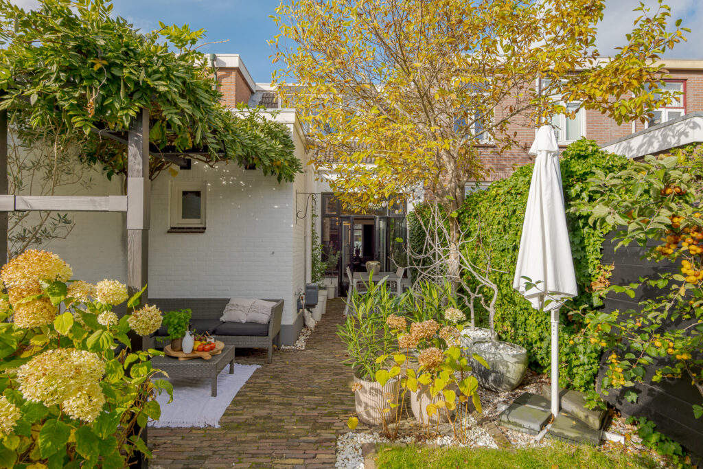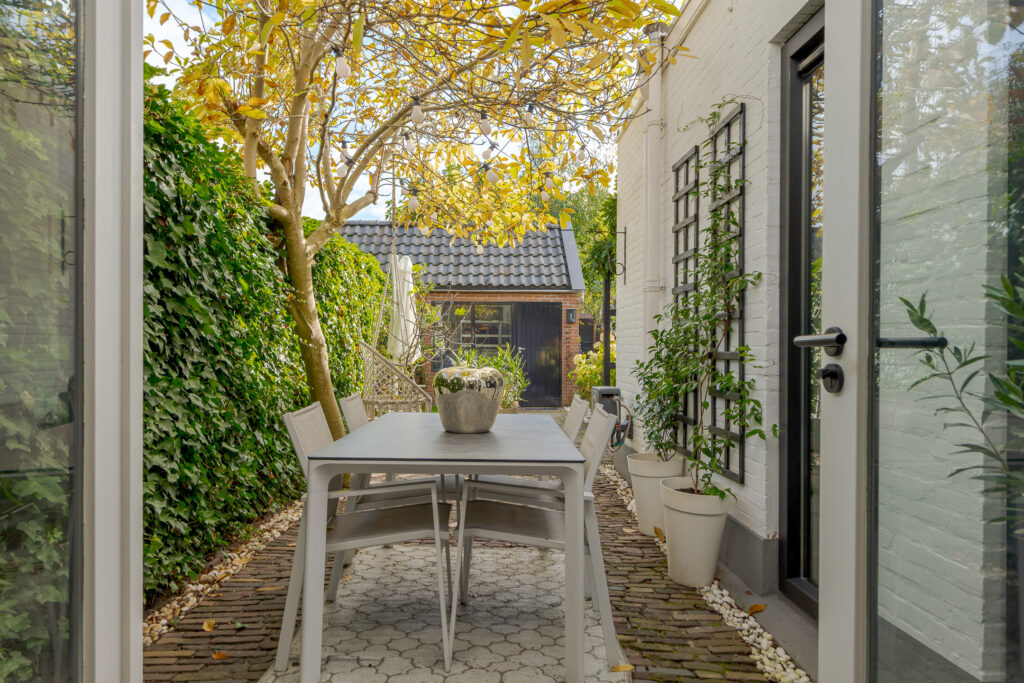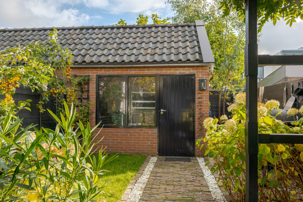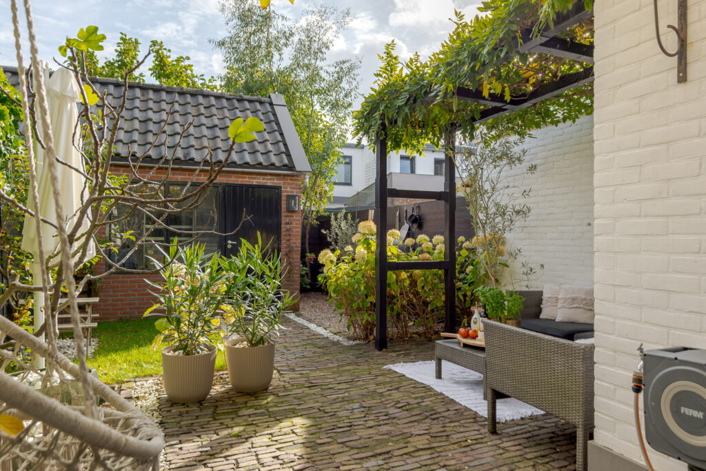 De achtertuin is een klein paradijsje op het zuidoosten: een plek waar u ’s ochtends de zon verwelkomt met een kop koffie, en ’s avonds geniet van rust en groen. De sfeervolle pergola’s, het charmante waaltjespad en de magnoliaboom geven de tuin een unieke uitstraling. Achterin vindt u een vrijstaande stenen berging met elektra – ideaal voor fietsen, gereedschap of extra opslag.
