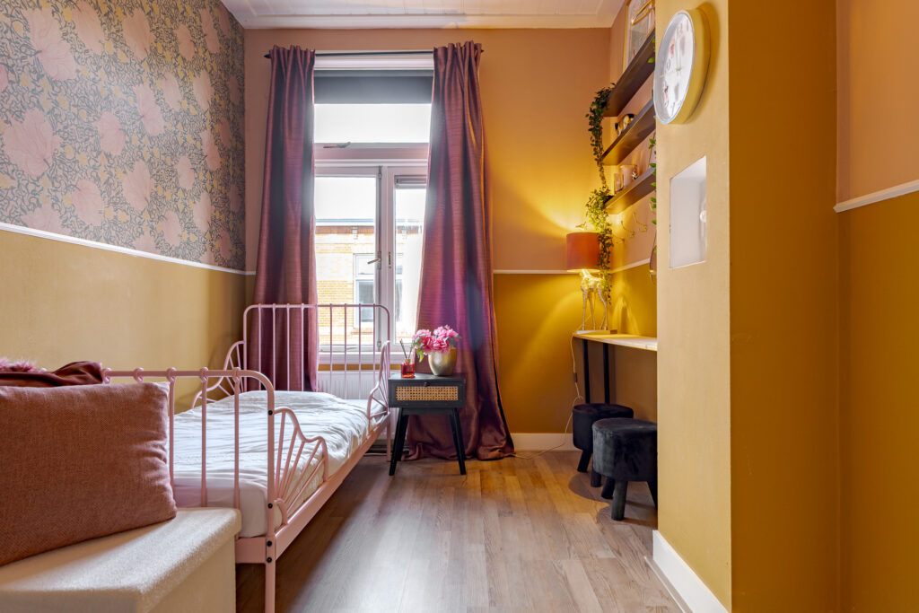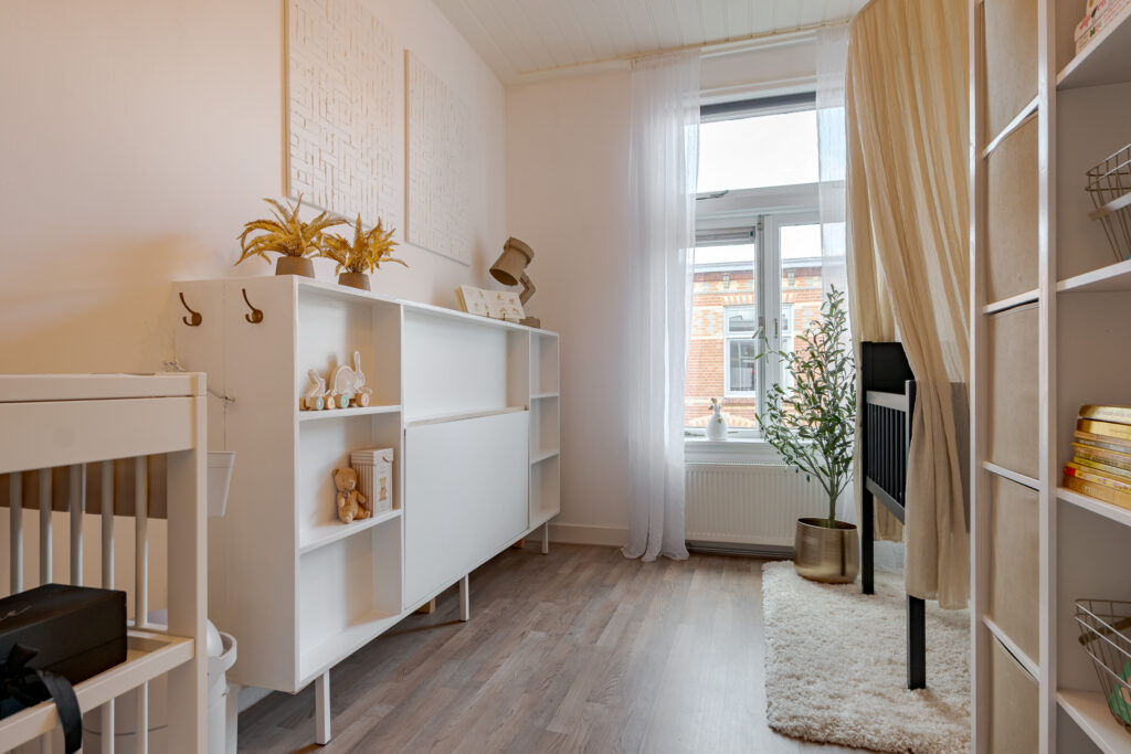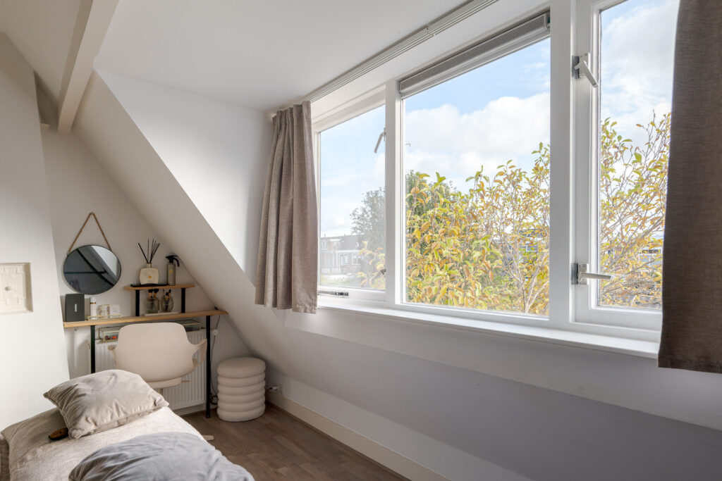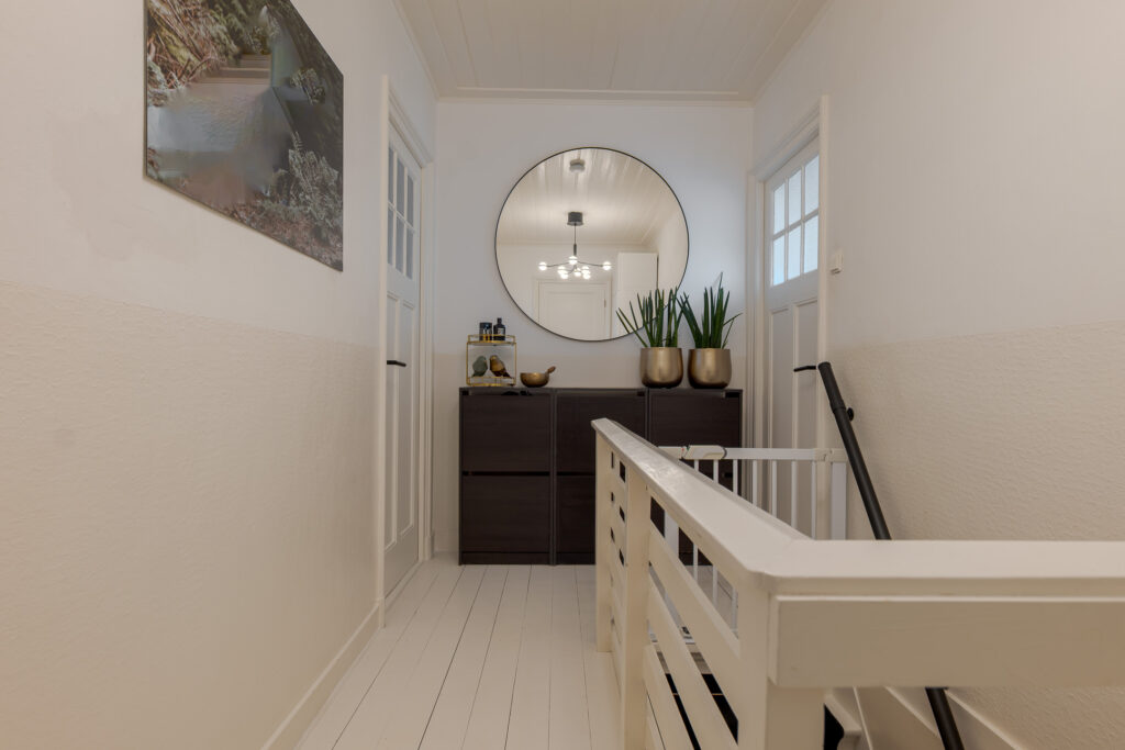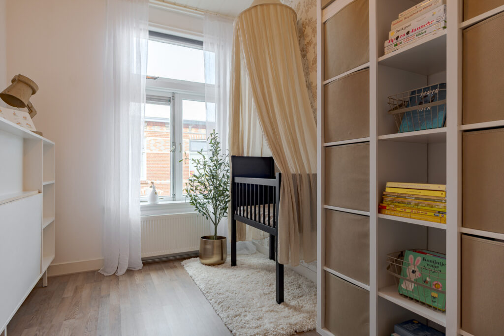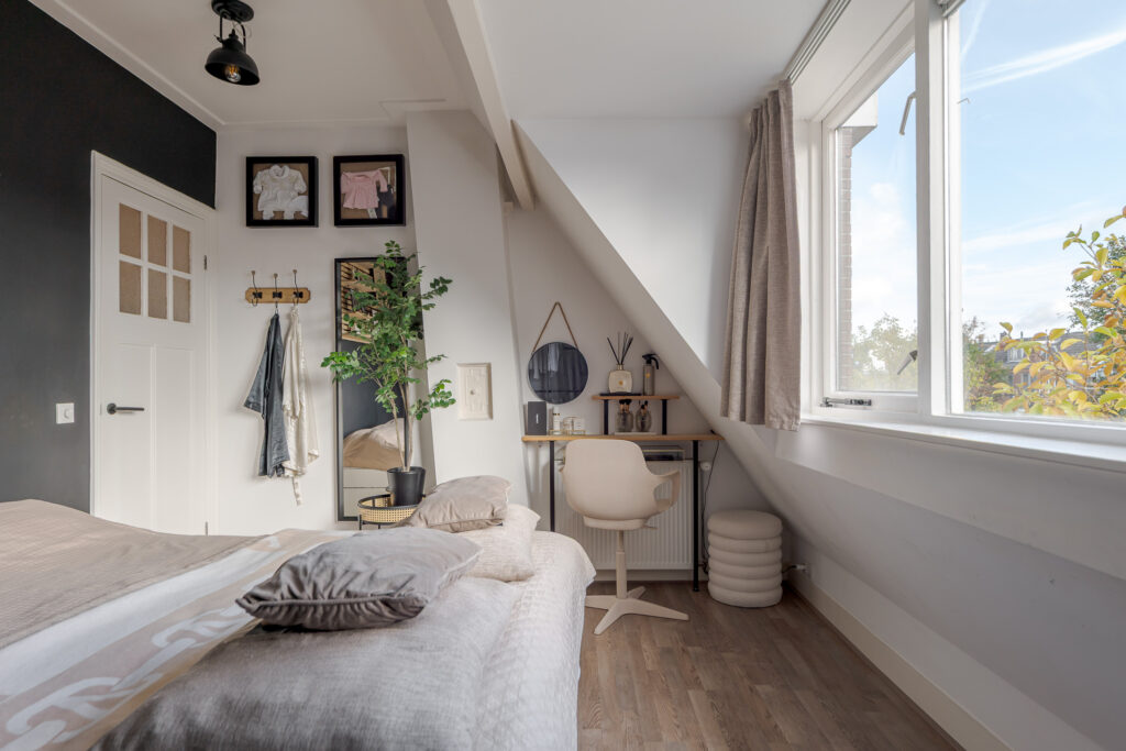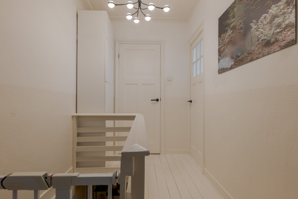 Op de eerste verdieping bevinden zich drie slaapkamers, elk met hun eigen sfeer. De royale master bedroom beslaat de volledige breedte van de woning, terwijl de twee kamers aan de voorzijde perfect zijn als kinderkamer, werkkamer of logeerruimte. De badkamer is compact en doelmatig ingericht met een douche en wastafel, en ook hier zie je de zorg en aandacht terug die in het huis is gestoken.