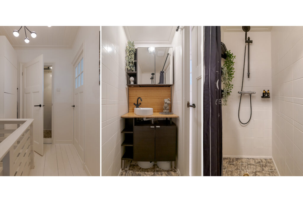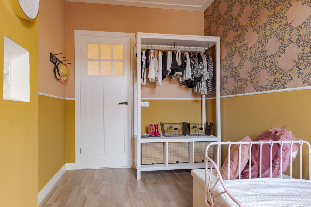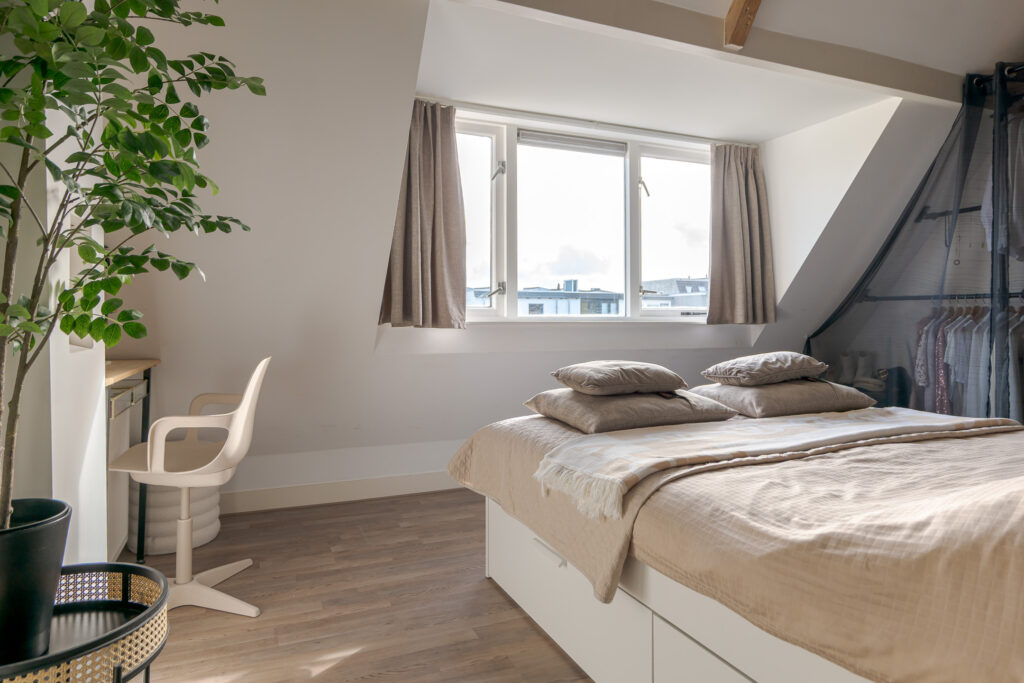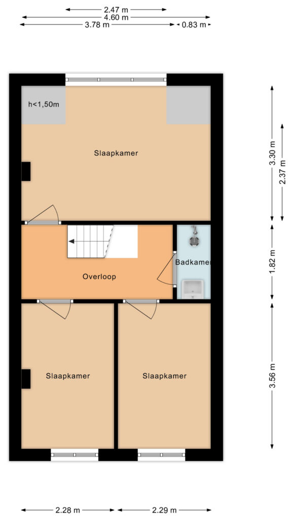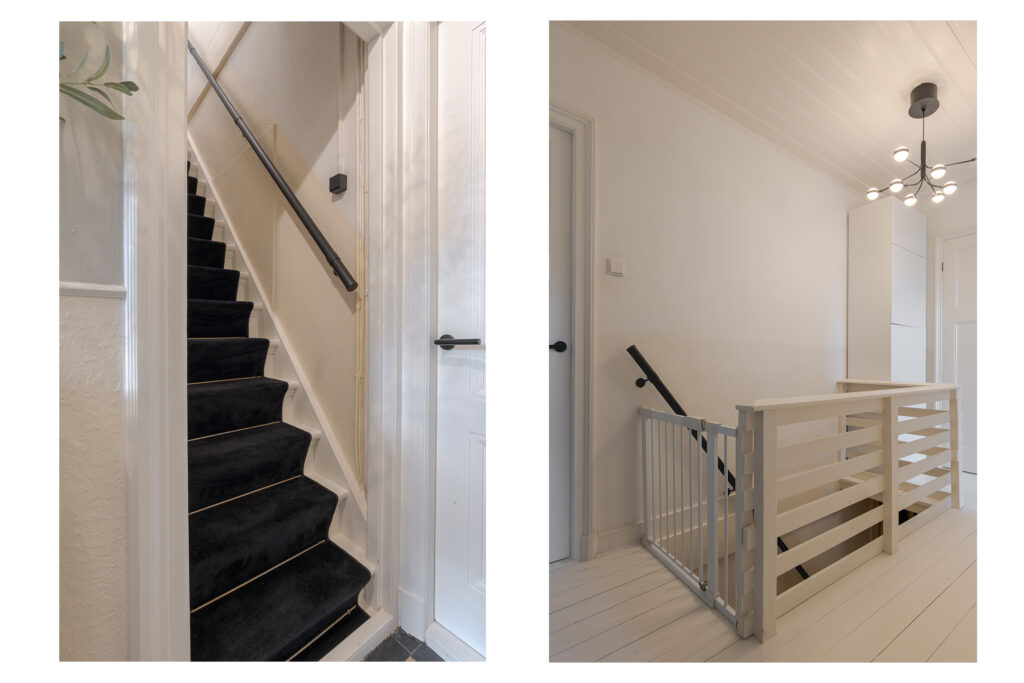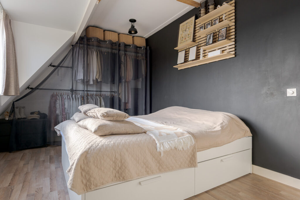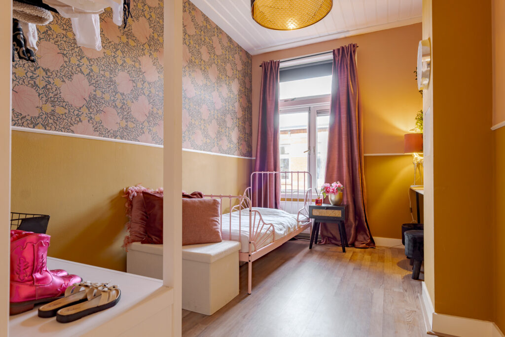 Op de eerste verdieping bevinden zich drie slaapkamers, elk met hun eigen sfeer. De royale master bedroom beslaat de volledige breedte van de woning, terwijl de twee kamers aan de voorzijde perfect zijn als kinderkamer, werkkamer of logeerruimte. De badkamer is compact en doelmatig ingericht met een douche en wastafel, en ook hier zie je de zorg en aandacht terug die in het huis is gestoken.