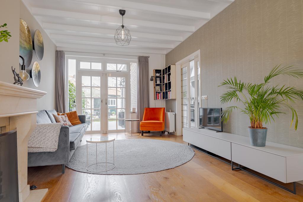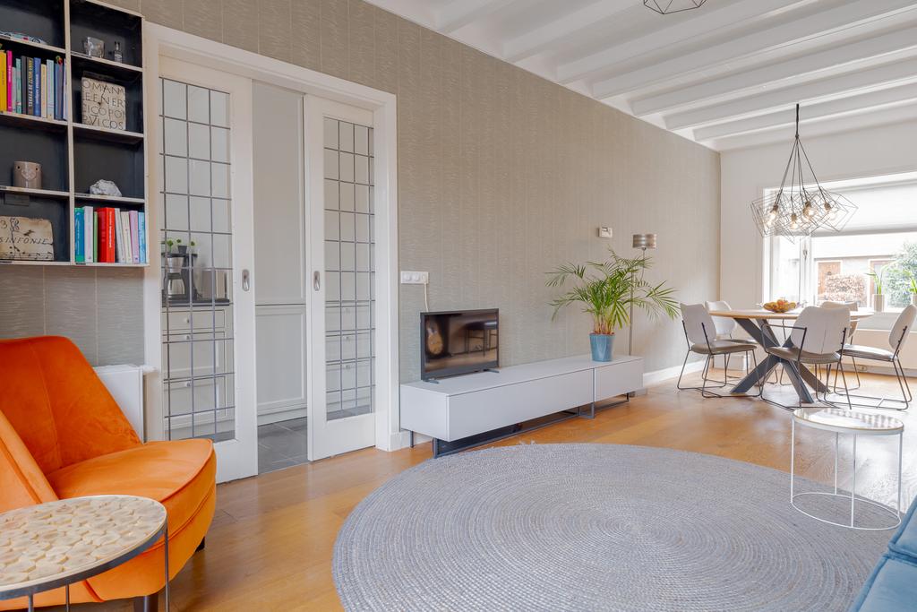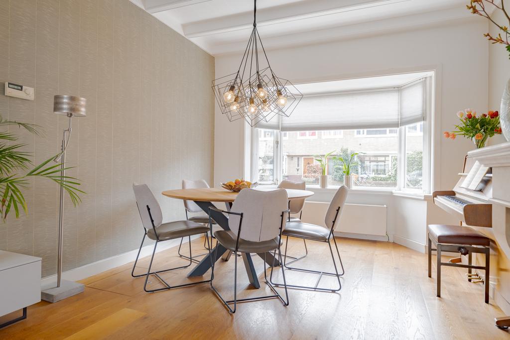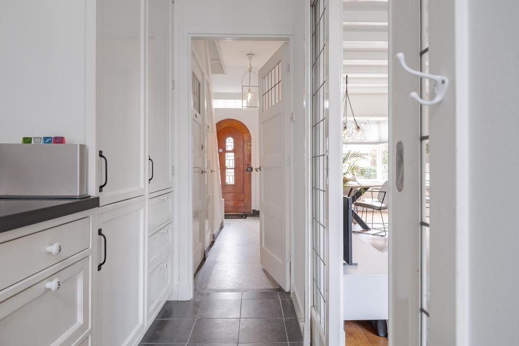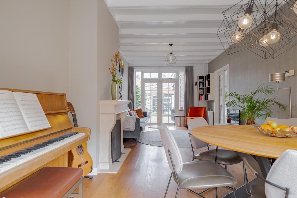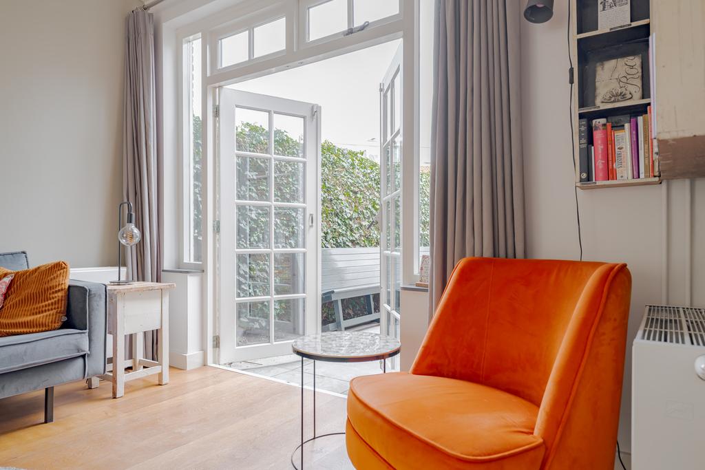 Dan de woning… De ruime voortuin zorgt voor privacy en geeft tegelijkertijd ruimte voor fietsen ofwel een leuke zitplek! Zowel aan de buiten- als aan de binnenzijde zijn de karakteristieke details goed bewaard gebleven. De terrazzo vloer in de hal is uitnodigend en kenmerkend voor deze jaren ’30 woning. De woonkamer is al even sfeervol met aan de voorzijde een prachtige erker, zichtbaar balkenplafond en eikenhouten vloer. Het zitgedeelte is aan de achterzijde gelegen, via de openslaande deuren heeft u van hieruit toegang tot de tuin.