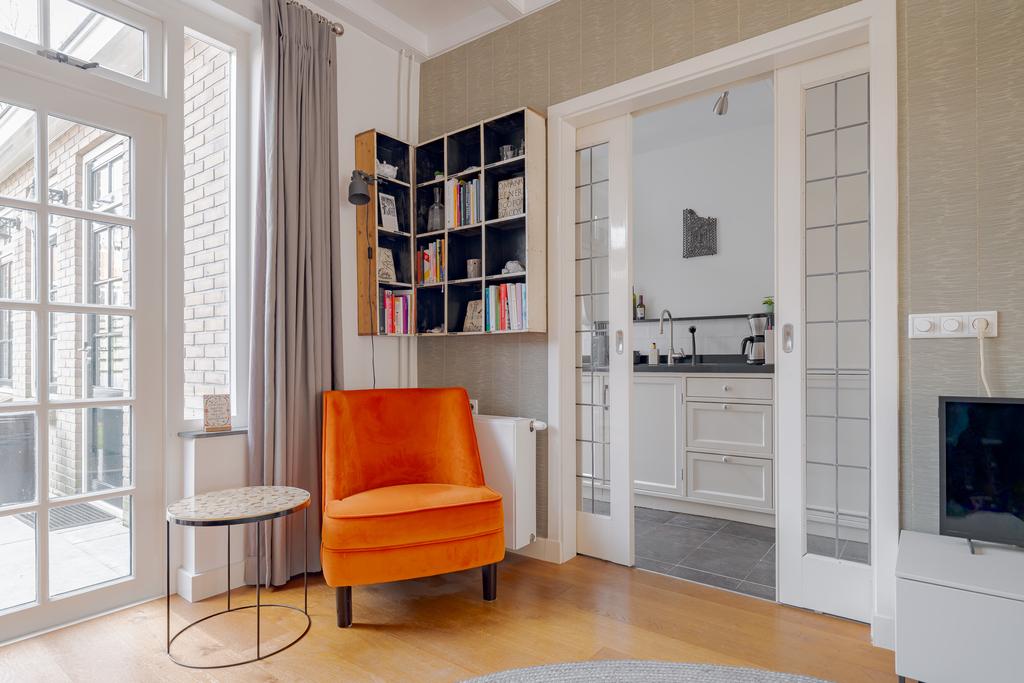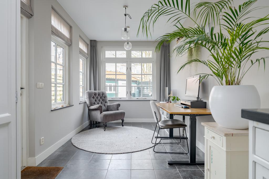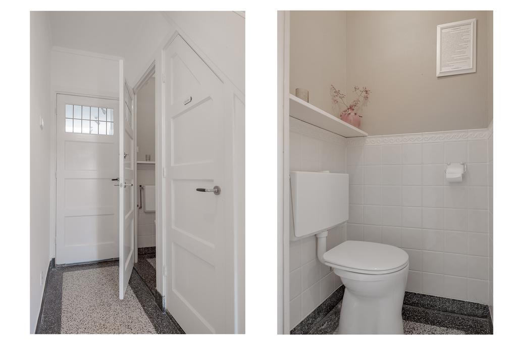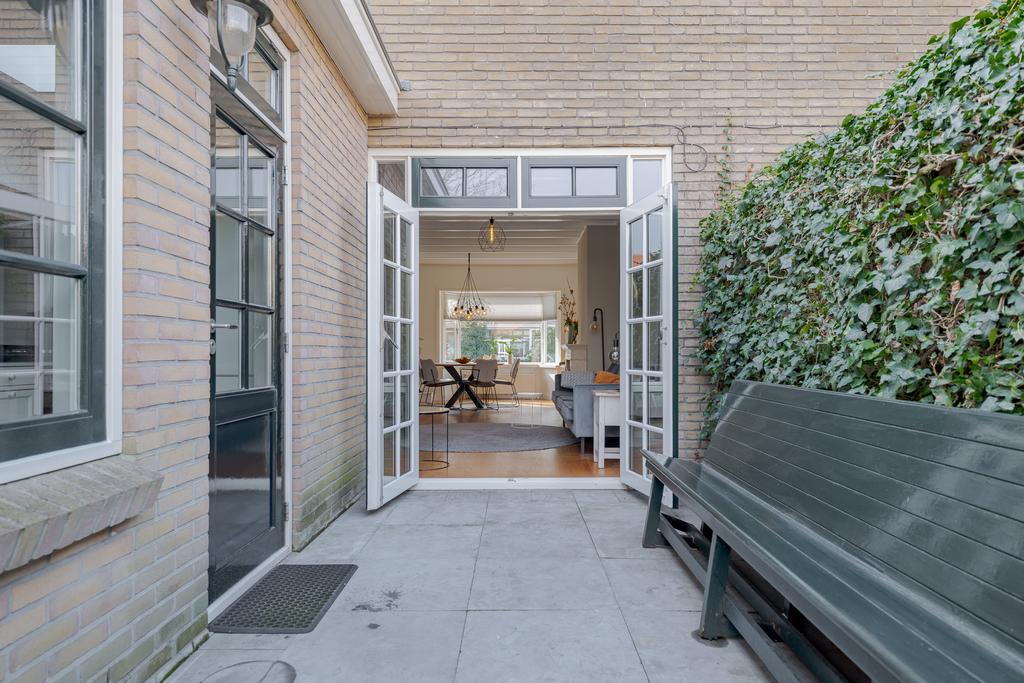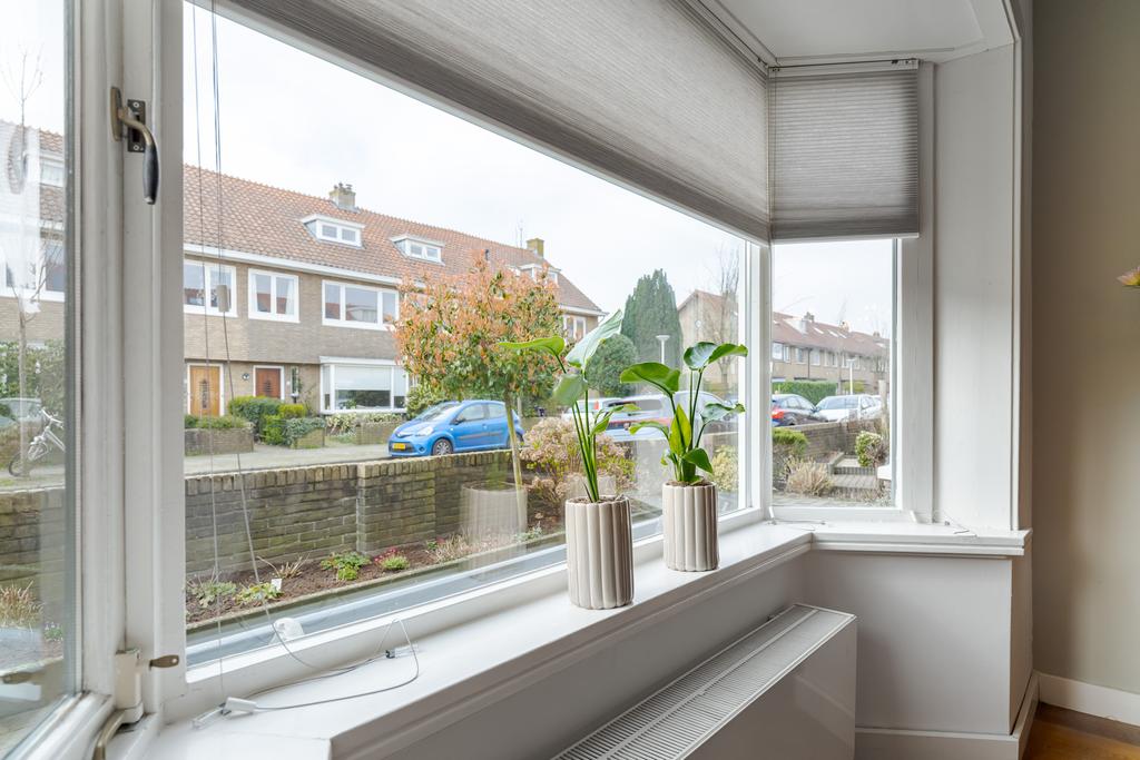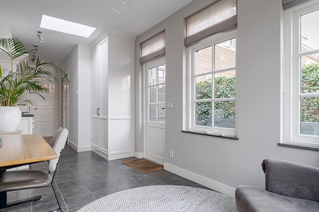 Dan de woning… De ruime voortuin zorgt voor privacy en geeft tegelijkertijd ruimte voor fietsen ofwel een leuke zitplek! Zowel aan de buiten- als aan de binnenzijde zijn de karakteristieke details goed bewaard gebleven. De terrazzo vloer in de hal is uitnodigend en kenmerkend voor deze jaren ’30 woning. De woonkamer is al even sfeervol met aan de voorzijde een prachtige erker, zichtbaar balkenplafond en eikenhouten vloer. Het zitgedeelte is aan de achterzijde gelegen, via de openslaande deuren heeft u van hieruit toegang tot de tuin.