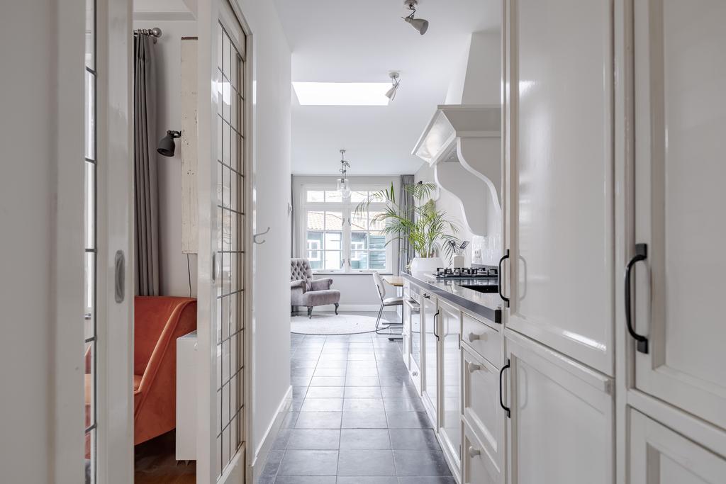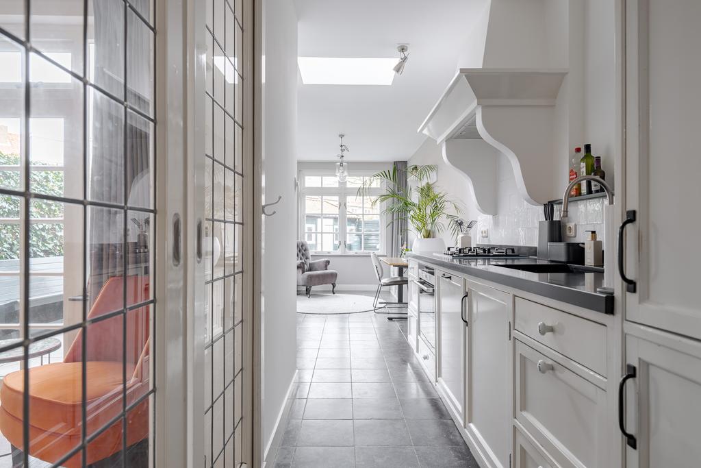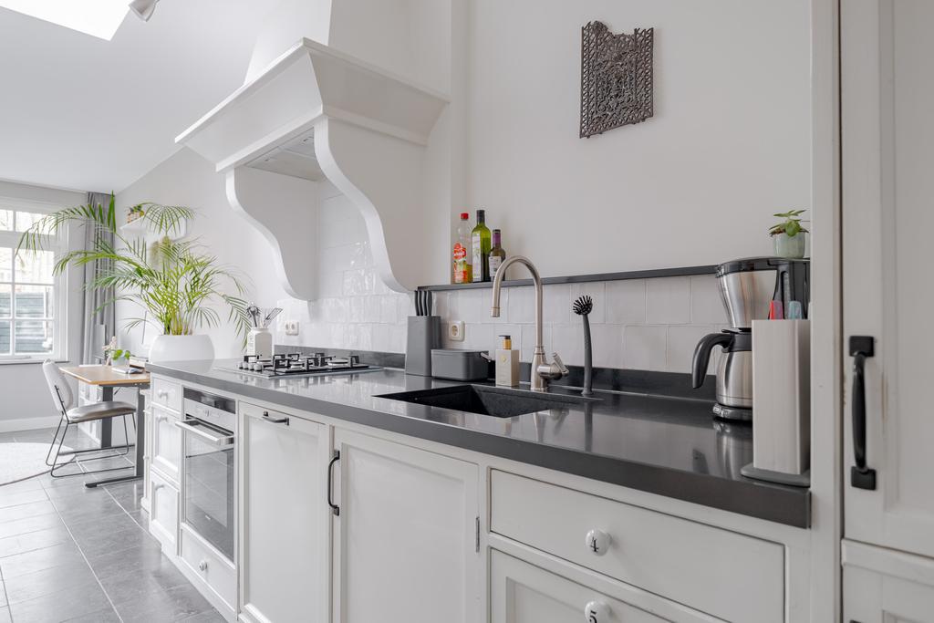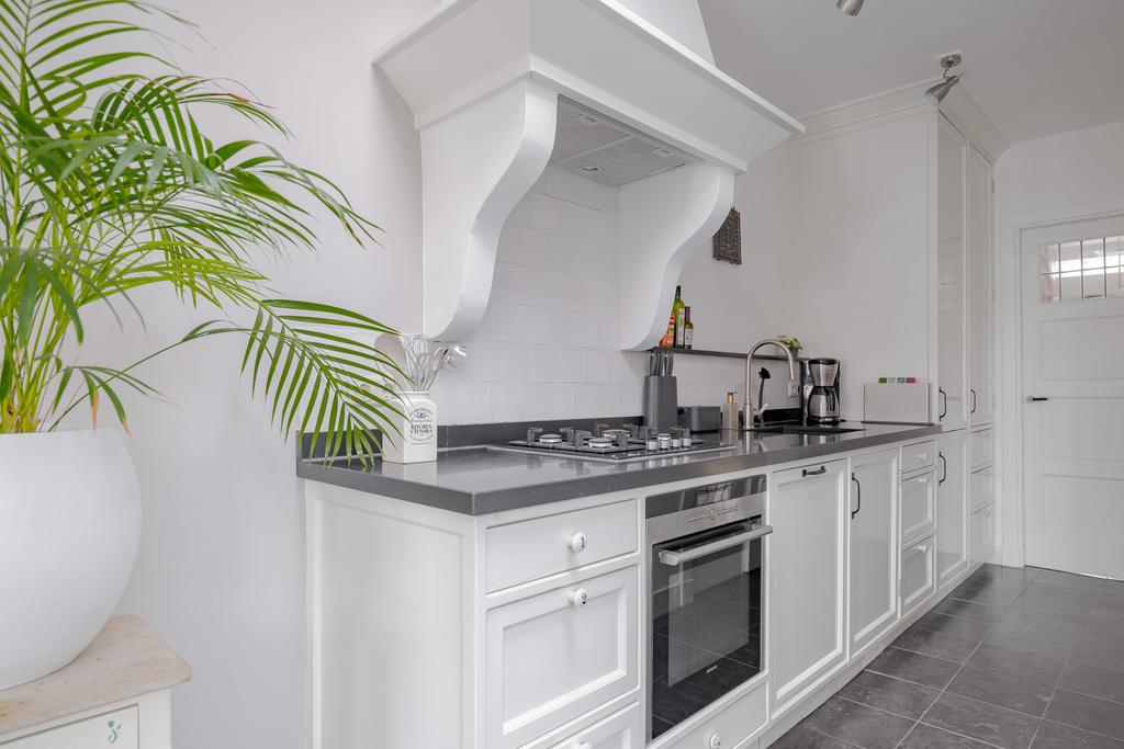 De woning is aan de achterzijde uitgebouwd, hier bevindt zich de keuken en is ruimte voor een eethoek of thuiswerkplek. De keukenopstelling, met bijpassende (provisie)kasten, is op maat gemaakt en extra hoog en diep. Dit zorgt voor een optimaal gebruik van de ruimte én voor veel werk- en kastruimte! De klassieke kasten met het natuurstenen blad geven een landelijke en rustige uitstraling. Achterin de keuken is een heerlijke zit-/werkplek gecreëerd, een ideale plek om een boek te lezen of te kletsen tijdens het koken! Ook kan dit een gezellige eethoek zijn. De aanbouw is voorzien van comfortabele vloerverwarming.