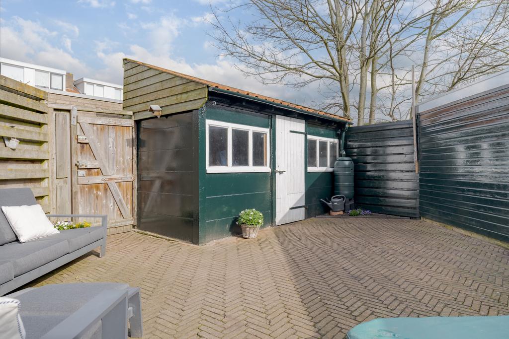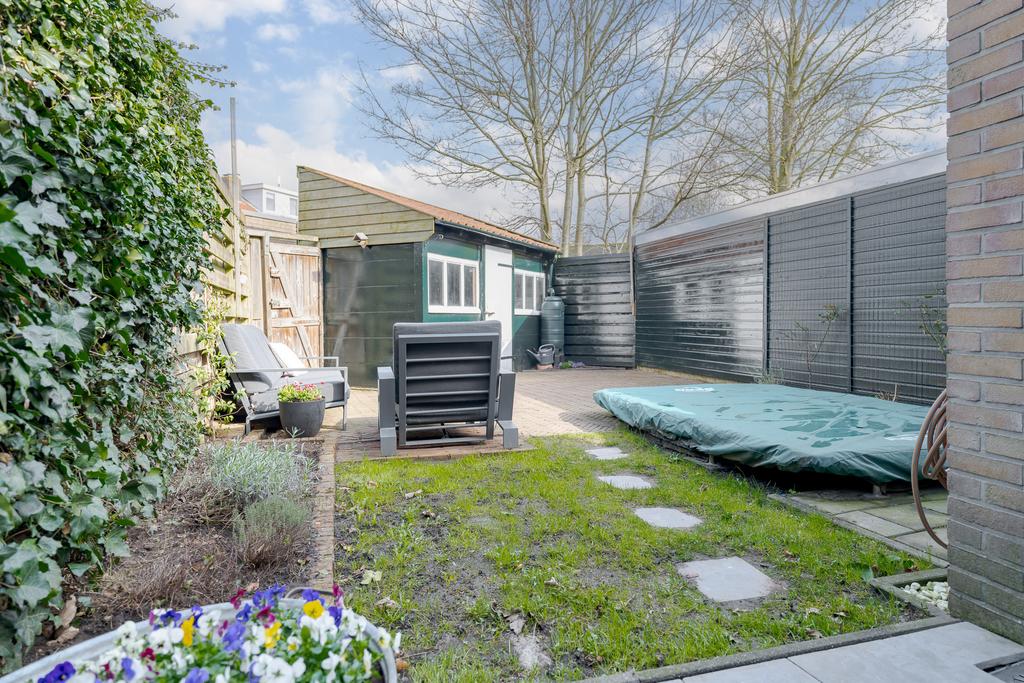 De diepe tuin met achterom is onderhoudsvriendelijk aangelegd met zowel aan de achterzijde als aan de zijkant van de woning een fijn terras, gescheiden door gras. De plantenborders en klimophaag zorgen voor een groene uitstraling. Achterin de tuin bevindt zich een ruime, stenen berging. Ideaal voor (elektrische) fietsen en tuingereedschap.