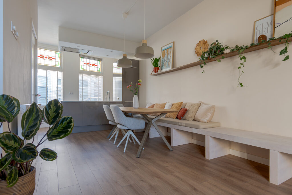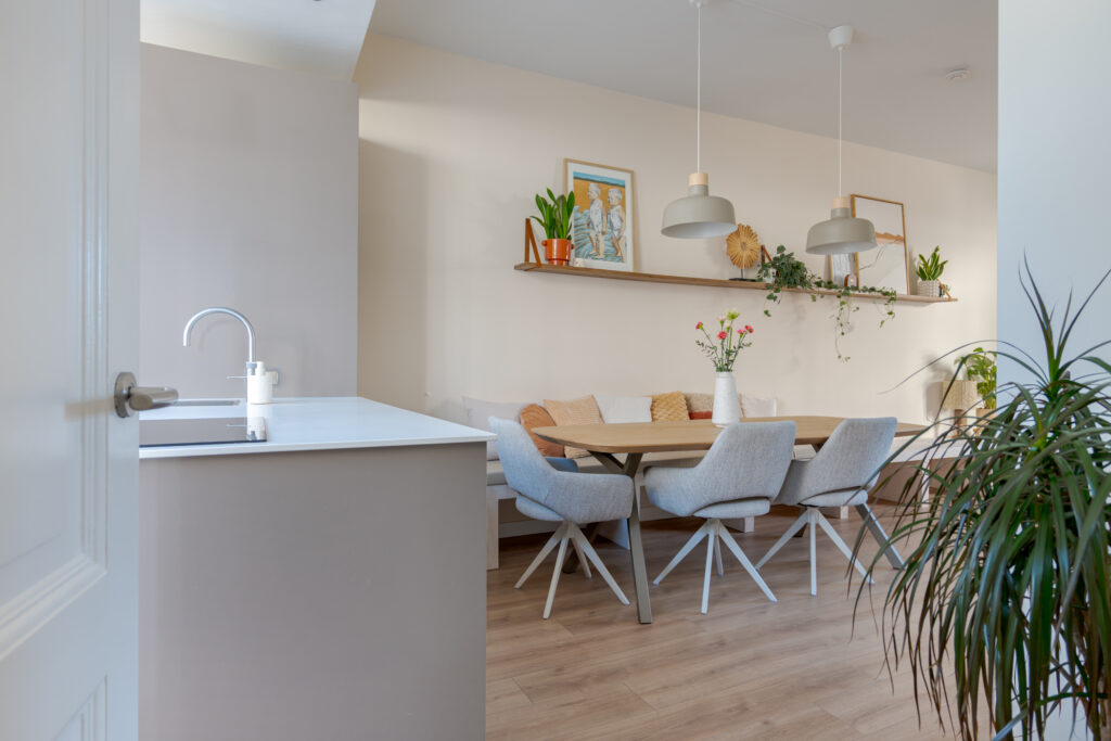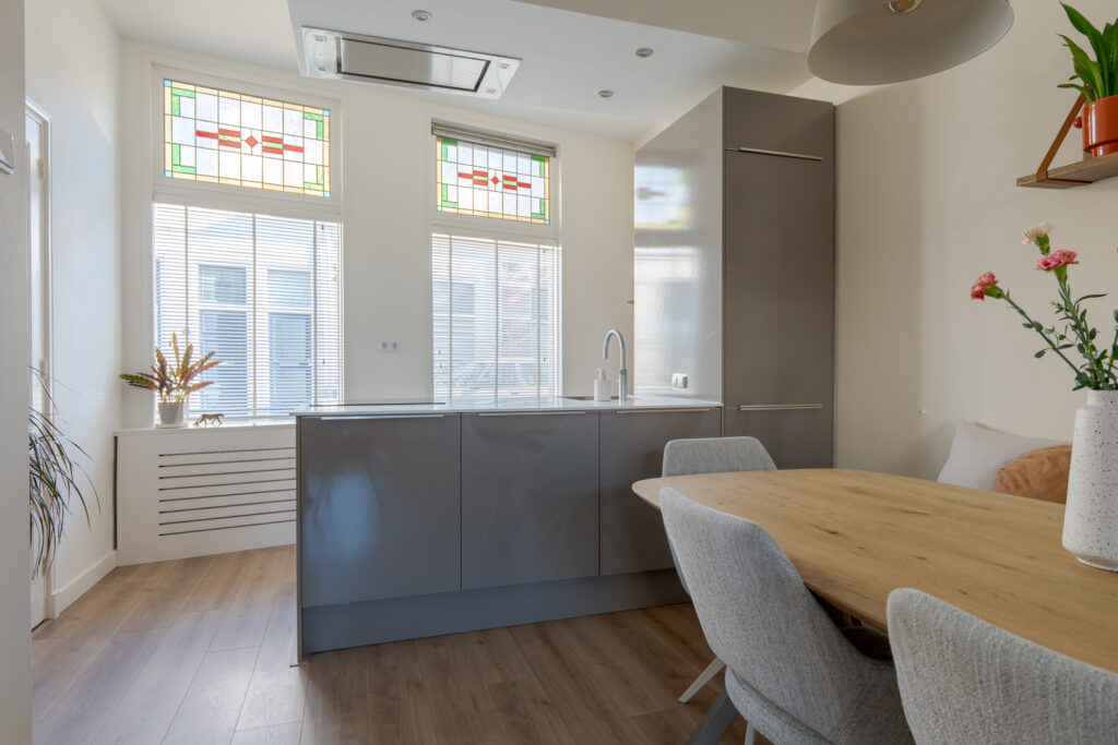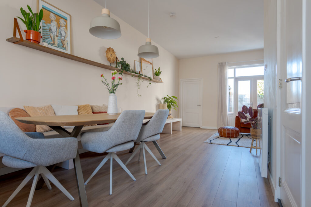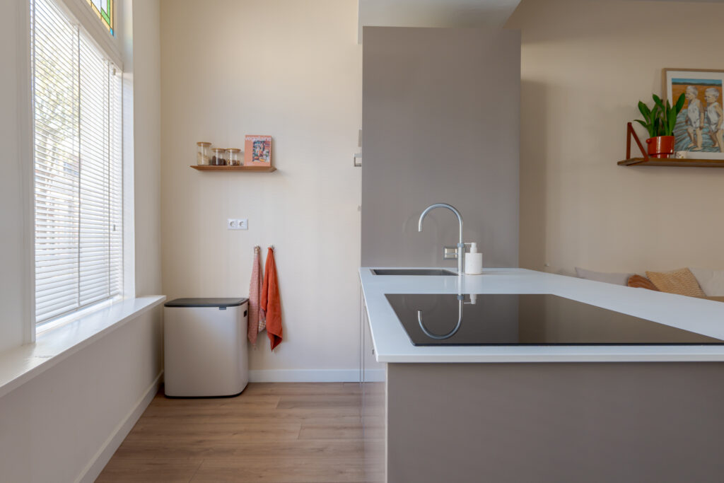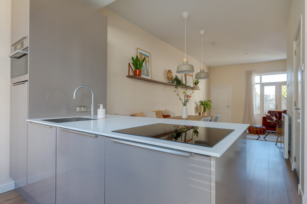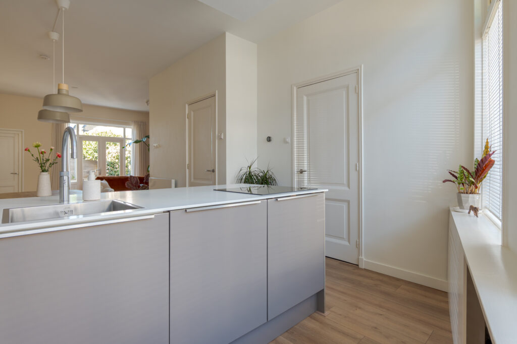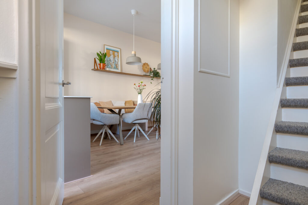 Via de entree komt u in het halletje met trapopgang, waarna u doorloopt naar de moderne keuken met kookeiland en diverse inbouwapparatuur, waaronder een inductiekookplaat, combi-oven, koelkast, vaatwasser en Quooker. Aansluitend bevindt zich de eethoek, een fijne plek om samen te komen voor een maaltijd of een kop koffie in de ochtend.