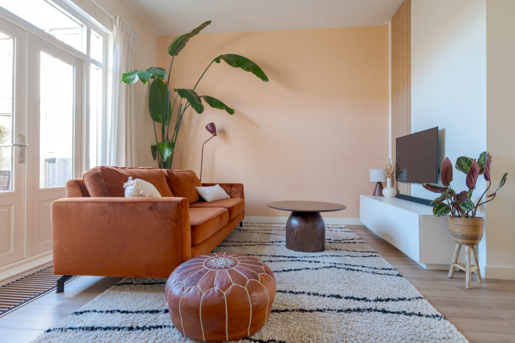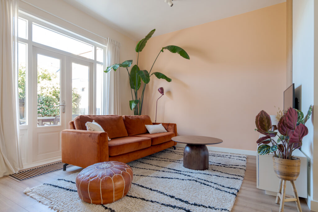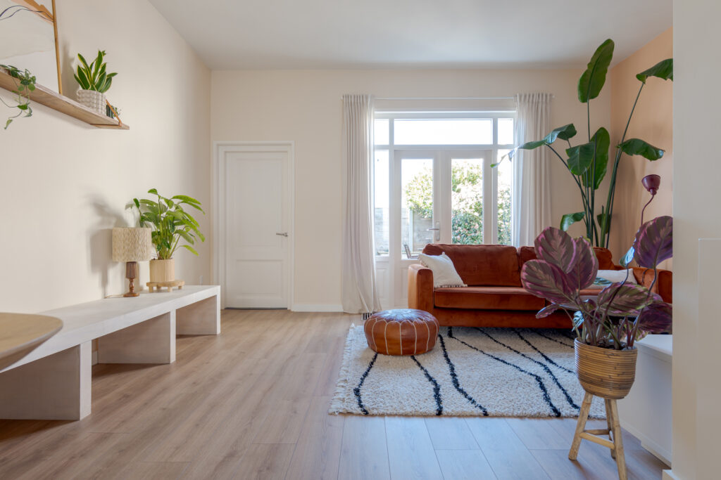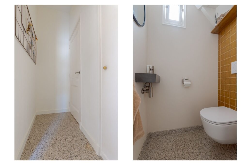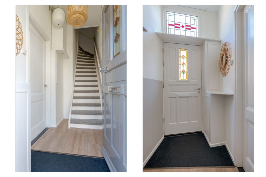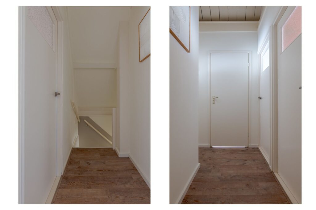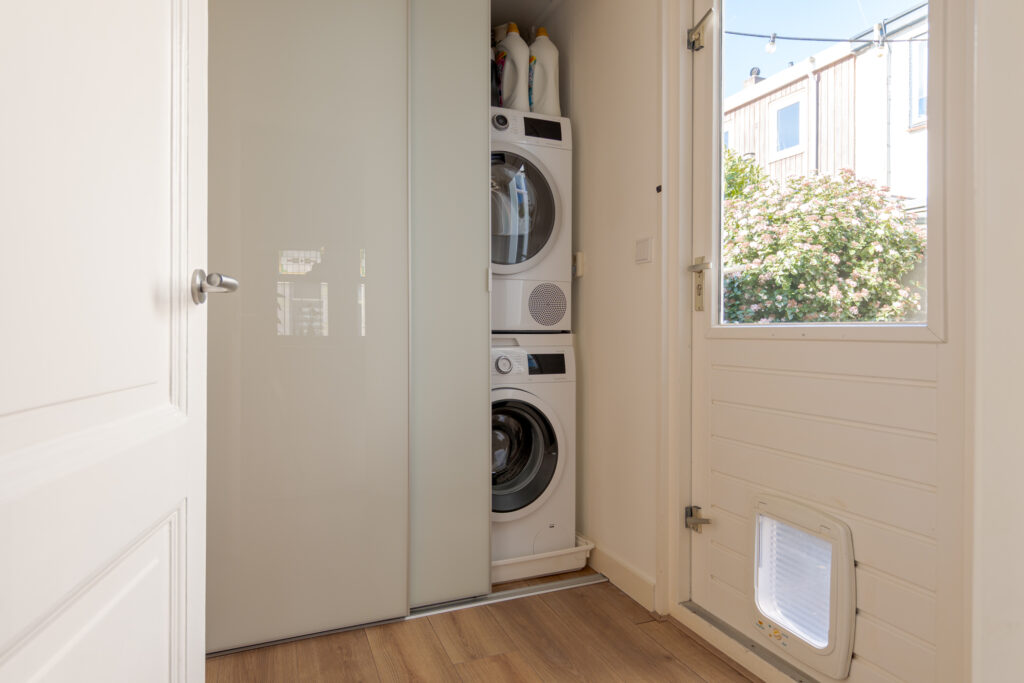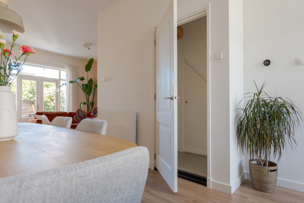 Aan de achterzijde ligt het sfeervolle zitgedeelte met openslaande deuren naar de tuin. Dit zorgt niet alleen voor prettig daglicht, maar ook voor een fijne overgang naar buiten. In de tussenhal bevinden zich het toilet en een bergkast. Ook is er op de begane grond aan de achterzijde een bijkeuken/berging met wasmachineaansluiting aanwezig.