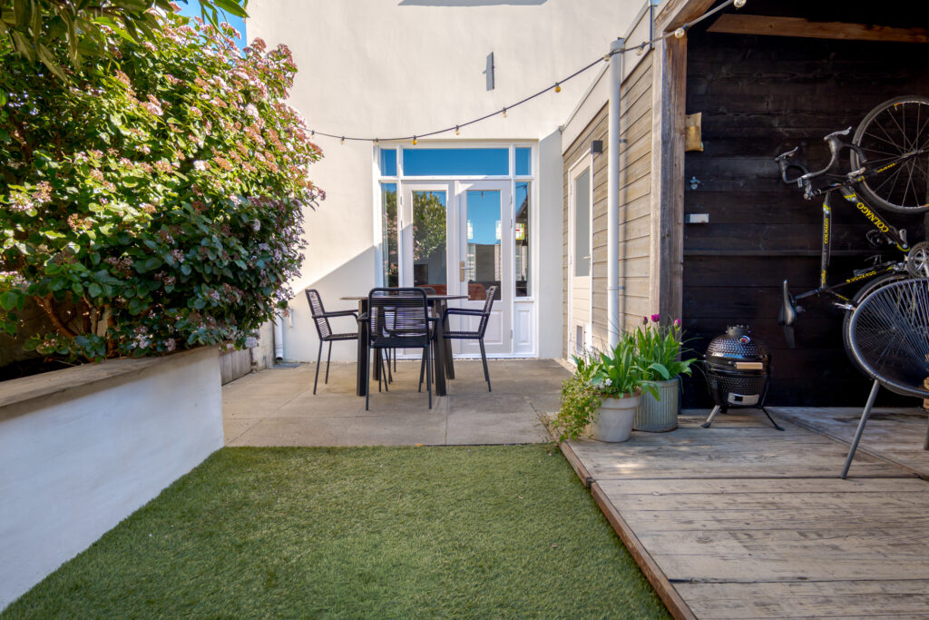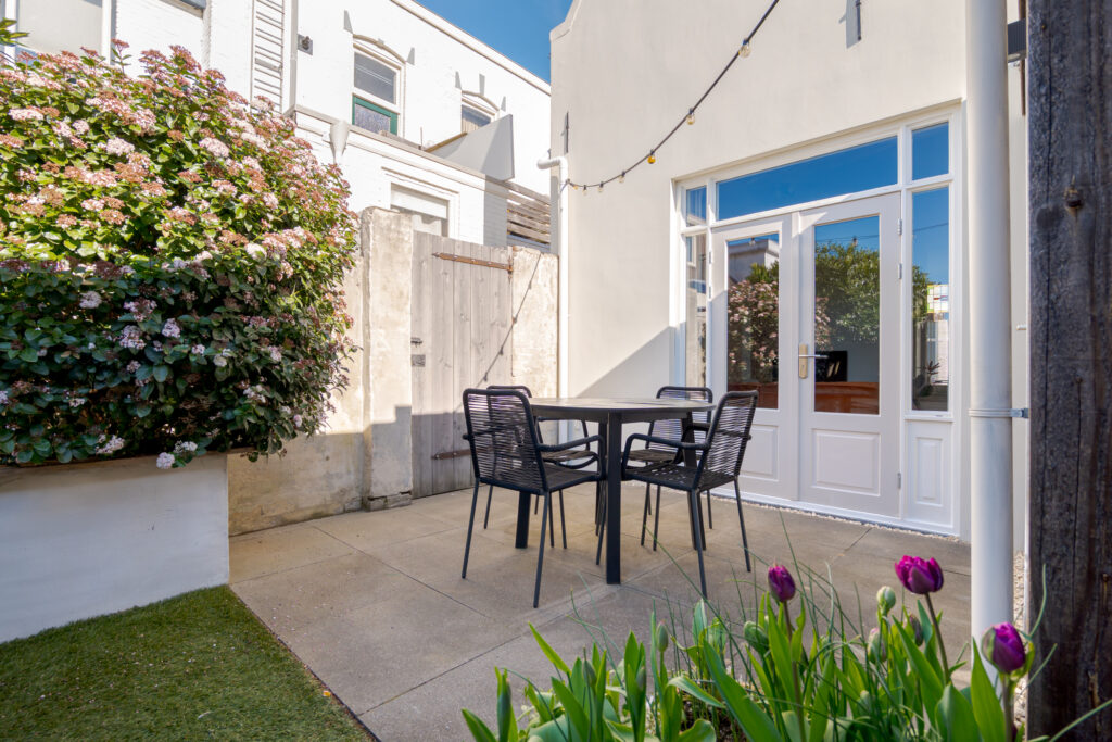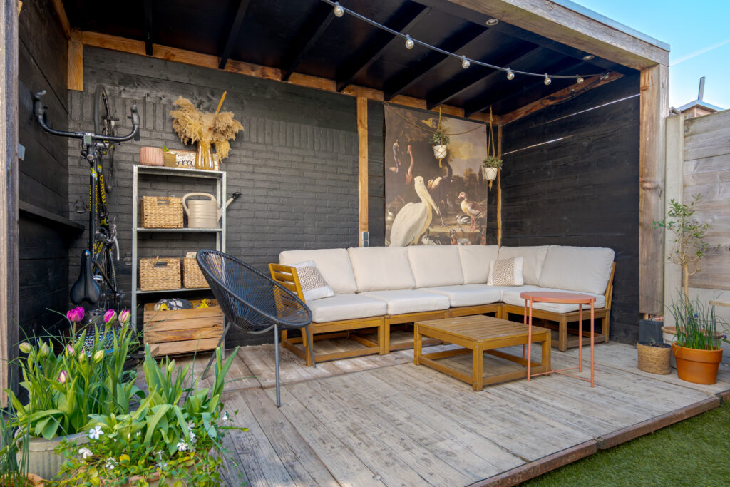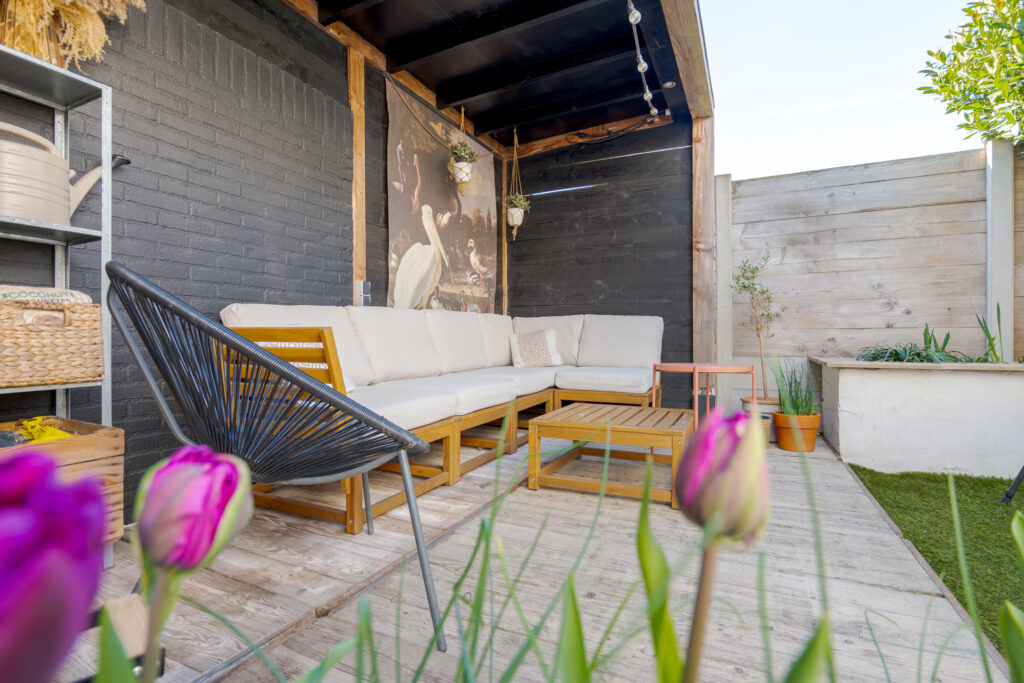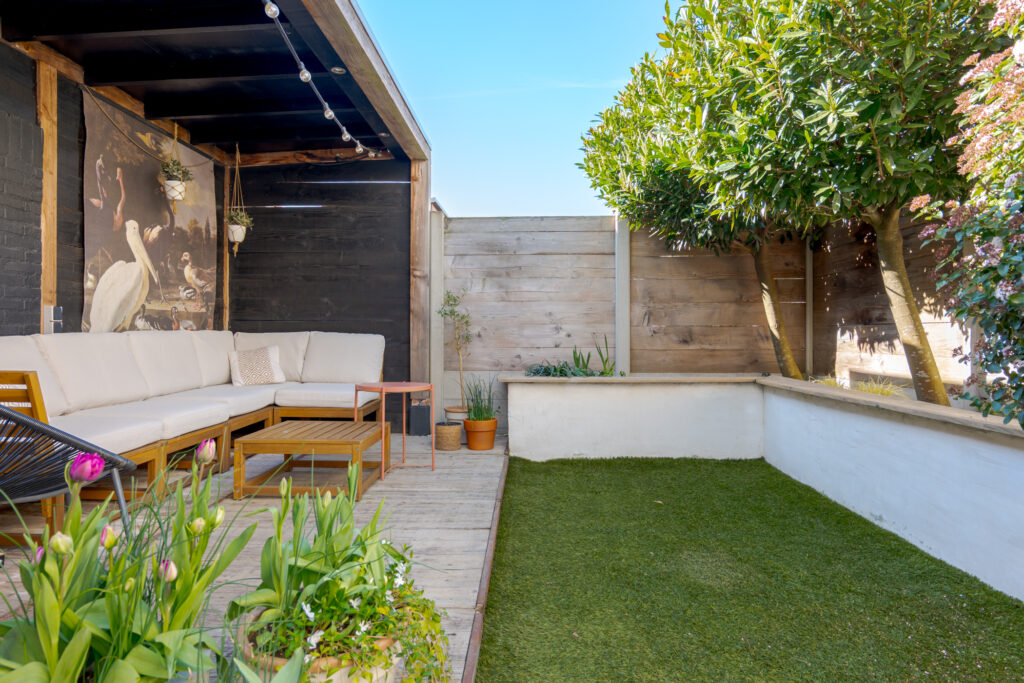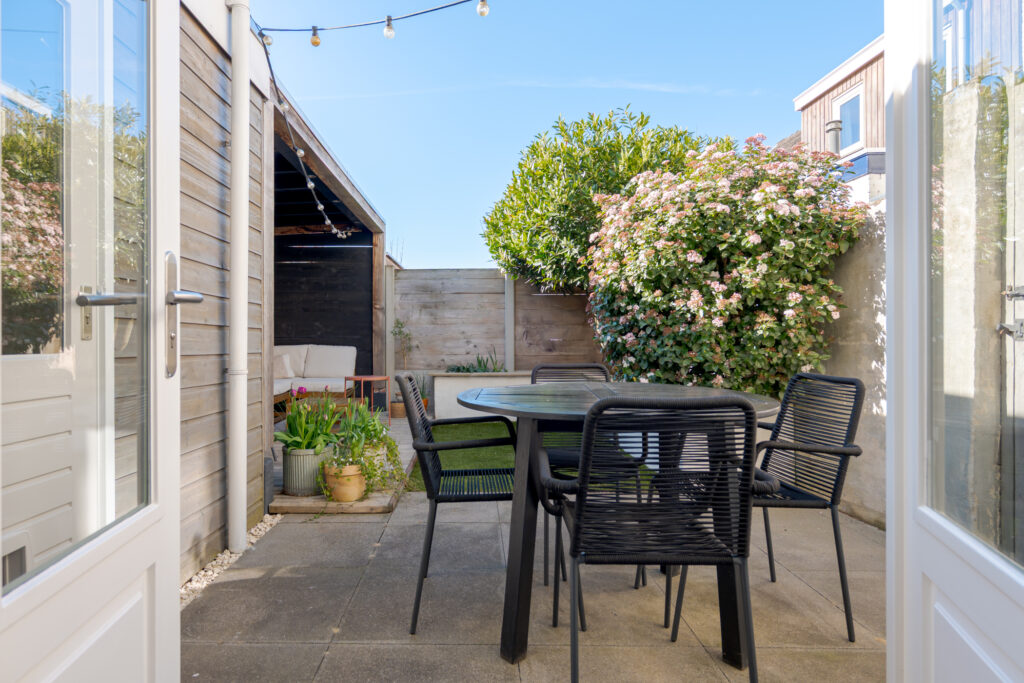 De gezellige achtertuin is verzorgd aangelegd met borders, een overdekt loungegedeelte en een achterom. Een fijne plek om in alle rust van het buitenleven te genieten.