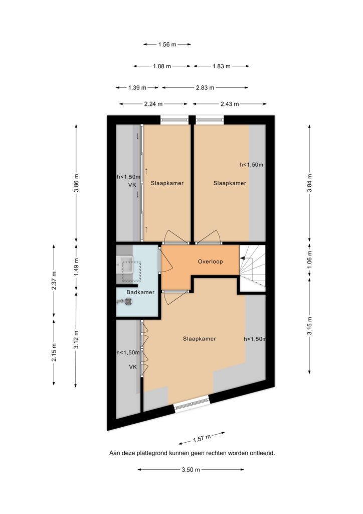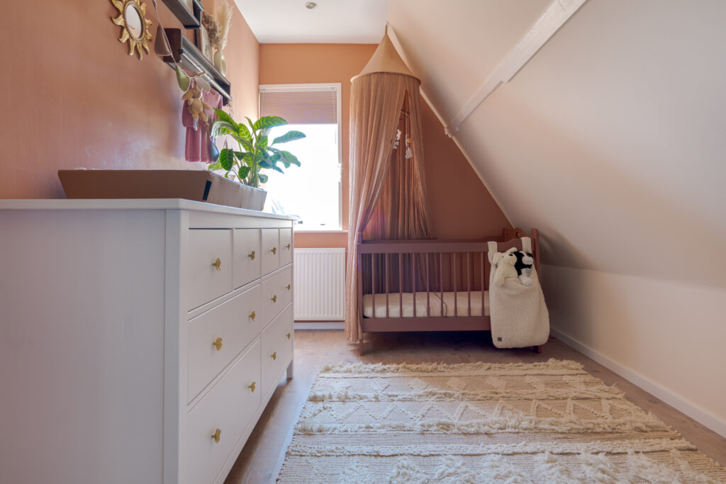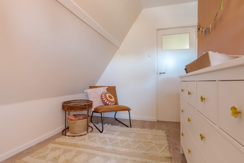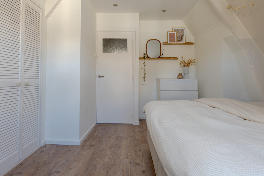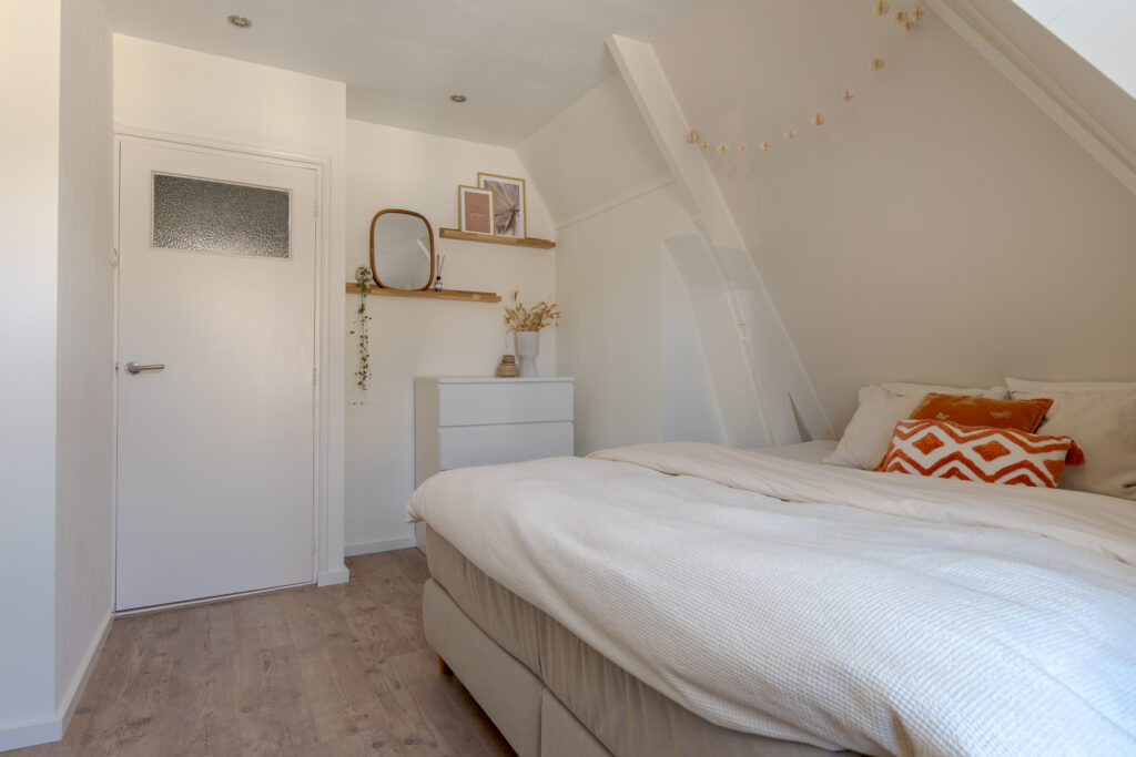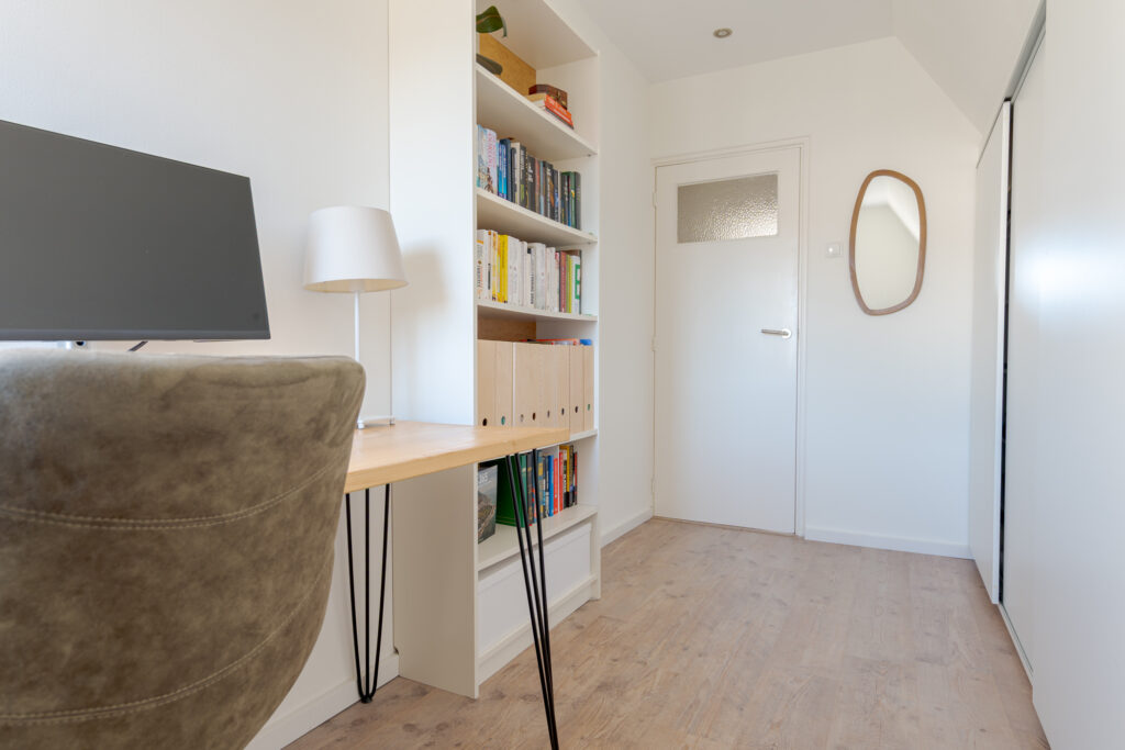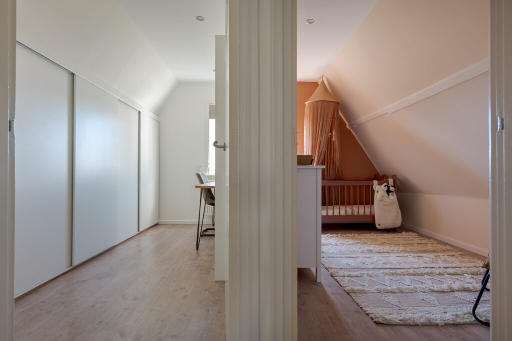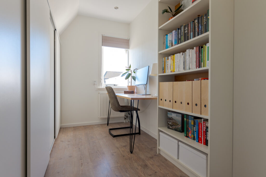 Op de eerste verdieping vindt u drie slaapkamers. De hoofdslaapkamer aan de voorzijde beschikt over vaste kasten en een dakkapel, wat deze kamer extra sfeer en ruimte geeft. Aan de achterzijde liggen nog twee kamers, waarvan één momenteel in gebruik is als kantoor met een lange vaste kastenwand. Ook is er nog een kleine bergruimte/vliering aanwezig.
