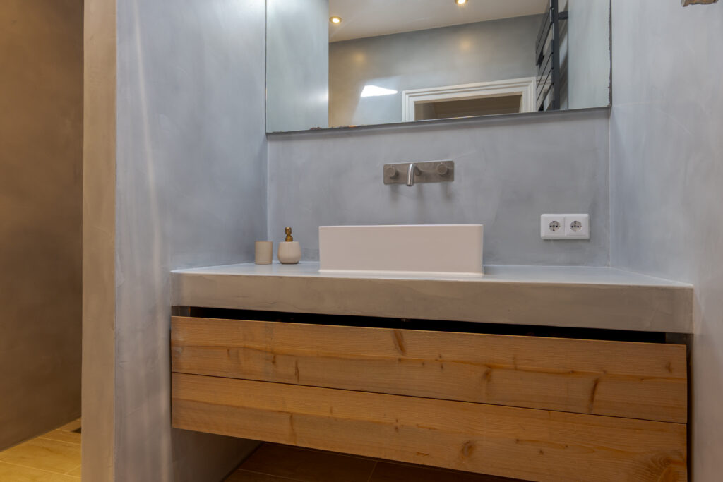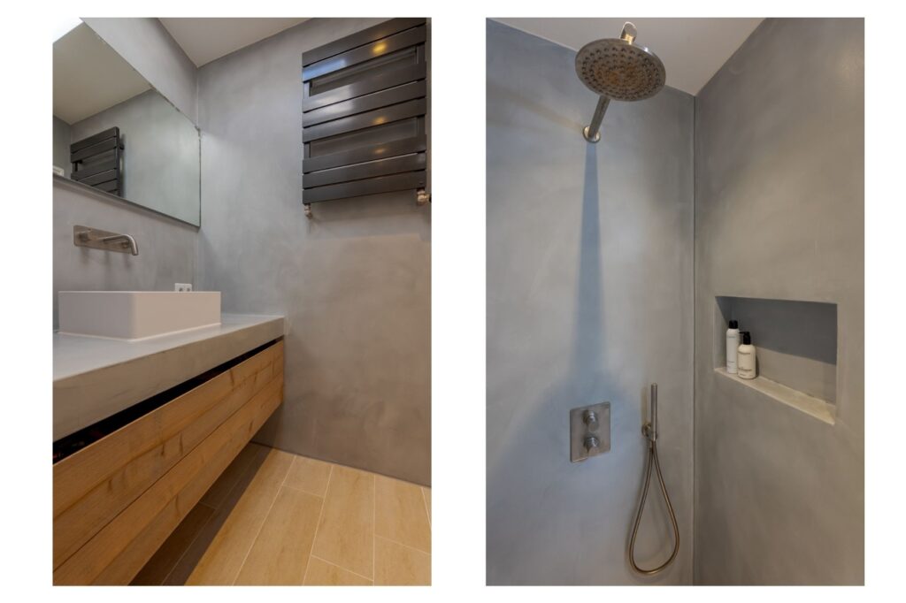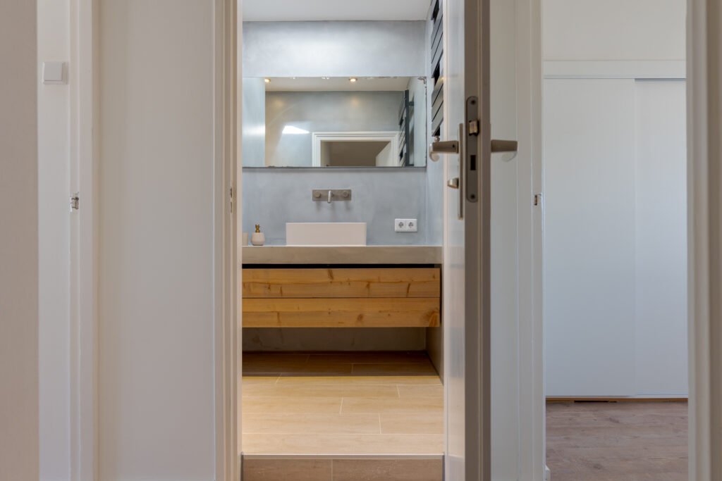 De badkamer is modern afgewerkt in betonlook en voorzien van een inloopdouche, spiegel met spiegelverwarming en een strak wastafelmeubel. De lichtkoepel zorgt hier voor een prettige lichtinval en natuurlijke ventilatie.