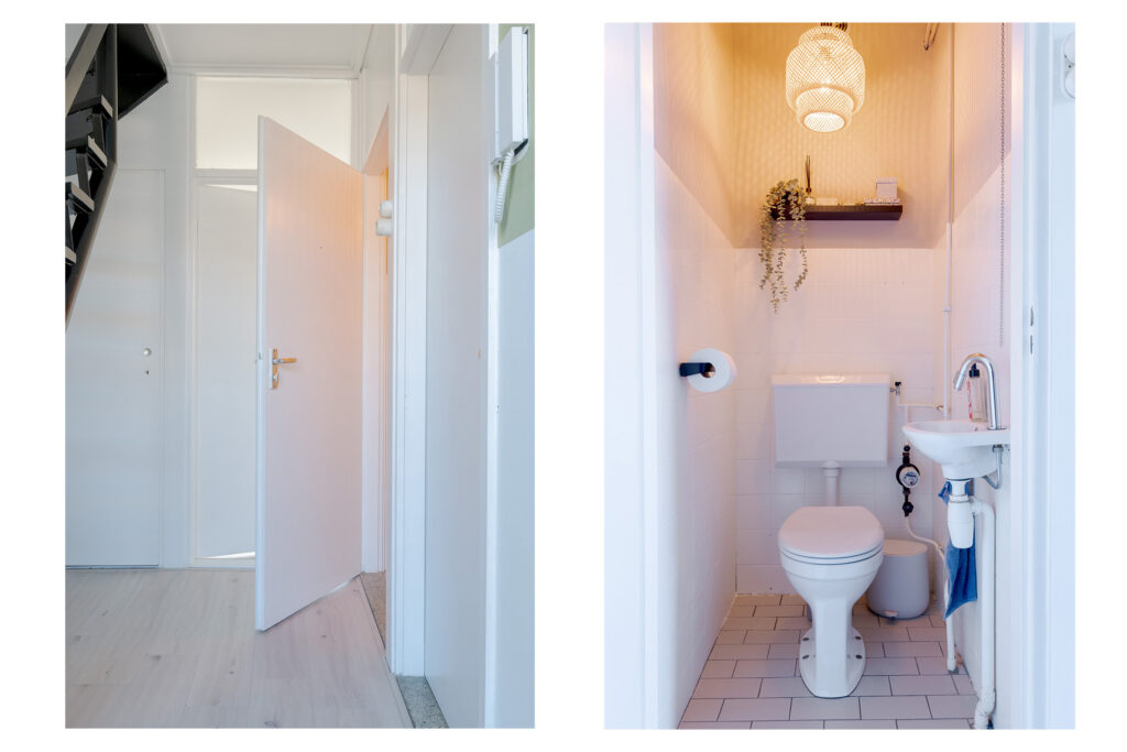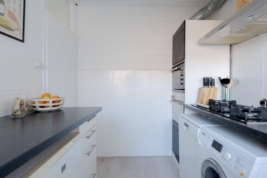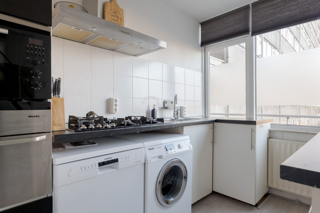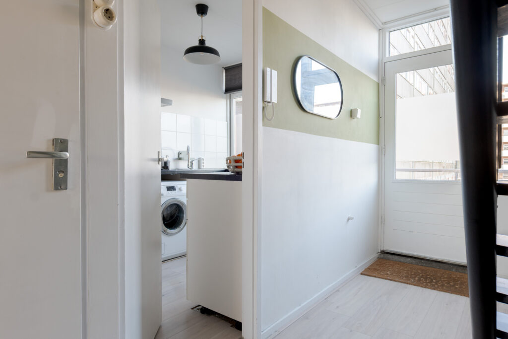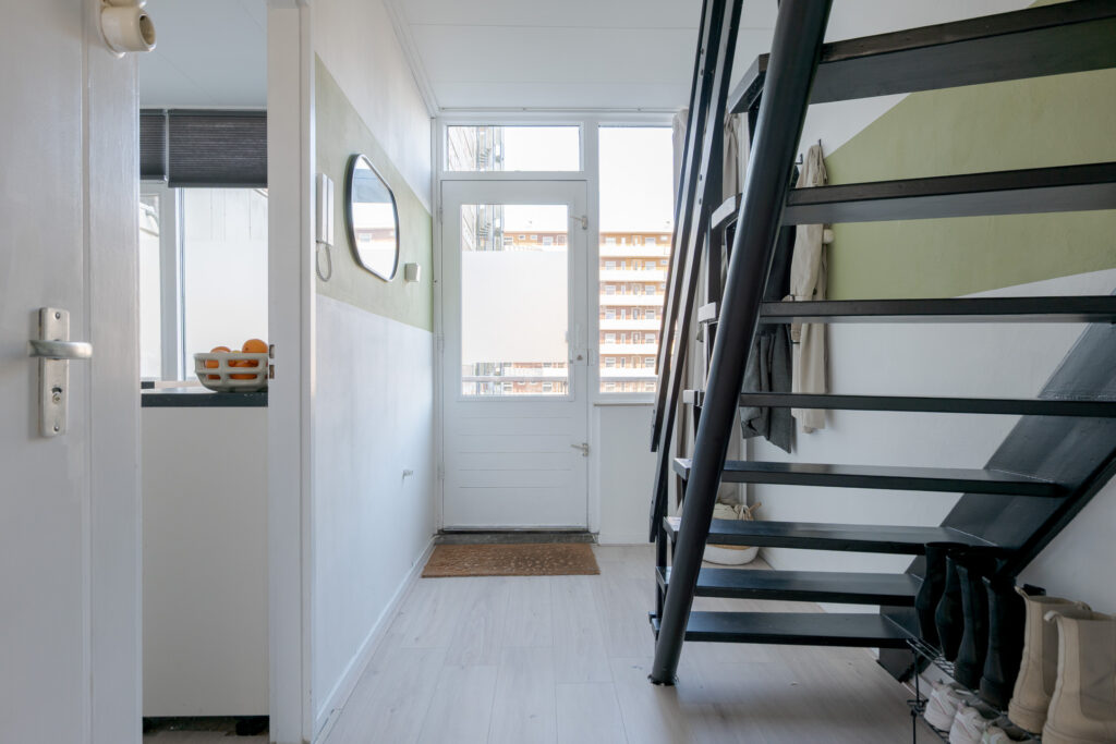 Via de galerij op de tweede woonlaag van het gebouw komt u binnen in de hal van het appartement, vanuit hier heeft u toegang tot de dichte keuken, aan de galerij gelegen, het toilet, trapopgang naar de verdieping en de woonkamer met toegang tot het balkon op het oosten. Perfect voor een kopje koffie in de ochtend! De woonkamer is ruim van opzet en de grote raampartijen zorgen voor een prettige lichtinval.