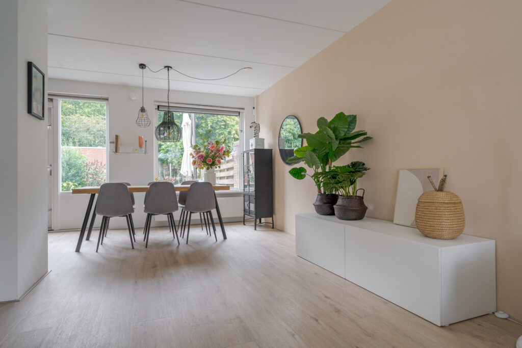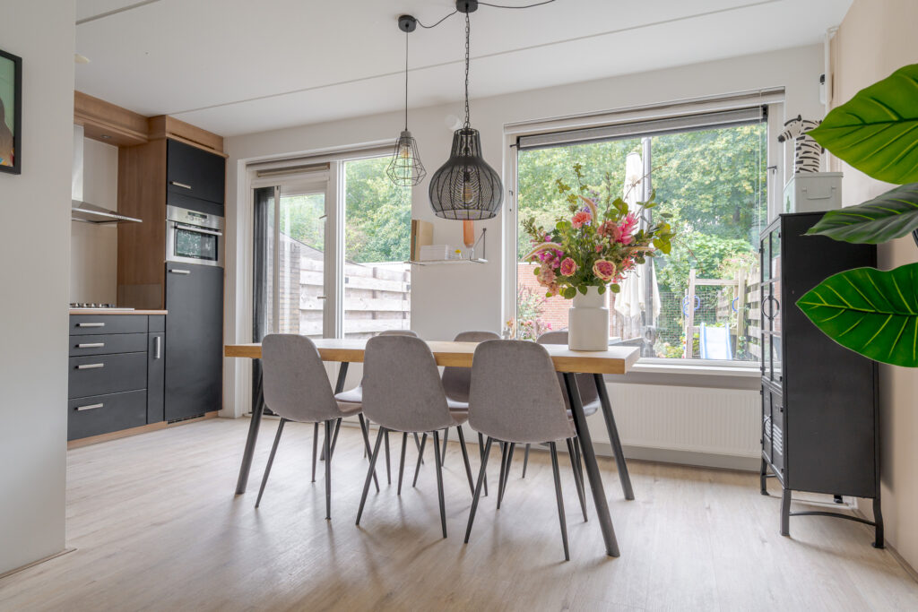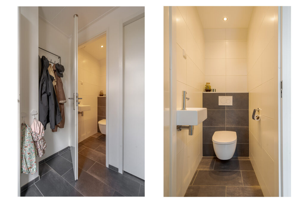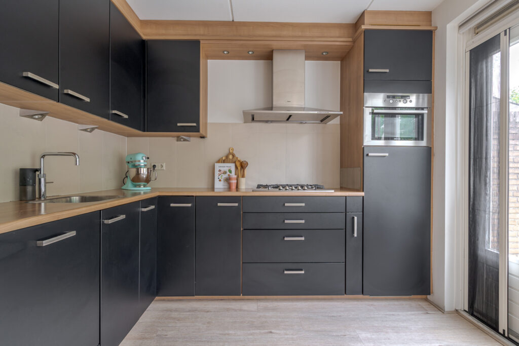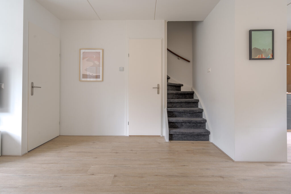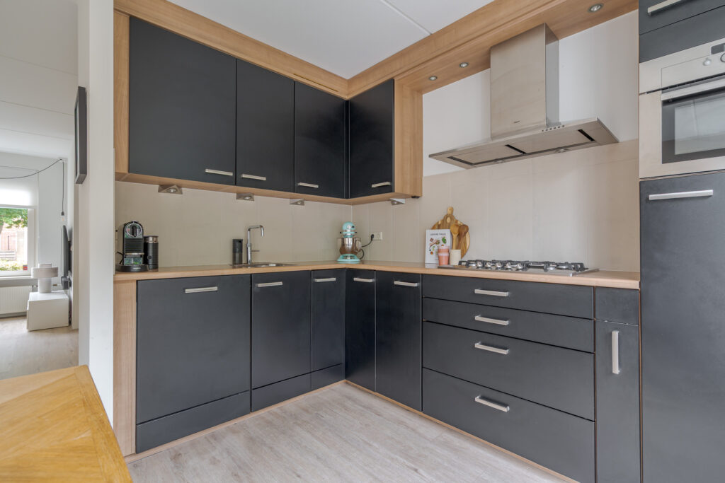Via de voortuin bereikt u de entree met meterkast, hal en een modern toilet. De lichte en open woonkamer biedt volop leefruimte en beschikt over een provisiekast onder de trap. Aan de achterzijde bevindt zich de keuken, uitgevoerd in een moderne stijl met zwarte fronten en houten accenten. De keuken is voorzien van diverse inbouwapparatuur en biedt via een openslaande deur direct toegang tot de tuin. Grote raampartijen zorgen voor een aangename lichtinval en een fijn uitzicht op het groen.